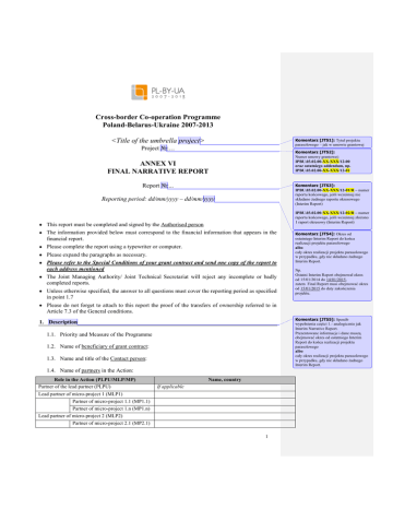 Cross-border Co-operation Programme Poland-Belarus-Ukraine 2007-2013 Komentarz [JTS1]: Tytuł projektu parasolowego – jak w umowie grantowej <Title of the umbrella project> Project №:… Komentarz [JTS2]: Numer umowy grantowej: IPBU.03.02.00-XX-XXX/12-00 oraz ostatniego addendum, np. IPBU.03.02.00-XX-XXX/12-01 ANNEX VI FINAL NARRATIVE REPORT Report №:... Komentarz [JTS3]: IPBU.03.02.00-XX-XXX/12-01/R – numer raportu końcowego, jeśli wcześniej nie składano żadnego raportu okresowego (Interim Report) Reporting period: dd/mm/yyyy – dd/mm/yyyy IPBU.03.02.00-XX-XXX/12-02/R – numer raportu końcowego, jeśli wcześniej złożono 1 raport okresowy (Interim Report) This report must be completed and signed by the Authorised person The information provided below must correspond to the financial information that appears in the financial report. Please complete the report using a typewriter or computer. Please expand the paragraphs as necessary. Please refer to the Special Conditions of your grant contract and send one copy of the report to each address mentioned The Joint Managing Authority/ Joint Technical Secretariat will reject any incomplete or badly completed reports. Unless otherwise specified, the answer to all questions must cover the reporting period as specified in point 1.7 Komentarz [JTS4]: Okres od ostatniego Interim Report do końca realizacji projektu parasolowego albo cały okres realizacji projektu parasolowego w przypadku, gdy nie składano żadnego Interim Report. Np. Ostatni Interim Report obejmował okres od 15/01/2014 do 14/01/2015, zatem Final Report musi obejmować okres od 15/01/2015 do daty zakończenia projektu. Please do not forget to attach to this report the proof of the transfers of ownership referred to in Article 7.3 of the General conditions. Komentarz [JTS5]: Sposób wypełnienia części 1.- analogicznie jak Interim Narrative Report. Prezentowane informacje i dane muszą obejmować okres od ostatniego Interim Report do końca realizacji projektu parasolowego albo cały okres realizacji projektu parasolowego w przypadku, gdy nie składano żadnego Interim Report. 1. Description 1.1. Priority and Measure of the Programme 1.2. Name of beneficiary of grant contract: 1.3. Name and title of the Contact person: 1.4. Name of partners in the Action: Role in the Action (PLPU/MLP/MP) Partner of the lead partner (PLPU) Name, country If applicable Lead partner of micro-project 1 (MLP1) Partner of micro-project 1.1 (MP1.1) Partner of micro-project 1.n (MP1.n) Lead partner of micro-project 2 (MLP2) Partner of micro-project 2.1 (MP2.1) 1 Partner of micro-project 2n (MP2.n) Lead partner of micro-project 3 (MLP.3) Partner of micro-project 3.1 (MP3.1) Partner of micro-project 3.n (MP3.n) Etc. 1.5. Title of the Action: 1.6. Contract number: 1.7. Start date and end date of the reporting period: 1.8. Target country(ies) or region(s): 1.9. Final beneficiaries &/or target groups1 (if different) (including numbers of women and men): 1.10. Country(ies) in which the activities take place (if different from 1.8): 2. Assessment of implementation of Action activities Komentarz [JTS6]: Sposób wypełnienia - analogicznie jak Interim Narrative Report. 2.1. Executive summary of the Action Please give a global overview of the Action’s implementation for the whole of the project 2.2. Activities and results Please list all the activities in line with Annex 1 of the contract since the last interim report if any or during the reporting period indicating the activity implementation level: micro-project (MP1, MP2...) or management (UP) level 2.2.1. Activity 1/Level of the activity implementation (MPn/UP): Title of the activity: Conference at town W with X participants for Y days on Z dates Topics/activities covered <please elaborate>: Reason for modification for the planned activity <please elaborate on the problems including delay, cancellation, postponement of activities- which have arisen and how they have been addressed> (if applicable): Results of this activity <please quantify these results, where possible; refer to the various assumptions of the Logframe>: 2.2.2. Activity 2/Level of the activity implementation (MPn/UP): Title of the activity: Conference at town W with X participants for Y days on Z dates Topics/activities covered <please elaborate>: 1 “Target groups” are the groups/entities who will be directly positively affected by the Action at the Action Purpose level, and “final beneficiaries” are those who will benefit from the Action in the long term at the level of the society or sector at large. 2 Komentarz [JTS7]: Sposób wypełnienia - analogicznie jak Interim Narrative Report. Prezentowane informacje i dane muszą obejmować cały okres objęty raportem. Reason for modification for the planned activity <please elaborate on the problems including delay, cancellation, postponement of activities- which have arisen and how they have been addressed> (if applicable): Results of this activity <please quantify these results, where possible; refer to the various assumptions of the Logframe>: Please give your assessment of the results of above activities: 2.3. Activities that have not taken place indicating the activity implementation level: microproject (MP1, MP2...) or management (UP) level. Please outline any activity and/or publications foreseen in the contract, that have not taken place, explaining the reason for these. 2.4. What is your assessment of the results of the Action? Include observations on the extent to which foreseen specific objective and overall objectives were met and whether the Action has had any unforeseen positive or negative results. (please quantify where possible; refer to Logframe Indicators). 2.5. What has been the outcome on both the final beneficiaries &/or target group (if different) and the situation in the target country or target region which the Action addressed? 2.6. Please list all materials, publications (and no. of copies) pro