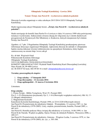 Olimpiada Teologii Katolickiej - Łowicz 2016 Temat: Święty Jan Paweł II - wychowawca młodych pokoleń Diecezja Łowicka organizuje w roku szkolnym 2015/2016 XXVI Olimpiadę Teologii Katolickiej. Hasło tegorocznej edycji Olimpiady brzmi: „Święty Jan Paweł II – wychowawca młodych pokoleń”. Hasło nawiązuje do homilii Jana Pawła II w Łowiczu w dniu 14 czerwca 1999 roku poświęconej tematyce wychowania. Jednocześnie stwarza okazję do włączenia się w dzieło duchowych przygotowań do Światowych Dni Młodzieży w Krakowie, których inicjatorem był właśnie Święty Jan Paweł II. Zgodnie z § 7 pkt. 2 Regulaminu Olimpiady Teologii Katolickiej przekazujemy pierwsze informacje dotyczące organizacji Olimpiady. Zgłoszenia diecezji do udziału w olimpiadzie będzie można dokonać również elektronicznie na specjalnym formularzu, który będzie zamieszczony na stronie http://www.otk.pl Ks. dr hab. Wojciech Osial Pełnomocnik Komitetu Głównego Olimpiady Teologii Katolickiej XXVI OLIMPIADA TEOLOGII KATOLICKIEJ KOMITET ORGANIZACYJNY Wydział Nauki Katolickiej Kurii Diecezjalnej Łowickiej Stary Rynek 20, 99-400 Łowicz tel. 46 830 07 82 kom. 602 49 60 16 e-mail: [email protected] Terminy poszczególnych etapów: 1. Etap szkolny - 17 listopada 2015 2. Etap diecezjalny - 12 stycznia 2016 3. Etap ogólnopolski - 31 marca-2 kwietnia 2016 Literatura: Etap szkolny 1. Pismo Święte - Biblia Tysiąclecia, Wyd. IV, Poznań 2003. Pwt 5, 1-22 (Dziesięcioro przykazań); Syr 3, 1-16 (Obowiązki względem rodziców); Mk 10, 1722 (Bogaty młodzieniec). 2. Magisterium Kościoła Katechizm Kościoła Katolickiego, Poznań 1994, nr 2214-2220 (Obowiązki dzieci) Jan Paweł II, Przemówienie do młodzieży Gdańsk - Westerplatte, 12 czerwca 1987, w: Jan Paweł II do młodzieży (1978-2005). Listy, orędzia, przemówienia, homilie, Poznań 2005, s. 407-415. Jan Paweł II, Homilia podczas Mszy świętej dla młodzieży w Łowiczu, 14.06.1999, w: Jan Paweł II do Narodu. Wypłyń na głębię. Ojciec Święty do młodych Polaków, Warszawa 2006, s. 209-217. Jan Paweł II, Przemówienie do młodzieży, Gniezno - Wzgórze Lecha, 3 czerwca 1979, w: Jan Paweł II do młodzieży (1978-2005), dz. cyt., s. 385-388. Jan Paweł II, List Apostolski do młodych całego świata z okazji Międzynarodowego Roku Młodzieży (31.03.1985), w: Jan Paweł II do młodzieży (1978-2005), dz. cyt., s. 11-48. 3. Opracowania Mierzwiński, Łowickie przesłanie Jana Pawła II wyzwaniem dla rodziny i szkoły w wychowaniu młodego pokolenia Polaków, „Studia Loviciensia” 9(2007), s. 43-54. Śnieżyński, Wychowanie, w: Jan Paweł II, Encyklopedia nauczania społecznego, red. A. Zwoliński, Radom 2005, s. 588-593. Etap diecezjalny Obowiązują lektury z etapu szkolnego oraz: 1. Pismo Święte - Biblia Tysiąclecia, Wyd. IV, Poznań 2003. Łk 24, 13-35 (Uczniowie z Emaus), Ef 4, 1-6,17-32 (O życie zgodne z powołaniem); 6, 1-4, 10-20 (Dzieci i rodzice; Zachęta do walki duchowej); Gal 5, 13-25 (O właściwej wolności chrześcijańskiej). 2. Magisterium Kościoła Sobór Watykański II, Deklaracja o wychowaniu chrześcijańskim Gravissimum educationis, 28.10.1965. Katechizm Kościoła Katolickiego, dz. cyt., nr 2221-2231 (Obowiązki rodziców). Jan Paweł II, Przemówienie do młodzieży akademickiej. Warszawa - przed kościołem św. Anny, 3 czerwca 1979, w: Jan Paweł II do młodzieży (1978-2005), dz. cyt., s. 381385. Jan Paweł II, Nauczanie religii w polskiej szkole - Spotkanie Ojca Świętego Jana Pawła II z katechetami, nauczycielami i uczniami, Włocławek 6.06.1991, w: Jan Paweł II do Narodu. Wypłyń na głębię. Ojciec Święty do młodych Polaków, dz. cyt., s. 107-115. Jan Paweł II, Orędzie na II Światowy Dzień Młodzieży w Buenos Aires z dnia 30.11.1986, w: Jan Paweł II do młodzieży (1978-2005), dz. cyt., s. 62-66. Jan Paweł II, Orędzie na IV Światowy Dzień Młodzieży w Santiago de Compostella z dnia 30.11.1986, w: Jan Paweł II do młodzieży (1978-2005), dz. cyt., s. 71-75. Jan Paweł II, Orędzie na VI Światowy Dzień Młodzieży w Częstochowie z dnia 15.08.1990, w: Jan Paweł II do młodzieży (1978-2005), dz. cyt., s. 81-86. Jan Paweł II, Orędzie na IX Światowy Dzień Młodzieży IX Światowy Dzień Młodzieży w Manili z dnia 21.11.1993, w: Jan Paweł II do młodzieży (1978-2005), dz. cyt., s. 100105. Jan Paweł II, Orędzie na XV Światowy Dzień Młodzieży w Rzymie z dnia 29.06.1999, w: Jan Paweł II do młodzieży (1978-2005), dz. cyt., s. 134-140. Jan Paweł II, Orędzie na XX Światowy Dzień Młodzieży w Kolonii z dnia 6.08.2004, w: Jan Paweł II do młodzieży (1978-2005), dz. cyt., s. 161-165. 2. Opracowania Kiciński, Historia światowych dni młodzieży, s. 1-26, w: http://www.opoka.orq.pI/biblioteka/Z/ZD/ak_sdm2002.html Niewęgłowski, Jan Paweł II i młodzież, s. 1-11 w: http://www.salezianie.pl/czvtelnia/ian-pawel-ii-i-mlodziez Etap ogólnopolski Obowiązują lektury z etapu szkolnego i diecezjalnego oraz: 1. Pismo Święte - Biblia Tysiąclecia, Wyd. IV, Poznań 2003 Syr 7 (Różne przestrogi i rady); Prz 23,12-33 (Szczególne pouczenia mędrców); Mt 5-7 (Kazanie na Górze); Kol 3 (Nowe życie w Chrystusie). 2. Magisterium Kościoła Jan Paweł II, Adhortacja o katechizacji w naszych czasach Catechesi tradendae 16.10.1979, nr 5-9; 63-71. Jan Paweł II, Adhortacja o zadaniach rodziny w świecie współczesnym Familiaris consortio, 22.11.1981, nr 36-40; 60. Jan Paweł II, List do rodzin z okazji Roku Rodziny Gratissimam sane 2.02.1994, n. 16, s. 353-358. Jan Paweł II, List Juvenum patris w 100 rocznicę śmierci św. Jana Bosko, 31.01.1988, s. 301 -322. Jan Paweł II, Przemówienie w siedzibie ONZ do spraw Oświaty, Nauki i kultury (UNESCO) Paryż, 2.06. 1980, n. 11-14, w: Wychowanie w nauczaniu Jana Pawła II, red. S. Urbański, Warszawa 2000, s. 130-133. Jan Paweł II, Przemówienie do młodzieży w Rzymie w czasie Międzynarodowego Roku Młodzieży w