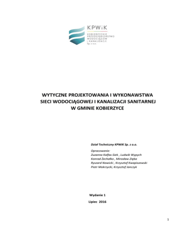 WYTYCZNE PROJEKTOWANIA I WYKONAWSTWA SIECI WODOCIĄGOWEJ I KANALIZACJI SANITARNEJ W GMINIE KOBIERZYCE Dział Techniczny KPWiK Sp. z o.o. Opracowanie: Zuzanna Kalfas-Siek , Ludwik Wypych Konrad Żechałko , Mirosław Zięba Ryszard Nowicki , Krzysztof Kwapiszewski Piotr Mokrzycki, Krzysztof Janczyk Wydanie 1 Lipiec 2016 1 Spis treści 1. SIEĆ WODOCIĄGOWA I SIEĆ KANALIZACJI SANITARNEJ ....................................................................... 3 1.1 Sieć wodociągowa ......................................................................................................................... 3 1.1.1 Projektowanie sieci ............................................................................................................... 3 1.1.2 Wykonywanie sieci ................................................................................................................ 3 1.1.3 Uzbrojenie sieci wodociągowych .......................................................................................... 4 Zasuwy................................................................................................................................................... 4 Obudowy teleskopowe ......................................................................................................................... 5 Hydranty ................................................................................................................................................ 5 Taśmy ostrzegawczo - lokalizacyjne ...................................................................................................... 7 Oznakowanie uzbrojenia ....................................................................................................................... 7 Zabezpieczenie skrzynek zasuw i hydrantów przed osiadaniem .......................................................... 7 1.2 Przyłącza wodociągowe ................................................................................................................ 7 1.2.1 Wymagania stawiane dokumentacji technicznej .................................................................. 7 1.2.2 Materiały do budowy przyłączy wodociągowych ................................................................. 8 1.2.3 Włączenia przyłączy do istniejącej sieci wodociągowej: ....................................................... 8 1.2.4 Lokalizacja wodomierzy.......................................................................................................10 1.2.5 Studnie wodomierzowe ......................................................................................................11 1.3 Sieć kanalizacji sanitarnej ............................................................................................................11 1.3.1 Projektowanie sieci .............................................................................................................11 1.3.2 Średnice i spadki kanałów ...................................................................................................13 1.3.3 Studnie rewizyjne, komory, trójniki, włazy .........................................................................13 Studnie i komory .................................................................................................................................13 Trójniki.................................................................................................................................................14 Włazy kanałowe ..................................................................................................................................14 1.3.4 Materiały do budowy kanałów sanitarnych ........................................................................14 1.3.5 Technologie bezwykopowe renowacji kanalizacji sanitarnej ..............................................15 1.4 Przyłącza kanalizacji sanitarnej ...................................................................................................16 1.4.1 Wymagania stawiane dokumentacji projektowej przyłączy kanalizacji sanitarnej ............16 1.4.2 Materiał do budowy przyłączy kanalizacyjnych ..................................................................17 1.4.3 Średnice przyłączy kanalizacyjnych .....................................................................................17 1.4.4 Włączenia do kanałów.........................................................................................................17 2 2. WYTYCZNE STAWIANE DOKUMENTACJI PROJEKTOWEJ SIECI WODOCIĄGOWEJ I KANALIZACJI SANITARNEJ .................................................................................................................................................18 2.1 Koncepcje projektowe.................................................................................................................18 2.2 Projekty budowlane ....................................................................................................................18 2.2.1 Zakres projektu budowlanego.............................................................................................19 Opis techniczny ...................................................................................................................................19 Plan Zagospodarowania Terenu ..........................................................................................................20 Profile podłużne odcinków sieci ..........................................................................................................20 Rysunki pomocnicze ............................................................................................................................20 Dokumentacja geotechniczna .............................................................................................................21 Dezynfekcja i płukanie sieci wodociągowej ........................................................