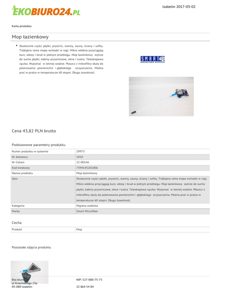 Izabelin 2017-03-02 Karta produktu: Mop łazienkowy Skutecznie czyści płytki, prysznic, wanny, sauny, ściany i sufity. Trójkątna rama mopa wchodzi w rogi. Mikro włókna przyciągają kurz, włosy i brud w jednym przebiegu. Mop łazienkowy wytrze do sucha płytki, kabiny prysznicowe, okna i lustra. Teleskopowa rączka. Wyżymać w letniej wodzie. Płaszcz z mikrofibry służy do polerowania powierzchni i głębokiego oczyszczenia. Można prać w pralce w temperaturze 60 stopni. Długa żywotność. Cena 43,82 PLN brutto Podstawowe parametry produktu Numer produktu w systemie 29973 Nr dostawcy 1010 Nr Celcen 22-00146 Kod kreskowy 7394145201006 Nazwa produktu Mop łazienkowy Opis Skutecznie czyści płytki, prysznic, wanny, sauny, ściany i sufity. Trójkątna rama mopa wchodzi w rogi. Mikro włókna przyciągają kurz, włosy i brud w jednym przebiegu. Mop łazienkowy wytrze do sucha płytki, kabiny prysznicowe, okna i lustra. Teleskopowa rączka. Wyżymać w letniej wodzie. Płaszcz z mikrofibry służy do polerowania powierzchni i głębokiego oczyszczenia. Można prać w pralce w temperaturze 60 stopni. Długa żywotność. Kategoria Higiena osobista Marka Smart Microfiber Cecha Produkt Mop Pozostałe zdjęcia produktu Eko biuro ul Krasińskiego 23a 05-080 Izabelin NIP: 527-000-75-75 22 864 54 84 Izabelin 2017-03-02 Serdecznie zapraszamy do współpracy Eko biuro zespół. Eko biuro ul Krasińskiego 23a 05-080 Izabelin NIP: 527-000-75-75 22 864 54 84