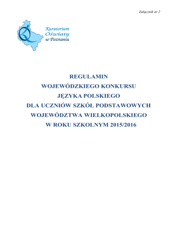 Załącznik nr 2 REGULAMIN WOJEWÓDZKIEGO KONKURSU JĘZYKA POLSKIEGO DLA UCZNIÓW SZKÓŁ PODSTAWOWYCH WOJEWÓDZTWA WIELKOPOLSKIEGO W ROKU SZKOLNYM 2015/2016 Regulamin Wojewódzkiego Konkursu Języka Polskiego dla uczniów szkół podstawowych w roku szkolnym 2015/2016 ___________________________________________________________________________ Dział I PRZEBIEG POSZCZEGÓLNYCH ETAPÓW KONKURSU Rozdział 1 INFORMACJE OGÓLNE §1. §2. §3. §4. §5. §6. §7. §8. §9. §10. §11. Organizatorem konkursu jest Wielkopolski Kurator Oświaty. Wielkopolski Kurator Oświaty w zarządzeniu wydanym w danym roku szkolnym wyznacza pracowników wspomagających organizację i przebieg konkursów w województwie wielkopolskim, określa zadania komisji konkursowych i terminy przeprowadzania poszczególnych etapów. Przewodniczącym Wojewódzkiej Komisji Konkursu Języka Polskiego dla uczniów szkół podstawowych jest pani Magdalena Kalemba-Borowczak, nauczyciel Zespołu SzkolnoPrzedszkolnego w Granowie, 62-066 Granowo, ul. Konstytucji 3 Maja 1, tel.: 61 44 72 040, (po godzinie 15.00, tel.: 694 633 081) e-mail: [email protected] 1. Konkurs składa się z 3 etapów: 1) szkolnego, 2) rejonowego, 3) wojewódzkiego. Merytorycznie konkurs obejmuje wiedzę i umiejętności z języka polskiego zawarte w podstawie programowej kształcenia ogólnego w szkole podstawowej (Rozporządzenie Ministra Edukacji Narodowej z dnia 27 sierpnia 2012 r. w sprawie podstawy programowej wychowania przedszkolnego oraz kształcenia ogólnego w poszczególnych typach szkół - Dz. U. z 2012 r., poz. 977, z późn. zm.) poszerzone o zagadnienia szczegółowe omówione w § 47 niniejszego regulaminu. Na etapie szkolnym i rejonowym konkursu uczniowie rozwiązują test, który składa się z różnych typów zadań otwartych i zamkniętych. Udzielają odpowiedzi, wykorzystując swoje doświadczenia czytelnicze wynikające m.in. z przeczytanych lektur konkursowych. Na każdym etapie konkursu samodzielnie redagują dłuższą wypowiedź pisemną. Udział uczniów w eliminacjach konkursowych jest dobrowolny. Uczeń przystępujący do poszczególnych etapów konkursu zobowiązany jest do posiadania ważnej legitymacji szkolnej. Organizacja konkursów uwzględnia potrzeby osób niepełnosprawnych oraz przewlekle chorych poprzez dostosowanie warunków przeprowadzenia konkursu do potrzeb ww. uczestników konkursu (dostosowanie nie może naruszać zasad samodzielnej pracy uczestnika konkursu). Warunkiem uwzględnienia tych potrzeb jest uzyskanie zgody Przewodniczącego Wojewódzkiej Komisji Konkursowej w terminie do 5 października 2015 r. Podczas trwania konkursu uczeń pracuje samodzielnie, zachowuje spokój i nie zakłóca w żaden inny sposób przebiegu konkursu (nie opuszcza wyznaczonego mu w sali miejsca, nie porozumiewa się z innymi uczestnikami, nie wypowiada uwag i komentarzy, nie zadaje pytań dotyczących zadań konkursowych, nie korzysta z żadnych niedozwolonych materiałów i środków łączności, w tym telefonów komórkowych). W szczególnych przypadkach uczeń może opuścić salę, w której rozwiązuje test konkursowy w każdym czasie po poinformowaniu o swoim zamiarze komisji konkursowej i oddaniu pracy konkursowej przewodniczącemu komisji. Wydarzenie to zostaje odnotowane w protokole przeprowadzenia konkursu. 2 Regulamin Wojewódzkiego Konkursu Języka Polskiego dla uczniów szkół podstawowych w roku szkolnym 2015/2016 ___________________________________________________________________________ §12. Uczestnik konkursu, który ukończył pracę przed wyznaczonym czasem, pozostaje w sali na swoim miejscu. §13. W przypadku stwierdzenia przez komisję naruszenia przez ucznia zasad regulaminu konkursu Przewodniczący Komisji Konkursowej przerywa jego pracę i nakazuje opuszczenie sali, co odnotowuje w protokole przeprowadzenia konkursu. §14. Nie przewiduje się dodatkowego postępowania konkursowego dla uczestników, którzy w wyznaczonym terminie nie przystąpią do danego etapu konkursu. §15. Za zapewnienie opieki i bezpieczeństwa uczniom/uczestnikom etapu szkolnego, rejonowego i wojewódzkiego odpowiada dyrektor szkoły, do której uczęszcza uczeń (w drodze na konkurs, w czasie jego trwania i w drodze powrotnej do szkoły). §16. W pracach komisji etapu szkolnego, rejonowego i wojewódzkiego mogą uczestniczyć w charakterze obserwatorów wizytatorzy Kuratorium Oświaty w Poznaniu. §17. Dokumentacja związana z przebiegiem poszczególnych etapów konkursów, po ich zakończeniu jest porządkowana, zabezpieczana i przechowywania przez 5 lat w szkole - miejscu przeprowadzenia danego etapu lub w szkole wyznaczonej przez Przewodniczącego Wojewódzkiej Komisji Konkursowej. §18. Wielkopolski Kurator Oświaty wydaje laureatom i finalistom zaświadczenia zgodnie z § 5 ust. 1 rozporządzenia Ministra Edukacji Narodowej i Sportu z dnia 29 stycznia 2002 r. w sprawie organizacji oraz sposobu przeprowadzania konkursów, turniejów i olimpiad (Dz. U. z 2002 r. Nr 13, poz. 125, z późn. zm.). §19. Regulamin konkursu nie może ulegać zmianom po jego ogłoszeniu i opublikowaniu na stronach internetowych Kuratorium Oświaty w Poznaniu w danym roku szkolnym. §20. Testy z poszczególnych etapów konkursu zostaną opublikowane na stronie internetowej Kuratorium Oświaty w Poznaniu w ciągu 7 dni roboczych od daty przeprowadzenia konkursu. §21. Wszelkie informacje na temat konkursów przedmiotowych organizowanych na terenie województwa wielkopolskiego, w szczególności zarządzenia Wielkopolskiego Kuratora Oświaty w sprawach konkursów, miejsca przeprowadzania etapu rejonowego i wojewódzkiego oraz ostateczne wyniki etapu wojewódzkiego będą przekazywane zainteresowanym poprzez publikowanie ich na stronie internetowej Kuratorium Oświaty w Poznaniu w zakładce Konkursy. Rozdział 2 ETAP SZKOLNY §22. §23. §24. §25. §26. §27. Etap szkolny odbędzie się w 19 listopada 2015 r. (czwartek) o godz. 13.00 w szkołach, k