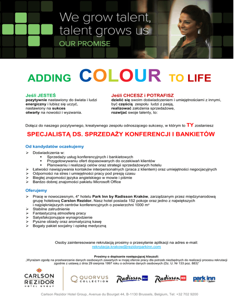 ADDING COLOUR TO LIFE Jeśli JESTEŚ Jeśli CHCESZ i POTRAFISZ pozytywnie nastawiony do świata i ludzi energiczny i lubisz się uczyć, nastawiony na sukces otwarty na nowości i wyzwania. dzielić się swoim doświadczeniem i umiejętnościami z innymi, być częścią zespołu ludzi z pasją, realizować założenia sprzedażowe, rozwijać swoje talenty, to: Dołącz do naszego pozytywnego, kreatywnego zespołu odnoszącego sukcesy, w którym to TY zostaniesz SPECJALISTĄ DS. SPRZEDAŻY KONFERENCJI I BANKIETÓW Od kandydatów oczekujemy Doświadczenia w: Sprzedaży usług konferencyjnych i bankietowych Przygotowywaniu ofert dopasowanych do oczekiwań klientów Planowaniu i realizacji celów oraz strategii sprzedażowych hotelu Łatwości nawiązywania kontaków interpersonalnych (praca z klientem) oraz umiejętności negocjacyjnych Odporności na stres i umiejętności pracy pod presją czasu Biegłej znajomości języka angielskiego w mowie i piśmie Bardzo dobrej znajomości pakietu Microsoft Office Oferujemy Pracę w nowoczesnym, 4* hotelu Park Inn by Radisson Kraków, zarządzanym przez międzynarodową grupę hotelową Carslon Rezidor. Nasz hotel posiada 152 pokoje oraz jedno z największych i najpiękniejszych centrów konferencyjnych o powierzchni 1000 m² Stabilne zatrudnienie Fantastyczną atmosferę pracy Satysfakcjonujące wynagrodzenie Pyszne obiady oraz aromatyczną kawę Bogaty pakiet socjalny i opiekę medyczną Osoby zainteresowane rekrutacją prosimy o przesyłanie aplikacji na adres e-mail: [email protected] Prosimy o dopisanie następującej klauzuli: „Wyrażam zgodę na przetwarzanie danych osobowych zawartych w mojej ofercie pracy dla potrzeb niezbędnych do realizacji procesu rekrutacji zgodnie z ustawą z dnia 29 sierpnia 1997 roku o ochronie danych osobowych (Dz. U. Nr 133 poz. 883)” Carlson Rezidor Hotel Group, Avenue du Bourget 44, B-1130 Brussels, Belgium, Tel: +32 702 9200