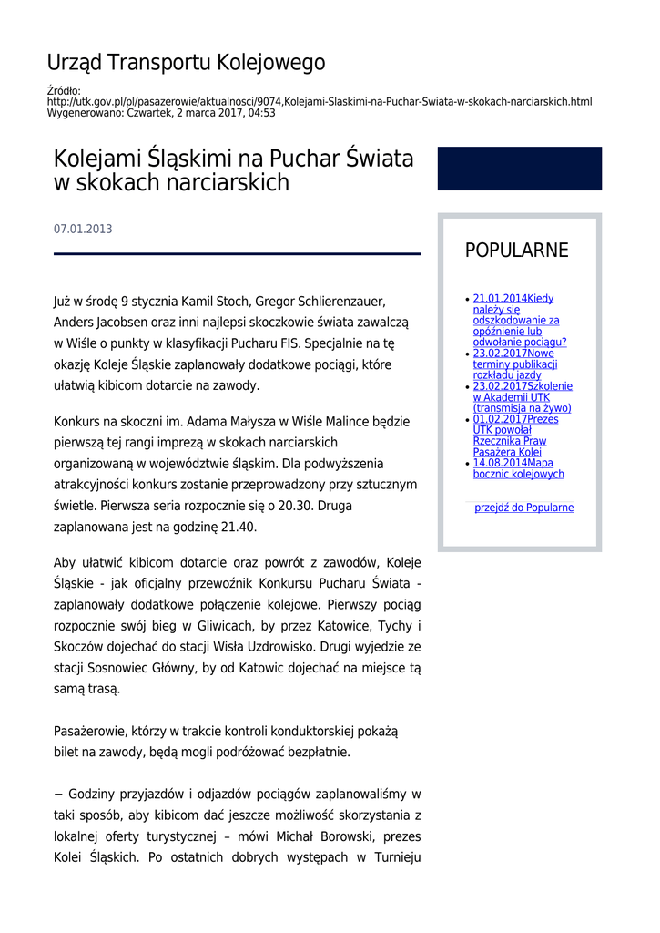 Urząd Transportu Kolejowego Źródło: http://utk.gov.pl/pl/pasazerowie/aktualnosci/9074,Kolejami-Slaskimi-na-Puchar-Swiata-w-skokach-narciarskich.html Wygenerowano: Czwartek, 2 marca 2017, 04:53 Kolejami Śląskimi na Puchar Świata w skokach narciarskich 07.01.2013 POPULARNE Już w środę 9 stycznia Kamil Stoch, Gregor Schlierenzauer, ● Anders Jacobsen oraz inni najlepsi skoczkowie świata zawalczą w Wiśle o punkty w klasyfikacji Pucharu FIS. Specjalnie na tę ● okazję Koleje Śląskie zaplanowały dodatkowe pociągi, które ułatwią kibicom dotarcie na zawody. ● Konkurs na skoczni im. Adama Małysza w Wiśle Malince będzie ● pierwszą tej rangi imprezą w skokach narciarskich organizowaną w województwie śląskim. Dla podwyższenia atrakcyjności konkurs zostanie przeprowadzony przy sztucznym świetle. Pierwsza seria rozpocznie się o 20.30. Druga zaplanowana jest na godzinę 21.40. Aby ułatwić kibicom dotarcie oraz powrót z zawodów, Koleje Śląskie - jak oficjalny przewoźnik Konkursu Pucharu Świata zaplanowały dodatkowe połączenie kolejowe. Pierwszy pociąg rozpocznie swój bieg w Gliwicach, by przez Katowice, Tychy i Skoczów dojechać do stacji Wisła Uzdrowisko. Drugi wyjedzie ze stacji Sosnowiec Główny, by od Katowic dojechać na miejsce tą samą trasą. Pasażerowie, którzy w trakcie kontroli konduktorskiej pokażą bilet na zawody, będą mogli podróżować bezpłatnie. − Godziny przyjazdów i odjazdów pociągów zaplanowaliśmy w taki sposób, aby kibicom dać jeszcze możliwość skorzystania z lokalnej oferty turystycznej – mówi Michał Borowski, prezes Kolei Śląskich. Po ostatnich dobrych występach w Turnieju ● 21.01.2014Kiedy należy się odszkodowanie za opóźnienie lub odwołanie pociągu? 23.02.2017Nowe terminy publikacji rozkładu jazdy 23.02.2017Szkolenie w Akademii UTK (transmisja na żywo) 01.02.2017Prezes UTK powołał Rzecznika Praw Pasażera Kolei 14.08.2014Mapa bocznic kolejowych przejdź do Popularne Czterech Skoczni zainteresowanie wiślackim konkursem jest bardzo duże. Organizatorzy informują, że w chwili obecnej w sprzedaży pozostały jeszcze bilety w cenie 40 zł. Szczegóły na http://www.skijumping-worldcup.pl/wisla/ ● Dojazd Pociąg nr 1: Gliwice (11:59) – Katowice (12:55) – Tychy (13:14) – Skoczów (14:21) - Wisła Uzdrowisko (15:07) Pociąg nr 2: Sosnowiec Główny (14:16) – Katowice (14:42) – Tychy (15:04) - Skoczów (16:05) - Wisła Uzdrowisko (16:41) ● Powrót Pociąg nr 1: Wisła Uzdrowisko (23:55) – Skoczów (00:29) – Tychy (01:28) – Katowice (01:47) - Gliwice (02:35) Pociąg nr 2: Wisła Uzdrowisko (23:30) - Skoczów (00:04) – Tychy (01:03) – Katowice (01:22) - Sosnowiec Główny (01:32) Źródło: Koleje Śląskie