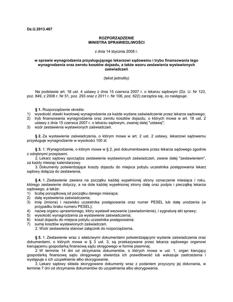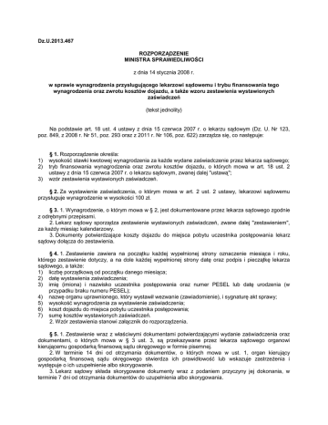 Dz.U.2013.467 ROZPORZĄDZENIE MINISTRA SPRAWIEDLIWOŚCI z dnia 14 stycznia 2008 r. w sprawie wynagrodzenia przysługującego lekarzowi sądowemu i trybu finansowania tego wynagrodzenia oraz zwrotu kosztów dojazdu, a także wzoru zestawienia wystawionych zaświadczeń (tekst jednolity) Na podstawie art. 18 ust. 4 ustawy z dnia 15 czerwca 2007 r. o lekarzu sądowym (Dz. U. Nr 123, poz. 849, z 2008 r. Nr 51, poz. 293 oraz z 2011 r. Nr 106, poz. 622) zarządza się, co następuje: 1) 2) 3) § 1. Rozporządzenie określa: wysokość stawki kwotowej wynagrodzenia za każde wydane zaświadczenie przez lekarza sądowego; tryb finansowania wynagrodzenia oraz zwrotu kosztów dojazdu, o których mowa w art. 18 ust. 2 ustawy z dnia 15 czerwca 2007 r. o lekarzu sądowym, zwanej dalej "ustawą"; wzór zestawienia wystawionych zaświadczeń. § 2. Za wystawienie zaświadczenia, o którym mowa w art. 2 ust. 2 ustawy, lekarzowi sądowemu przysługuje wynagrodzenie w wysokości 100 zł. § 3. 1. Wynagrodzenie, o którym mowa w § 2, jest dokumentowane przez lekarza sądowego zgodnie z odrębnymi przepisami. 2. Lekarz sądowy sporządza zestawienie wystawionych zaświadczeń, zwane dalej "zestawieniem", za każdy miesiąc kalendarzowy. 3. Dokumenty potwierdzające koszty dojazdu do miejsca pobytu uczestnika postępowania lekarz sądowy dołącza do zestawienia. § 4. 1. Zestawienie zawiera na początku każdej wypełnionej strony oznaczenie miesiąca i roku, którego zestawienie dotyczy, a na dole każdej wypełnionej strony datę oraz podpis i pieczątkę lekarza sądowego, a także: 1) liczbę porządkową od początku danego miesiąca; 2) datę wystawienia zaświadczenia; 3) imię (imiona) i nazwisko uczestnika postępowania oraz numer PESEL lub datę urodzenia (w przypadku braku numeru PESEL); 4) nazwę organu uprawnionego, który wystawił wezwanie (zawiadomienie), i sygnaturę akt sprawy; 5) wysokość wynagrodzenia za wystawienie zaświadczenia; 6) koszt dojazdu do miejsca pobytu uczestnika postępowania; 7) sumę kosztów wystawionych zaświadczeń. 2. Wzór zestawienia stanowi załącznik do rozporządzenia. § 5. 1. Zestawienie wraz z właściwymi dokumentami potwierdzającymi wydanie zaświadczenia oraz dokumentami, o których mowa w § 3 ust. 3, są przekazywane przez lekarza sądowego organowi kierującemu gospodarką finansową sądu okręgowego w formie pisemnej. 2. W terminie 14 dni od otrzymania dokumentów, o których mowa w ust. 1, organ kierujący gospodarką finansową sądu okręgowego stwierdza ich prawidłowość lub wskazuje zastrzeżenia i występuje o ich uzupełnienie albo skorygowanie. 3. Lekarz sądowy składa skorygowane dokumenty wraz z podaniem przyczyny jej dokonania, w terminie 7 dni od otrzymania dokumentów do uzupełnienia albo skorygowania. § 6. W terminie 30 dni od dnia otrzymania wszystkich prawidłowo sporządzonych dokumentów następuje wypłata wynagrodzenia oraz zwrot kosztów dojazdu do miejsca pobytu uczestnika postępowania. § 7. W razie wystąpienia okoliczności, o których mowa w art. 19 ustawy, prezes sądu okręgowego informuje organ kierujący gospodarką finansową sądu okręgowego o wstrzymaniu wypłaty wynagrodzenia, o uchyleniu wstrzymania wypłaty wynagrodzenia oraz o pozbawieniu prawa do wypłaty wynagrodzenia. § 8. Rozporządzenie wchodzi w życie z dniem 1 lutego 2008 r. ZAŁĄCZNIK WZÓR ZESTAWIENIA WYSTAWIONYCH ZAŚWIADCZEŃ wzór