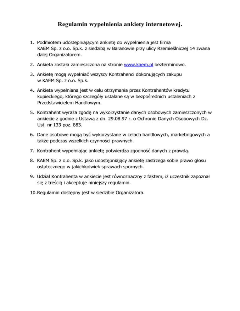 Regulamin wypełnienia ankiety internetowej. 1. Podmiotem udostępniającym ankietę do wypełnienia jest firma KAEM Sp. z o.o. Sp.k. z siedzibą w Baranowie przy ulicy Rzemieślniczej 14 zwana dalej Organizatorem. 2. Ankieta została zamieszczona na stronie www.kaem.pl bezterminowo. 3. Ankietę mogą wypełniać wszyscy Kontrahenci dokonujących zakupu w KAEM Sp. z o.o. Sp.k. 4. Ankieta wypełniana jest w celu otrzymania przez Kontrahentów kredytu kupieckiego, którego szczegóły ustalane są w bezpośrednich ustaleniach z Przedstawicielem Handlowym. 5. Kontrahent wyraża zgodę na wykorzystanie danych osobowych zamieszczonych w ankiecie z godnie z Ustawą z dn. 29.08.97 r. o Ochronie Danych Osobowych Dz. Ust. nr 133 poz. 883. 6. Dane osobowe mogą być wykorzystane w celach handlowych, marketingowych a także podczas wszelkich czynności prawnych. 7. Kontrahent wypełniając ankietę potwierdza zgodność danych z prawdą. 8. KAEM Sp. z o.o. Sp.k. jako udostępniający ankietę zastrzega sobie prawo głosu ostatecznego w jakichkolwiek sprawach spornych. 9. Udział Kontrahenta w ankiecie jest równoznaczny z faktem, iż uczestnik zapoznał się z treścią i akceptuje niniejszy regulamin. 10. Regulamin dostępny jest w siedzibie Organizatora.