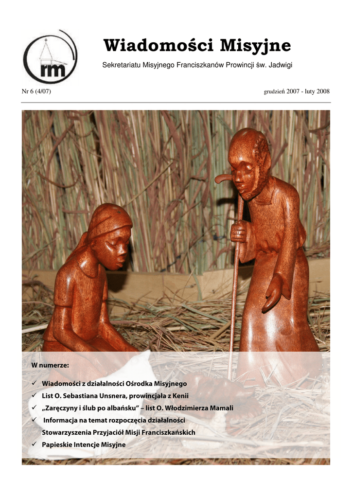 Wiadomości Misyjne Sekretariatu Misyjnego Franciszkanów Prowincji św. Jadwigi Nr 6 (4/07) W numerze: Wiadomości z działalności Ośrodka Misyjnego List O. Sebastiana Unsnera, prowincjała z Kenii „Zaręczyny i ślub po albańsku” – list O. Włodzimierza Mamali Informacja na temat rozpoczęcia działalności Stowarzyszenia Przyjaciół Misji Franciszkańskich Papieskie Intencje Misyjne grudzień 2007 - luty 2008 Zamyślenia adwentowe nam przepowiada Kościół. Uczniowie muszą pamiętać, że nie wiąże ich tylko znajomość prawd wiary, lecz przede wszystkim Osoba Chrystusa. Uczeń nie może opuścić swego Mistrza, który jest dla niego jak ojciec, ale musi być gotowy na dzielenie Jego losu i dźwiganie Jego krzyża. Obecnie ludzie, zwłaszcza młodzi, nie chcą być uczniami Chrystusa. Skutecznie zniechęcają ich do tego media – poprzez ośmieszanie, deprecjonowanie, a nawet bojkot wartości duchowych. Wyśmiewa się wszystko, co należy do istoty bycia uczniem, to jest umiejętność słuchania, posłuszeństwo i dojrzewanie do odpowiedzialności w formowaniu swego sumienia. Media promują wśród młodzieży luzacki styl bycia, wolność pozbawioną odpowiedzialności, propagują zasadę „róbcie, co się wam podoba”. Wpaja się młodemu człowiekowi, że życie bez wzorców osobowych, bez autorytetów jest pełniejsze i bardziej twórcze. Chrystus, Nauczyciel, przypomina nam – swoim obecnym uczniom: „Nie każdy, który Mi mówi: „Panie, Panie”, wejdzie do królestwa niebieskiego, lecz ten, kto spełnia wolę mojego Ojca, który jest w niebie” (Mt 7, 21). Ten, kto nie potrafi słuchać Słowa Bożego i według niego żyć, nie może być dobrym uczniem Jezusa. Prędzej czy później zagubi drogę, którą powinien podążać za Nauczycielem. Dlatego potrzebni są uczniowie, całkowicie oddani Jezusowi, którzy przypomną niejednemu zagubionemu człowiekowi, że On jest rzeczywiście i że można Mu całkowicie zawierzyć, bo nigdy nas nie oszuka i nigdy nas nie zostawi na rozdrożu, tylko wyprowadzi na właściwą drogę ku prawdziwemu życiu. Szczególnymi uczniami Chrystusa są między innymi misjonarze i misjonarki, którzy prowadzą ewangelizację na całym świecie. Misjonarki i misjonarze duchowni i świecy są dla współczesnego świata widzialnymi uczniami Chrystusa. Ewangelizując, najczęściej w bardzo trudnych warunkach, w widoczny sposób reprezentują uczniów Chrystusa, za co często są wyśmiewani, prześladowani, a nawet mordowani. To oni są wypełnieniem proroczych słów Chrystusa Nauczyciela: „Jeżeli was świat nienawidzi, wiedzcie, że Mnie pierwej znienawidził. Gdybyście byli ze świata, świat by was kochał jako swoja własność. Ale ponieważ nie jesteście ze świata, ba Ja was wybrałem sobie ze świata, dlatego was świat nienawidzi (…) Jeżeli Mnie prześladowali, to i was będą prześladować.” (J 15,18-20). Kościół dziś przypomina wszystkim w swoich licznych dokumentach, że mają formować wiernych na dojrzałych i świadomych uczniów Chrystusa. O. Wojciech Piętowski OFM Czas liturgicznego Adwentu daje okazję każdemu chrześcijaninowi do refleksji nad tym, czy rzeczywiście jest uczniem Chrystusa. Hasło „Bądźmy uczniami Chrystusa” powinno stać się dla nas przewodnią myślą i zadaniem do wykonania w nowym roku liturgicznym. By wypełnić to zadanie, musimy szczerze rozważać istotę naszej odpowiedzialności za fakt bycia uczniem Chrystusa. Niżej postawione pytania, odnoszące się do ewangelicznego tekstu, mają nam pomóc w zgłębieniu tej prawdy. Kogo i w jaki sposób Chrystus powołał do ścisłego grona swoich uczniów? Na jakich warunkach my – żyjący współcześnie – jesteśmy uczniami Chrystusa? Jak i do czego powołał nas Bóg? W tekście Ewangelii św. Marka czytamy: „Jezus wyszedł na górę i przywołał do siebie tych, których sam chciał, a oni przyszli do Niego” (Mk 3, 13-14). Jaki sens ma ten z pozoru prosty tekst? Jezus wchodzi na górę. Żaden z Ewangelistów nie podaje nazwy góry, ponieważ ważniejszy jest tutaj sens symboliczny. Góra jest przestrzenią symboliczną, jest to miejsce położone wysoko i dominujące nad tym wszystkim, czemu uczniowie oddają się w swoich powszednich zajęciach. Na górze natomiast zostają wybrani na uczniów, co jest aktem wypełnienia woli Boga. Święty Łukasz jeszcze mocniej podkreśla sakralny aspekt powołania uczniów: „W tym czasie Jezus wyszedł na górę, aby się modlić, i całą noc spędził na modlitwie do Boga. Z nastaniem dnia przywołał swoich uczniów i wybrał spośród nich dwunastu, których też nazwał apostołami (…)” (Łk 6, 12-13). A więc powołanie na uczniów było ściśle powiązane z modlitwą. Na tej samej zasadzie musi opierać się wybór uczniów Chrystusa dzisiaj. Nie można wybierać ich tak, jak prawodawca wybiera przydatnych mu pracowników. Wybór ucznia Chrystusa, tak jak opisany w Ewangelii wybór Apostołów, musi być poprzedzony modlitwą. Uczniowie winni być wymodleni, czyli wskazani przez samego Boga, tak jak uczynił to Jezus. „Nie wyście Mnie wybrali, ale Ja was wybrałem i przeznaczyłem was na to, abyście szli i owoc przynosili, i by owoc wasz trwał (…)” (J 15,16). W Kazaniu na Górze (Mt 5, 1-11) Jezus dopowie więcej, a mianowicie że uczniem może być każdy wierzący, kto w sposób dobrowolny i świadomy wchodzi na drogę naśladowania Go i kto szuka skarbu królestwa niebieskiego pośród swoich codziennych zajęć, na przykład gdy łowi ryby, uprawia rolę, pasie bydło czy piecze chleb. Uczniem Jezus jest ten, kto słucha słowa Bożego i wypełnia wszystkie słowa Mistrza. Nie ważne jest pochodzenie ucznia, jego zdolności intelektualne, zdrowie czy nawet walory moralne. Dziś do grona swoich uczniów Chrystus powołuje poprzez sakrament Chrztu Świętego. Naśladowanie Chrystusa i bycie Jego uczniem to przede wszystkim zerwanie z grzeszn