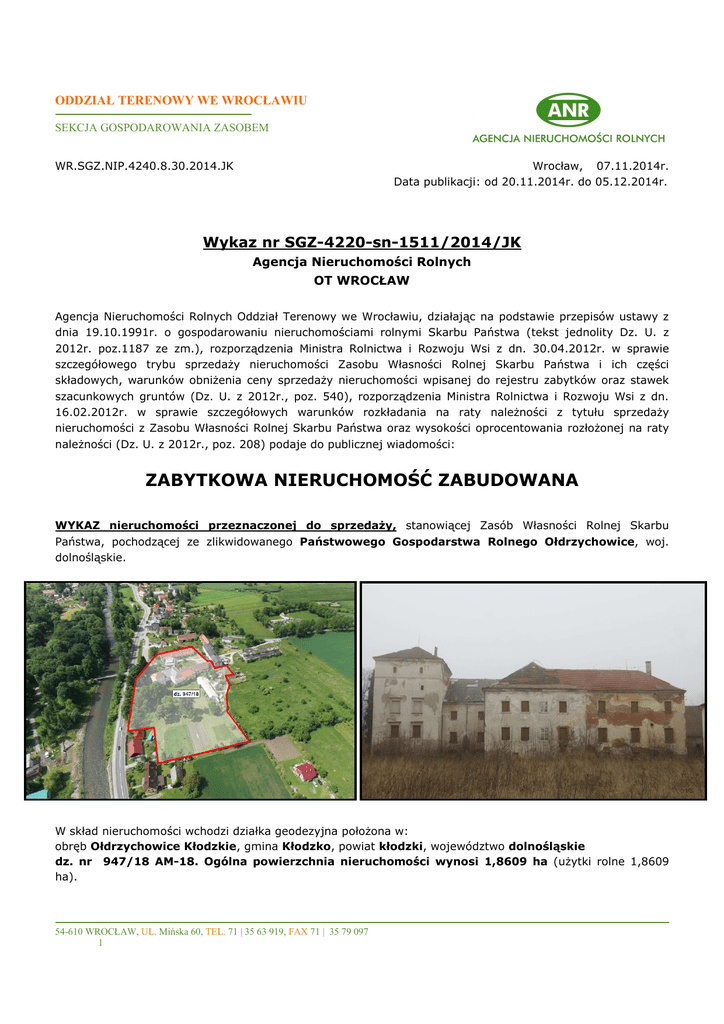 Agencji Nieruchomości Rolnych Oddział Terenowy we Wrocławiu, ul. Mińska 60, nr tel. 71 | 35 63 919 wew.