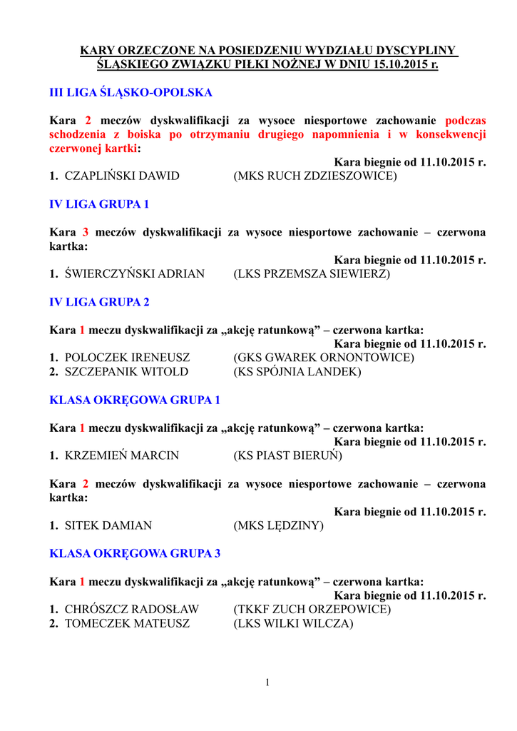 KARY ORZECZONE NA POSIEDZENIU WYDZIAŁU DYSCYPLINY ŚLĄSKIEGO ZWIĄZKU PIŁKI NOŻNEJ W DNIU 15.10.2015 r. III LIGA ŚLĄSKO-OPOLSKA Kara 2 meczów dyskwalifikacji za wysoce niesportowe zachowanie podczas schodzenia z boiska po otrzymaniu drugiego napomnienia i w konsekwencji czerwonej kartki: Kara biegnie od 11.10.2015 r. 1. CZAPLIŃSKI DAWID (MKS RUCH ZDZIESZOWICE) IV LIGA GRUPA 1 Kara 3 meczów dyskwalifikacji za wysoce niesportowe zachowanie – czerwona kartka: Kara biegnie od 11.10.2015 r. 1. ŚWIERCZYŃSKI ADRIAN (LKS PRZEMSZA SIEWIERZ) IV LIGA GRUPA 2 Kara 1 meczu dyskwalifikacji za „akcję ratunkową” – czerwona kartka: Kara biegnie od 11.10.2015 r. 1. POLOCZEK IRENEUSZ (GKS GWAREK ORNONTOWICE) 2. SZCZEPANIK WITOLD (KS SPÓJNIA LANDEK) KLASA OKRĘGOWA GRUPA 1 Kara 1 meczu dyskwalifikacji za „akcję ratunkową” – czerwona kartka: Kara biegnie od 11.10.2015 r. 1. KRZEMIEŃ MARCIN (KS PIAST BIERUŃ) Kara 2 meczów dyskwalifikacji za wysoce niesportowe zachowanie – czerwona kartka: Kara biegnie od 11.10.2015 r. 1. SITEK DAMIAN (MKS LĘDZINY) KLASA OKRĘGOWA GRUPA 3 Kara 1 meczu dyskwalifikacji za „akcję ratunkową” – czerwona kartka: Kara biegnie od 11.10.2015 r. 1. CHRÓSZCZ RADOSŁAW (TKKF ZUCH ORZEPOWICE) 2. TOMECZEK MATEUSZ (LKS WILKI WILCZA) 1 Kara 2 meczów dyskwalifikacji za wysoce niesportowe zachowanie – czerwona kartka: Kara biegnie od 11.10.2015 r. 1. PIKUŁA ŁUKASZ (KS RAFAKO RACIBÓRZ) Zakaz sprawowania funkcji trenera w 2 meczach za wysoce niesportowe zachowanie: Kara biegnie od 11.10.2015 r. 1. SOSNA TOMASZ (KS PRZYSZŁOŚĆ ROGÓW) Podstawa prawna: Regulamin Dyscyplinarny PZPN - Art. 62 w związku z Art. 25 KLASA OKRĘGOWA GRUPA 4 Kara 1 meczu dyskwalifikacji za „akcję ratunkową” – czerwona kartka: Kara biegnie od 11.10.2015 r. 1. KUKUŁKA TOMASZ (KKS ŁAZOWIANKA ŁAZY) I LIGA WOJEWÓDZKA JUNIORÓW (A1) 1. Wydział Dyscypliny na posiedzeniu w dniu 15.10.2015 r. postanowił zawiesić resztę kary na okres 6 miesięcy nałożoną na trenera UKS Ruch Chorzów Jacka Basa. Zawieszenie reszty kary obowiązuje od 16.10.2015 r. Podstawa prawna: Regulamin Dyscyplinarny PZPN - Art. 165 II LIGA WOJEWÓDZKA JUNIORÓW MŁODSZYCH GRUPA PÓŁNOCNA (B1) Nagana: 1. KOŁODZIEJ MICHAŁ (GKS PIAST S.A. GLIWICE) Podstawa prawna: Regulamin Dyscyplinarny PZPN - Art. 77 lit „b” Kara finansowa w wysokości 100 zł za brak należytego porządku i bezpieczeństwa na stadionie po zawodach II Ligi Wojewódzkiej Juniorów Młodszych grupy północnej w dniu 10.10.2015 r.: 1. GKS PIAST S.A. GLIWICE Podstawa prawna: Regulamin Dyscyplinarny PZPN - Art. 64 § 1 pkt 1 2 LIGA JUNIORÓW MŁODSZYCH (B2) Kara 2 meczów dyskwalifikacji za wysoce niesportowe zachowanie – czerwona kartka: Kara biegnie od 01.10.2015 r. 1. KWIATKOWSKI SZYMON (SP MOSIR JASTRZĘBIE) Kara 2 meczów dyskwalifikacji za wysoce niebezpieczną grę - czerwona kartka: Kara biegnie od 11.10.2015 r. 1. PIOTROWSKI KAMIL (GKS KATOWICE) II LIGA WOJEWÓDZKA TRAMPKARZY MŁODSZYCH GRUPA PÓŁNOCNA (C2) Kara finansowa w wysokości 100 zł za brak opieki medycznej na zawodach II Ligi Wojewódzkiej Trampkarzy Młodszych grupy północnej w dniu 11.10.2015 r.: 1. KS DĄBROWIANKA Podstawa prawna: Regulamin Dyscyplinarny PZPN - Art. 102 pkt 1 Przewodniczący Wydziału Dyscypliny /-/ Rafał Machecki 3