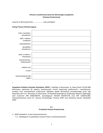 Umowa o powierzenie praw do zbiorowego zarządzania (Umowa Powiernicza) zawarta w Warszawie dnia …………………. roku pomiędzy: Panią/ Panem (Powierzający) imię i nazwisko, pseudonim data i miejsce urodzenia obywatelstwo dyscyplina artystyczna ulica, nr domu i mieszkania kod pocztowy, miejscowość telefon, fax e-mail konto bankowe dla wpłat i Związkiem Polskich Artystów Plastyków (ZPAP) z siedzibą w Warszawie, ul. Nowy Świat 7/6 00-496 Warszawa, wpisanym do rejestru stowarzyszeń, innych organizacji społecznych i zawodowych, fundacji oraz samodzielnych publicznych zakładów opieki zdrowotnej prowadzonego przez Sąd Rejonowy dla m.st. Warszawy w Warszawie, XII Wydział Gospodarczy Krajowego Rejestru Sądowego pod numerem KRS 0000106679, posiadającym REGON 001401758 oraz NIP 5260251380, reprezentowanym przez Dr. Janusza Janowskiego, Prezesa ZPAP oraz Adriannę Garnik, Skarbnika ZPAP §1 Przedmiot Umowy Powierniczej 1. ZPAP oświadcza, że jest stowarzyszeniem: 1.1. działającym na podstawie ustawy Prawo o stowarzyszeniach, 1 1.2. zrzeszającym twórców - artystów sztuk wizualnych o specjalnościach: malarstwo, grafika, rzeźba, medalierstwo, ceramika, szkło, witraż, tkanina, wzornictwo przemysłowe, architektura wnętrz, mebel, scenografia, konserwacja dzieł sztuki, wystawiennictwo, 1.3. posiadającym status organizacji zbiorowego zarządzania prawami autorskimi w rozumieniu art. 104 i n. ustawy o prawie autorskim i prawach pokrewnych, wykonującym zgodnie z decyzją Ministra Kultury (Zezwolenie Ministra Kultury) z dnia 1 lutego 1995 roku nr DP.041/Z/5/95 (z poźn. zmianami) zbiorowy zarząd prawami autorskimi do utworów plastycznych na wskazanych w tej decyzji polach eksploatacji oraz pobieranie na rzecz twórców bądź ich spadkobierców wynagrodzenia w przypadku zawodowej odsprzedaży oryginalnych egzemplarzy utworów plastycznych (droit de suite). 2. Powierzający oświadcza, że jest uprawniony z tytułu praw autorskich do utworów plastycznych1. 3. Powierzający oświadcza, że nie powierzył innej organizacji zbiorowego zarządzania praw w zakresie objętym niniejszą umową. 4. Na podstawie niniejszej Umowy Powierniczej Powierzający powierza ZPAP wykonywanie zbiorowego zarządu w odniesieniu do służących Powierzającemu praw do utworów plastycznych, a ZPAP zobowiązuje się do zarządzania tymi prawami we własnym imieniu, ale w interesie Powierzającego (Powierzenie). 5. Powierzenie obejmuje wszystkie utwory, o których mowa w ust. 1 powyżej, zarówno oryginalne, jak i w postaci opracowania, utworu wkładowego w utworach audiowizualnych lub w odniesieniu do rozpowszechniania, na które zgodnie z obowiązującym prawem nie jest wymagane zezwolenie twórcy, ale służy mu prawo do wynagrodzenia. 6. Powierzenie obejmuje wszystkie utwory należące do kategorii, o których mowa w ust. 1 powyżej, tak istniejące w dniu dokonania Powierzenia, jak i powstałe w okresie trwania Powierzenia, do których autorskie prawa majątkowe służą Powierzającemu. 7. Powierzenie następuje: 7.1. na czas nieoznaczony, 7.2. na zasadzie wyłączności ZPAP w wykonywaniu praw objętych Powierzeniem, 7.3. na wszystkich polach eksploatacji objętych niniejszym Powierzeniem, w szczególności na polach eksploatacji objętych Zezwoleniem Ministra Kultury, 7.4. na zasadzie umocowania ZPAP do działania we własnym imieniu i na rzecz Powierzającego, 7.5. na zasadzie działania bez ograniczenia terytorium, na którym jest wykonywane zbiorowe zarządzanie, tj. obejmując terytorium Rzeczypospolitej Polskiej i terytoria innych państw. §2 1 utworem plastycznym w rozumieniu Umowy Powierniczej jest w szczególności utwór z dziedzin wymienionych w §1 ust.1 pkt 1.2. Umowy 2 Zasady wykonywania zbiorowego zarządu przez ZPAP 1. Powierzenie obejmuje zarządzanie prawami autorskimi do utworów plastycznych, w tym do pobierania wynagrodzenia, na następujących polach eksploatacji: 1.1. zwielokrotnianie jakąkolwiek techniką, w tym techniką drukarską, reprograficzną, zapisu magnetycznego i techniką cyfrową; 1.2. wprowadzanie do obrotu oryginału lub zwielokrotnionych egzemplarzy utworu; 1.3. użyczenie i najem oryginału lub zwielokrotnionych egzemplarzy utworu; 1.4. wystawienie; 1.5. publiczne udostępnianie utworu w taki sposób, aby każdy mógł mieć do niego dostęp w miejscu i w czasie przez siebie wybranym. 2. ZPAP działa w charakterze organizacji zbiorowego zarządzania, legitymującej się określonymi w ustawie o prawie autorskim i prawach pokrewnych uprawnieniami i obowiązkami, tylko w odniesieniu do pól eksploatacji wynikających z Zezwolenia Ministra Kultury. W przypadku rozszerzenia pól eksploatacji objętych Zezwoleniem Ministra Kultury ZPAP wykonuje zbiorowy zarząd w odniesieniu do utworów plastycznych Powierzającego bez konieczności zmiany niniejszej Umowy. W przypadku zmiany Zezwolenia Ministra Kultury, polegającej na wyłączeniu określonych pól eksploatacji z wykonywania zbiorowego zarządu przez ZPAP, ZPAP może nadal reprezentować na nich Powierzającego, jako jego pełnomocnik. 3. Zobowiązanie ZPAP w odniesieniu do zbiorowego zarządzania obejmuje: 3.1. w odniesieniu do pól eksploatacji objętych Zezwoleniem Ministra Kultury, ochronę powierzonych praw oraz wykonywanie uprawnień wynikających z ustawy, a w szczególności udzielanie licencji i dochodzenie ochrony, w tym: a) ustalanie wysokości wynagrodzenia i jego dochodzenie, w tym kontrolę prawidłowości jego naliczenia, b) dochodzenie roszczeń związanych z wykonywaniem umów, jak również z naruszaniem praw do utworów objętych Powierzeniem lub związanych z naruszeniem umów o korzystanie z tych utworów, c) ustalanie zasad naliczania i wysokości wynagrodzenia i opłat oraz dochodzenie roszczeń, m.in. z tytułu korzystania z utworów niewymagającego zgody twórcy w zakresie, w którym twórcy służy jedynie prawo do wynagrodzenia, d) dochodzenie – pobranych przez upowa