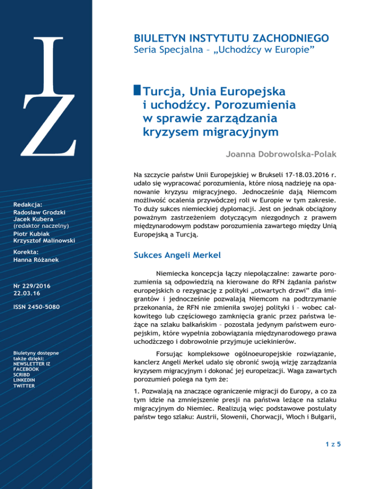 BIULETYN INSTYTUTU ZACHODNIEGO Seria Specjalna – „Uchodźcy w Europie” Turcja, Unia Europejska i uchodźcy. Porozumienia w sprawie zarządzania kryzysem migracyjnym Joanna Dobrowolska-Polak Redakcja: Radosław Grodzki Jacek Kubera (redaktor naczelny) Piotr Kubiak Krzysztof Malinowski Korekta: Hanna Różanek Nr 229/2016 22.03.16 ISSN 2450-5080 Biuletyny dostępne także dzięki: NEWSLETTER IZ FACEBOOK SCRIBD LINKEDIN TWITTER Na szczycie państw Unii Europejskiej w Brukseli 17-18.03.2016 r. udało się wypracować porozumienia, które niosą nadzieję na opanowanie kryzysu migracyjnego. Jednocześnie dają Niemcom możliwość ocalenia przywódczej roli w Europie w tym zakresie. To duży sukces niemieckiej dyplomacji. Jest on jednak obciążony poważnym zastrzeżeniem dotyczącym niezgodnych z prawem międzynarodowym podstaw porozumienia zawartego między Unią Europejską a Turcją. Sukces Angeli Merkel Niemiecka koncepcja łączy niepołączalne: zawarte porozumienia są odpowiedzią na kierowane do RFN żądania państw europejskich o rezygnację z polityki „otwartych drzwi” dla imigrantów i jednocześnie pozwalają Niemcom na podtrzymanie przekonania, że RFN nie zmieniła swojej polityki i – wobec całkowitego lub częściowego zamknięcia granic przez państwa leżące na szlaku bałkańskim – pozostała jedynym państwem europejskim, które wypełnia zobowiązania międzynarodowego prawa uchodźczego i dobrowolnie przyjmuje uciekinierów. Forsując kompleksowe ogólnoeuropejskie rozwiązanie, kanclerz Angeli Merkel udało się obronić swoją wizję zarządzania kryzysem migracyjnym i dokonać jej europeizacji. Waga zawartych porozumień polega na tym że: 1. Pozwalają na znaczące ograniczenie migracji do Europy, a co za tym idzie na zmniejszenie presji na państwa leżące na szlaku migracyjnym do Niemiec. Realizują więc podstawowe postulaty państw tego szlaku: Austrii, Słowenii, Chorwacji, Włoch i Bułgarii, 1z5 ale także pozostałych państw UE, szczególnie Francji, Holandii, Węgier i Polski. Dzięki temu dają podstawy do stopniowego wyciszania politycznych konfliktów między tymi państwami a Niemcami. 2. Wzmacniają procedurę uzgadniania stanowisk państw zgodną z złożeniami wspólnej polityki zagranicznej UE, uwzględniającą obawy państw o odmiennych koncepcjach politycznych. Daje to nadzieję na postulowany przez wszystkie państwa powrót do dobrych standardów działania Unii Europejskiej. 3. Otwierają opcję stabilizacji sytuacji na granicach państw, odbudowy strefy Schengen i ponownego otwarcia granic. Dzięki temu odczuwalne przez państwa i społeczeństwa dotkliwe gospodarcze i społeczne koszty zamknięcia granic wewnętrznych Unii mogą zostać znacząco ograniczone. 4. Odzwierciedlają też niemiecką koncepcję europeizacji problemu uchodźczego i są bezpośrednim wyrazem zachowania postulowanego przez Niemcy wspólnotowego podejścia do rozwiązania „kwestii uchodźczej” poprzez aprobatę przez wszystkie państwa planu przesiedleń uchodźców syryjskich bezpośrednio z Turcji do państw członkowskich (w porozumieniu uwzględnione zostało jednak prawo każdego państwa członkowskiego do indywidualnego określenia kryteriów kwalifikacji przesiedlanych uchodźców i ostatecznych limitów dotyczących liczby przyjmowanych osób) oraz poprzez unijną kontrasygnatę dla niemiecko-francusko-greckiej koncepcji uznania Turcji za „bezpieczne państwo trzecie”. 5. Otwierają drogę do dalszej współpracy nie tylko wewnątrzunijnej (np. odnośnie do zwiększania efektywności działania FRONTEX-u na greckiej – zewnętrznej granicy UE oraz udzielenia znaczącego wsparcia Grecji, zmagającej się z koniecznością opanowania katastrofy humanitarnej), ale także międzyorganizacyjnej, na linii Unia Europejska-NATO (w celu zwiększenia skuteczności w zakresie zatrzymywania łodzi z uchodźcami na morzu i bezpośredniego odsyłania ich do Turcji) oraz w relacjach Unia Europejska-ONZ (w których szczególnie duża rola, przede wszystkim w zakresie legitymizacji przyjętego rozwiązania, jest przypisywana Urzędowi Wysokiego Komisarza NZ ds. Uchodźców – UNHCR). „Zarządzanie kryzysem uchodźczym” Porozumienia zawarte na szczycie UE 17-18 marca br. zostały wypracowane przez Komisję Europejską oraz Niemcy i sprawującą prezydencję w UE Holandię i zaproponowane w strategii „zarządzania kryzysem uchodźczym” (propozycja Jeana-Claude’a Junckera z 17 marca 2016 r.) Strategia ta opiera się na czterech filarach: 1. Współpracy z Turcją; 2. Powstrzymaniu swobodnego przemieszczania się migrantów; 3. Przywróceniu efektywnego działania strefy Schengen; 4. Zwiększeniu pomocy humanitarnej dla państw zmagających się z koniecznością zapewnienia humanitarnych warunków bytowania uchodźców i imigrantów. 2z5 Najważniejsze dla powstrzymania eskalacji kryzysu migracyjnego jest porozumienie zawarte między UE a Turcją, bez którego realizacja innych celów unijnych miałaby wątpliwe szanse powodzenia. W zakresie powstrzymania ruchu migracyjnego porozumienie UE-Turcja przewiduje że: 1. Każda nowa osoba, niezależnie od narodowości, nielegalnie przekraczająca turecko-grecką granicę będzie zawracana do Turcji (działanie to rozpoczęto 20.03.2016 r.); 2. Za każdego uchodźcę z Syrii, który zostanie zawrócony z Grecji do Turcji, inny syryjski uchodźca przebywający w Turcji zostanie przesiedlony do państwa unijnego (readmisja Syryjczyków ma rozpocząć się 4.04.2016 r.); 3. Turcja podejmie wszystkie możliwe działania, żeby powstrzymać nielegalną imigrację do Unii Europejskiej drogą morską i lądową; 4. Unia uruchomi dobrowolny system przesiedleń (Voluntary Humanitarian Admission Scheme), jak tylko nielegalny przepływ ludności zostanie co najmniej znacząco ograniczony. W zamian za działanie zgodne z oczekiwaniami Unii Europejskiej: 1. Unia przekaże 6 mld euro na pomoc uchodźcom w Turc