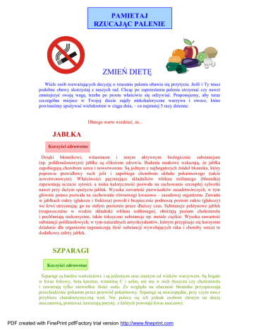 PAMIETAJ RZUCAJĄC PALENIE ZMIEŃ DIETĘ Wiele osób rozważających decyzję o rzuceniu palenia obawia się przytycia. Jeśli i Ty masz podobne obawy skorzystaj z naszych rad. Chcąc po zaprzestaniu palenia utrzymać czy nawet zmniejszyć swoją wagę, trzeba po prostu właściwie się odżywiać. Proponujemy, aby teraz szczególne miejsce w Twojej diecie zajęły niskokaloryczne warzywa i owoce, które powinniśmy spożywać wielokrotnie w ciągu dnia, – co najmniej 5 razy dzienne. Dlatego warto wiedzieć, że... JABŁKA Korzyści zdrowotne Dzięki błonnikowi, witaminom i innym aktywnym biologicznie substancjom (np. polifenolonowym) jabłka są eliksirem zdrowia. Badania naukowe wskazują, że jabłka zapobiegają chorobom serca i nowotworom. Są jednym z najbogatszych źródeł błonnika, który poprawia prawidłowy ruch jelit i zapobiega chorobom układu pokarmowego (także nowotworowym). Właściwości pęczniejące składników włókna roślinnego (błonnika) zapewniają uczucie sytości, a niska kaloryczność pozwala na zachowanie szczupłej sylwetki nawet przy dużym spożyciu jabłek. Wysoka zawartość pierwiastków zasadotwórczych, w tym głównie potasu pozwala na zachowanie równowagi kwasowo – zasadowej organizmu. Zawarte w jabłkach cukry (glukoza i fruktoza) powoli i bezpiecznie podnoszą poziom cukru (glukozy) we krwi utrzymując go na stałym poziomie przez dłuższy czas. Substancje pektynowe jabłek (rozpuszczalne w wodzie składniki włókna roślinnego), obniżają poziom cholesterolu i pochłaniają niekorzystne, także toksyczne substancje np. metale ciężkie. Wysoka zawartość substancji polifenolowych, w tym naturalnych antyoksydantów, którym przypisuje się korzystne działanie dla organizmu (ograniczają ilość substancji wywołujących raka i choroby serca) to dodatkowe zalety jabłek. SZPARAGI Korzyści zdrowotne Szparagi są bardzo wartościowe i są jedzonym oraz znanym od wieków warzywem. Są bogate w kwas foliowy, beta karoten, witaminę C i selen, nie ma w nich tłuszczu czy cholesterolu i zawierają tylko niewielkie ilości sodu. Ze względu na obecność błonnika przyspieszają przechodzenie pokarmu przez przewód pokarmowy. Szparagi są moczopędne, przy czym mocz przybiera charakterystyczną woń. Nie poleca się ich jednak osobom chorym na skazę moczanową, ponieważ zawierają puryny, z których powstaje kwas moczowy. PDF created with FinePrint pdfFactory trial version http://www.fineprint.com BANANY Korzyści zdrowotne Oprócz tego, że banany są źródłem witaminy C i błonnika, dają poczucie sytości ograniczają spożycie innych, bardziej tuczących pokarmów. Owoce te są źródłem karotenoidów – naturalnych przeciwutleniaczy o działaniu przeciwnowotworowym. Dodatkowym atutem zdrowotnym bananów jest wysoka zawartość potasu, który obniża ciśnienie krwi. W przeciwieństwie do owoców cytrusowych nie wymagają specjalnego obierania, dzielenia, można je spożywać wszędzie, także poza domem, w podróży. BRUKSELKA Korzyści zdrowotne Brukselka jak inne warzywa z tej rodziny zawiera składniki, które chronią przed nowotworami. Jedyną wadą brukselki jest to, że może powodować wzdęcia, aby temu zapobiec należy do niej dodawać podczas gotowania kilka nasion kminku lub kopru. Jest bardzo sycąca, zawiera dużo witaminy C, mało sodu i tłuszczu oraz pewne ilości beta – karotenu, kwasu foliowego, żelaza, potasu i błonnika. ŚLIWKI Korzyści zdrowotne Śliwki świeże są źródłem naturalnych antyoksydantów (chroniących przed chorobami nowotworowymi) w tym witamin A, C E. Suszone śliwki i kompot ze śliwek działają przeczyszczająco. Codzienne spożycie 3 średniej wielkości suszonych śliwek lub ½ szklanki kompotu reguluje pracę przewodu pokarmowego i zapobiega zaparciom. Osoby rzadko jadające świeże śliwki mogą początkowo odczuwać pełność i wzdęcia, ale dolegliwości te ustępują po stosunkowo krótkim okresie adaptacji. KAPUSTA Korzyści zdrowotne Badania naukowe ostatnich 10 lat wskazują, że u osób spożywających często surówki z kapusty rzadziej występowały nowotwory przewodu pokarmowego. Do niedawna dzięki masowemu spożyciu kapusty kiszonej zapotrzebowanie na witaminę C w okresie jesienno – zimowym było pokryte prawie w całości. Oprócz witaminy C i cennego błonnika kapusta zawiera szereg substancji o działaniu przeciwrakowym, których nie zawierają inne owoce i warzywa. Dlatego spożywanie kapusty, zwłaszcza surowej i kiszonej jest szczególnie polecane nie tylko w zimie, ale przez cały rok. PDF created with FinePrint pdfFactory trial version http://www.fineprint.com POMIDOR Korzyści zdrowotne Przed wolnymi rodnikami chroni nas likopen – barwnik nadający pomidorom rumieńców. Jest on najlepiej przyswajany, kiedy pomidory zostały przetworzone lub ugotowane. Wyniki badań dowodzą, że u osób spożywających duże ilości pomidorów i przetworów pomidorowych występuje zmniejszone ryzyko rozwoju niektórych nowotworów, a wysoki poziom likpenu wiąże się z niższym ryzykiem wystąpienia chorób serca. Pomidory zawierają niewielkie ilości tłuszczu i sodu, są bogate w błonnik i potas (pomocne w leczeniu nadciśnienia). FASOLA Korzyści zdrowotne Fasola należy do roślin strączkowych, w nasionach których znajduje się włókno roślinne pobudzające pasaż jelitowy, co przeciwdziała zaparciom i zmniejsza zagrożenie rakiem okrężnicy, oraz pomaga obniżyć poziom choresterolu. Regularne spożywanie fasoli wspomaga serce i układ krążenia, ponieważ obniża poziom cholesterolu. Ze względu na wysoką zawartość potasu i niską sodu, jest idealnym produktem dla osób cierpiących na nadciśnienie. W fasoli znajduje się również dużo wapnia, żelaza, miedzi, cynku, fosforu i magnezu. KALAFIOR Korzyści zdrowotne Kalafior – podobnie jak i inne warzywa kapustne, zawiera związki siarki, które chronią przed nowotworami. Może on niestety 