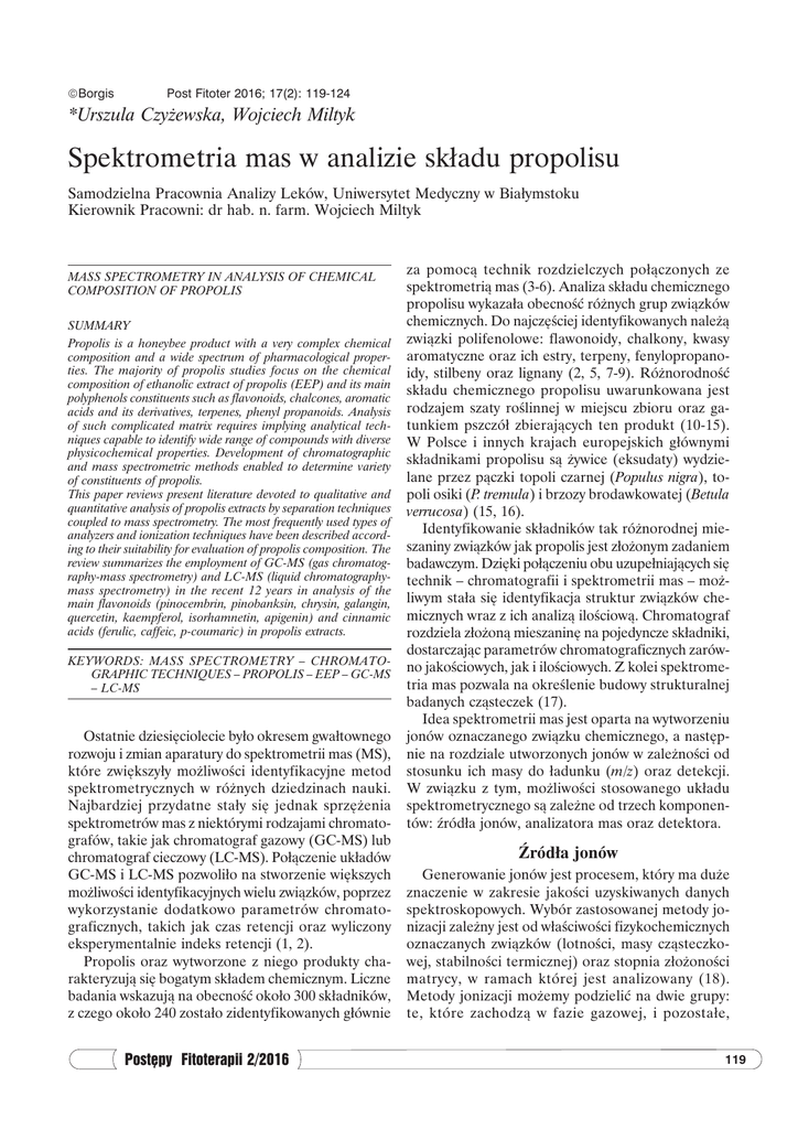 Borgis Post Fitoter 2016; 17(2): 119-124 *Urszula Czyżewska, Wojciech Miltyk Spektrometria mas w analizie składu propolisu Samodzielna Pracownia Analizy Leków, Uniwersytet Medyczny w Białymstoku Kierownik Pracowni: dr hab. n. farm. Wojciech Miltyk MASS SPECTROMETRY IN ANALYSIS OF CHEMICAL COMPOSITION OF PROPOLIS SUMMARY Propolis is a honeybee product with a very complex chemical composition and a wide spectrum of pharmacological properties. The majority of propolis studies focus on the chemical composition of ethanolic extract of propolis (EEP) and its main polyphenols constituents such as flavonoids, chalcones, aromatic acids and its derivatives, terpenes, phenyl propanoids. Analysis of such complicated matrix requires implying analytical techniques capable to identify wide range of compounds with diverse physicochemical properties. Development of chromatographic and mass spectrometric methods enabled to determine variety of constituents of propolis. This paper reviews present literature devoted to qualitative and quantitative analysis of propolis extracts by separation techniques coupled to mass spectrometry. The most frequently used types of analyzers and ionization techniques have been described according to their suitability for evaluation of propolis composition. The review summarizes the employment of GC-MS (gas chromatography-mass spectrometry) and LC-MS (liquid chromatographymass spectrometry) in the recent 12 years in analysis of the main flavonoids (pinocembrin, pinobanksin, chrysin, galangin, quercetin, kaempferol, isorhamnetin, apigenin) and cinnamic acids (ferulic, caffeic, p-coumaric) in propolis extracts. KEYWORDS: MASS SPECTROMETRY – CHROMATOGRAPHIC TECHNIQUES – PROPOLIS – EEP – GC-MS – LC-MS Ostatnie dziesięciolecie było okresem gwałtownego rozwoju i zmian aparatury do spektrometrii mas (MS), które zwiększyły możliwości identyfikacyjne metod spektrometrycznych w różnych dziedzinach nauki. Najbardziej przydatne stały się jednak sprzężenia spektrometrów mas z niektórymi rodzajami chromatografów, takie jak chromatograf gazowy (GC-MS) lub chromatograf cieczowy (LC-MS). Połączenie układów GC-MS i LC-MS pozwoliło na stworzenie większych możliwości identyfikacyjnych wielu związków, poprzez wykorzystanie dodatkowo parametrów chromatograficznych, takich jak czas retencji oraz wyliczony eksperymentalnie indeks retencji (1, 2). Propolis oraz wytworzone z niego produkty charakteryzują się bogatym składem chemicznym. Liczne badania wskazują na obecność około 300 składników, z czego około 240 zostało zidentyfikowanych głównie Postępy Fitoterapii 2/2016 za pomocą technik rozdzielczych połączonych ze spektrometrią mas (3-6). Analiza składu chemicznego propolisu wykazała obecność różnych grup związków chemicznych. Do najczęściej identyfikowanych należą związki polifenolowe: flawonoidy, chalkony, kwasy aromatyczne oraz ich estry, terpeny, fenylopropanoidy, stilbeny oraz lignany (2, 5, 7-9). Różnorodność składu chemicznego propolisu uwarunkowana jest rodzajem szaty roślinnej w miejscu zbioru oraz gatunkiem pszczół zbierających ten produkt (10-15). W Polsce i innych krajach europejskich głównymi składnikami propolisu są żywice (eksudaty) wydzielane przez pączki topoli czarnej (Populus nigra), topoli osiki (P. tremula) i brzozy brodawkowatej (Betula verrucosa) (15, 16). Identyfikowanie składników tak różnorodnej mieszaniny związków jak propolis jest złożonym zadaniem badawczym. Dzięki połączeniu obu uzupełniających się technik – chromatografii i spektrometrii mas – możliwym stała się identyfikacja struktur związków chemicznych wraz z ich analizą ilościową. Chromatograf rozdziela złożoną mieszaninę na pojedyncze składniki, dostarczając parametrów chromatograficznych zarówno jakościowych, jak i ilościowych. Z kolei spektrometria mas pozwala na określenie budowy strukturalnej badanych cząsteczek (17). Idea spektrometrii mas jest oparta na wytworzeniu jonów oznaczanego związku chemicznego, a następnie na rozdziale utworzonych jonów w zależności od stosunku ich masy do ładunku (m/z) oraz detekcji. W związku z tym, możliwości stosowanego układu spektrometrycznego są zależne od trzech komponentów: źródła jonów, analizatora mas oraz detektora. Źródła jonów Generowanie jonów jest procesem, który ma duże znaczenie w zakresie jakości uzyskiwanych danych spektroskopowych. Wybór zastosowanej metody jonizacji zależny jest od właściwości fizykochemicznych oznaczanych związków (lotności, masy cząsteczkowej, stabilności termicznej) oraz stopnia złożoności matrycy, w ramach której jest analizowany (18). Metody jonizacji możemy podzielić na dwie grupy: te, które zachodzą w fazie gazowej, i pozostałe, 119 Urszula Czyżewska, Wojciech Miltyk które służą do jonizacji niskolotnych i wielkocząsteczkowych związków. Pierwsza grupa obejmuje jonizację elektronową (EI) i jonizację chemiczną (CI) – najbardziej rozpowszechnione sposoby jonizacji, które znalazły zastosowanie w systemach GC-MS. Wymienione metody są wykorzystywane do jonizacji związków wykazujących nawet nieznaczną prężność par przy ciśnieniu około 10-6 tora i jednocześnie charakteryzujących się trwałością w temperaturze parowania (1). Do drugiej grupy możemy zaliczyć ewaporacyjne sposoby jonizacji: termorozpylanie (TE), elektrorozpylanie (ESI), jonizację chemiczną pod ciśnieniem atmosferycznym (APCI) oraz oparte na desorpcji próbki: bombardowanie szybkimi atomami (FAB) czy desorpcję laserową z udziałem matrycy (MALDI). Desorpcyjne metody jonizacji są technikami, w których substancje są bezpośrednio emitowane w postaci jonów z powierzchni fazy skondensowanej do fazy gazowej. Jonizacja strumieniem elektronów (EI) jest najstarszą i najczęściej stosowaną metodą w rutynowych analizach małocząsteczkowych, hydrofobowych i stabilnych termiczni