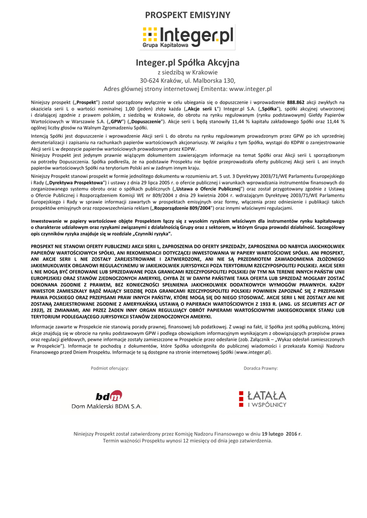 PROSPEKT EMISYJNY Integer.pl Spółka Akcyjna z siedzibą w Krakowie 30-624 Kraków, ul. Malborska 130, Adres głównej strony internetowej Emitenta: www.integer.pl Niniejszy prospekt („Prospekt”) został sporządzony wyłącznie w celu ubiegania się o dopuszczenie i wprowadzenie 888.862 akcji zwykłych na okaziciela serii L o wartości nominalnej 1,00 (jeden) złoty każda („Akcje serii L”) Integer.pl S.A. („Spółka”), spółki akcyjnej utworzonej i działającej zgodnie z prawem polskim, z siedzibą w Krakowie, do obrotu na rynku regulowanym (rynku podstawowym) Giełdy Papierów Wartościowych w Warszawie S.A. („GPW”) („Dopuszczenie”). Akcje serii L będą stanowiły 11,44 % kapitału zakładowego Spółki oraz 11,44 % ogólnej liczby głosów na Walnym Zgromadzeniu Spółki. Intencją Spółki jest dopuszczenie i wprowadzenie Akcji serii L do obrotu na rynku regulowanym prowadzonym przez GPW po ich uprzedniej dematerializacji i zapisaniu na rachunkach papierów wartościowych akcjonariuszy. W związku z tym Spółka, wystąpi do KDPW o zarejestrowanie Akcji serii L w depozycie papierów wartościowych prowadzonym przez KDPW. Niniejszy Prospekt jest jedynym prawnie wiążącym dokumentem zawierającym informacje na temat Spółki oraz Akcji serii L sporządzonym na potrzeby Dopuszczenia. Spółka podkreśla, że na podstawie Prospektu nie będzie przeprowadzała oferty publicznej Akcji serii L ani innych papierów wartościowych Spółki na terytorium Polski ani w żadnym innym kraju. Niniejszy Prospekt stanowi prospekt w formie jednolitego dokumentu w rozumieniu art. 5 ust. 3 Dyrektywy 2003/71/WE Parlamentu Europejskiego i Rady („Dyrektywa Prospektowa”) i ustawy z dnia 29 lipca 2005 r. o ofercie publicznej i warunkach wprowadzania instrumentów finansowych do zorganizowanego systemu obrotu oraz o spółkach publicznych („Ustawa o Ofercie Publicznej”) oraz został przygotowany zgodnie z Ustawą o Ofercie Publicznej i Rozporządzeniem Komisji WE nr 809/2004 z dnia 29 kwietnia 2004 r. wdrażającym Dyrektywę 2003/71/WE Parlamentu Europejskiego i Rady w sprawie informacji zawartych w prospektach emisyjnych oraz formy, włączenia przez odniesienie i publikacji takich prospektów emisyjnych oraz rozpowszechniania reklam („Rozporządzenie 809/2004”) oraz innymi właściwymi regulacjami. Inwestowanie w papiery wartościowe objęte Prospektem łączy się z wysokim ryzykiem właściwym dla instrumentów rynku kapitałowego o charakterze udziałowym oraz ryzykami związanymi z działalnością Grupy oraz z sektorem, w którym Grupa prowadzi działalność. Szczegółowy opis czynników ryzyka znajduje się w rozdziale „Czynniki ryzyka”. PROSPEKT NIE STANOWI OFERTY PUBLICZNEJ AKCJI SERII L, ZAPROSZENIA DO OFERTY SPRZEDAŻY, ZAPROSZENIA DO NABYCIA JAKICHKOLWIEK PAPIERÓW WARTOŚCIOWYCH SPÓŁKI, ANI REKOMENDACJI DOTYCZĄCEJ INWESTOWANIA W PAPIERY WARTOŚCIOWE SPÓŁKI. ANI PROSPEKT, ANI AKCJE SERII L NIE ZOSTAŁY ZAREJESTROWANE I ZATWIERDZONE, ANI NIE SĄ PRZEDMIOTEM ZAWIADOMIENIA ZŁOŻONEGO JAKIEMUKOLWIEK ORGANOWI REGULACYJNEMU W JAKIEJKOLWIEK JURYSDYKCJI POZA TERYTORIUM RZECZYPOSPOLITEJ POLSKIEJ. AKCJE SERII L NIE MOGĄ BYĆ OFEROWANE LUB SPRZEDAWANE POZA GRANICAMI RZECZYPOSPOLITEJ POLSKIEJ (W TYM NA TERENIE INNYCH PAŃSTW UNII EUROPEJSKIEJ ORAZ STANÓW ZJEDNOCZONYCH AMERYKI), CHYBA ŻE W DANYM PAŃSTWIE TAKA OFERTA LUB SPRZEDAŻ MOGŁABY ZOSTAĆ DOKONANA ZGODNIE Z PRAWEM, BEZ KONIECZNOŚCI SPEŁNIENIA JAKICHKOLWIEK DODATKOWYCH WYMOGÓW PRAWNYCH. KAŻDY INWESTOR ZAMIESZKAŁY BĄDŹ MAJĄCY SIEDZIBĘ POZA GRANICAMI RZECZYPOSPOLITEJ POLSKIEJ POWINIEN ZAPOZNAĆ SIĘ Z PRZEPISAMI PRAWA POLSKIEGO ORAZ PRZEPISAMI PRAW INNYCH PAŃSTW, KTÓRE MOGĄ SIĘ DO NIEGO STOSOWAĆ. AKCJE SERII L NIE ZOSTAŁY ANI NIE ZOSTANĄ ZAREJESTROWANE ZGODNIE Z AMERYKAŃSKĄ USTAWĄ O PAPIERACH WARTOŚCIOWYCH Z 1933 R. (ANG. US SECURITIES ACT OF 1933), ZE ZMIANAMI, ANI PRZEZ ŻADEN INNY ORGAN REGULUJĄCY OBRÓT PAPIERAMI WARTOŚCIOWYMI JAKIEGOKOLWIEK STANU LUB TERYTORIUM PODLEGAJĄCEGO JURYSDYKCJI STANÓW ZJEDNOCZONYCH AMERYKI. Informacje zawarte w Prospekcie nie stanowią porady prawnej, finansowej lub podatkowej. Z uwagi na fakt, iż Spółka jest spółką publiczną, której akcje znajdują się w obrocie na rynku podstawowym GPW i podlega obowiązkom informacyjnym wynikającym z obowiązujących przepisów prawa oraz regulacji giełdowych, pewne informacje zostały zamieszczone w Prospekcie przez odesłanie (zob. Załącznik – „Wykaz odesłań zamieszczonych w Prospekcie”). Informacje te pochodzą z dokumentów, które Spółka udostępniła do publicznej wiadomości i przekazała Komisji Nadzoru Finansowego przed Dniem Prospektu. Informacje te są dostępne na stronie internetowej Spółki (www.integer.pl). Podmiot oferujący: Doradca Prawny: Niniejszy Prospekt został zatwierdzony przez Komisję Nadzoru Finansowego w dniu 19 lutego 2016 r. Termin ważności Prospektu wynosi 12 miesięcy od dnia jego zatwierdzenia. SPIS TREŚCI SPIS TREŚCI CZĘŚĆ I – PODSUMOWANIE ................................................................................................................................7 CZĘŚĆ II - CZYNNIKI RYZYKA .............................................................................................................................. 25 1. CZYNNIKI RYZYKA ZWIĄZNE Z DZIAŁALNOŚCIĄ EMITENTA ................................................................................................. 25 1.1. Ryzyko związane z rozwojem Grupy Kapitałowej oraz nieosiągnięcia zakładanej skali działania ....................................... 25 1.2. Ryzyko związane z wdrażaniem strategii Grupy Kapitałowej .............................................................................................. 28 1.3. Ryzyko niepowodzenia planowanych inwestycji i przedsięwzięć ........................................................................................ 28 1.4.