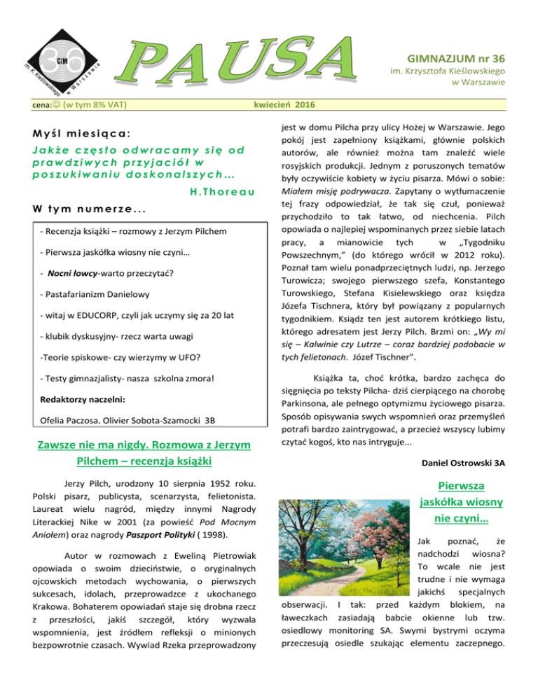 GIMNAZJUM nr 36 im. Krzysztofa Kieślowskiego w Warszawie cena: (w tym 8% VAT) kwiecień 2016 Myśl miesiąca: Jakże często odwracamy się od prawdziwych przyjaciół w poszukiwaniu doskonalszych… H.Thoreau W tym numerze... - Recenzja książki – rozmowy z Jerzym Pilchem - Pierwsza jaskółka wiosny nie czyni… - Nocni łowcy-warto przeczytać? - Pastafarianizm Danielowy - witaj w EDUCORP, czyli jak uczymy się za 20 lat - klubik dyskusyjny- rzecz warta uwagi -Teorie spiskowe- czy wierzymy w UFO? - Testy gimnazjalisty- nasza szkolna zmora! Redaktorzy naczelni: Ofelia Paczosa, Olivier Sobota-Szamocki 3B Opiekun: nie Pani ma Beata Nowogórska Zawsze nigdy. Rozmowa z Jerzym Pilchem – recenzja książki Jerzy Pilch, urodzony 10 sierpnia 1952 roku. Polski pisarz, publicysta, scenarzysta, felietonista. Laureat wielu nagród, między innymi Nagrody Literackiej Nike w 2001 (za powieść Pod Mocnym Aniołem) oraz nagrody Paszport Polityki ( 1998). Autor w rozmowach z Eweliną Pietrowiak opowiada o swoim dzieciństwie, o oryginalnych Redakcja PAUSY, opiekun: p. Beata Nowogórska ojcowskich metodach wychowania, o pierwszych sukcesach, idolach, przeprowadzce z ukochanego Krakowa. Bohaterem opowiadań staje się drobna rzecz z przeszłości, jakiś szczegół, który wyzwala wspomnienia, jest źródłem refleksji o minionych bezpowrotnie czasach. Wywiad Rzeka przeprowadzony jest w domu Pilcha przy ulicy Hożej w Warszawie. Jego pokój jest zapełniony książkami, głównie polskich autorów, ale również można tam znaleźć wiele rosyjskich produkcji. Jednym z poruszonych tematów były oczywiście kobiety w życiu pisarza. Mówi o sobie: Miałem misję podrywacza. Zapytany o wytłumaczenie tej frazy odpowiedział, że tak się czuł, ponieważ przychodziło to tak łatwo, od niechcenia. Pilch opowiada o najlepiej wspominanych przez siebie latach pracy, a mianowicie tych w „Tygodniku Powszechnym,” (do którego wrócił w 2012 roku). Poznał tam wielu ponadprzeciętnych ludzi, np. Jerzego Turowicza; swojego pierwszego szefa, Konstantego Turowskiego, Stefana Kisielewskiego oraz księdza Józefa Tischnera, który był powiązany z popularnych tygodnikiem. Ksiądz ten jest autorem krótkiego listu, którego adresatem jest Jerzy Pilch. Brzmi on: „Wy mi się – Kalwinie czy Lutrze – coraz bardziej podobacie w tych felietonach. Józef Tischner”. Książka ta, choć krótka, bardzo zachęca do sięgnięcia po teksty Pilcha- dziś cierpiącego na chorobę Parkinsona, ale pełnego optymizmu życiowego pisarza. Sposób opisywania swych wspomnień oraz przemyśleń potrafi bardzo zaintrygować, a przecież wszyscy lubimy czytać kogoś, kto nas intryguje... Daniel Ostrowski 3A Pierwsza jaskółka wiosny nie czyni… Jak poznać, że nadchodzi wiosna? To wcale nie jest trudne i nie wymaga jakichś specjalnych obserwacji. I tak: przed każdym blokiem, na ławeczkach zasiadają babcie okienne lub tzw. osiedlowy monitoring SA. Swymi bystrymi oczyma przeczesują osiedle szukając elementu zaczepnego. To także tajna broń policji, więc nie próbuj ich wykiwać. Jeśli więc zapomnisz, w jakim stanie wróciłeś do domu lub co zjadłeś na obiad, one na pewno to wiedzą. Następna rzecz to już klasyka w każdym polskim domu- porządki w norkach. Zimowy sen minął, trzeba wywietrzyć zatęchłe mieszkanko, powycierać kurze, wytrzepać dywany i coś tam jeszcze. I obowiązkowo umyć brykę i zobaczyć, czy opony zimowe leżą już w piwnicy. Sezon sportowy można będzie uznać za otwarty. Wypełznie ociężałe, rozleniwione, nieco przytyte towarzystwo. I bieganie, rower, rolki. Najpierw masa, potem rzeźba!!! A w przyrodzie? Motylki, kwiatki, tęcze, jednorożce! A na polskich chodnikach między pęknięciami płyt zacznie przebijać się Matka Natura kwitnąc na zielono. Ale co to? Pierwsze tygodnie wiosny sprawiają, że alergicy tęsknią za zimą. Jeśli zaś chodzi o modę… hm… objawią się nowe kolekcje, odkryte brzuszki, spodnie za ciasne, a serce pika. Zacznie się zrzucanie kilogramów, przymusowy fitness, a panowie? Już zakładają sandały z białymi skarpetkami… Sara Zalewska 2A Nocni łowcy Wyobraźcie sobie nasz zwyczajny świat. Nic niespotykanego. Teraz dodajcie do niego istoty nadprzyrodzone – wampiry, wilkołaki, czarowników, wróżki, anioły, demony. Zaczyna się robić ciekawie. Następnie dorzućcie mroczne tajemnice, walkę, zagadki. Tak powstaje Świat Nocnych Łowców – pół aniołów, pół ludzi. Chcę przybliżyć książki Cassandry Clare. Trzy serie – Dary Anioła, Diabelskie Maszyny i Mroczne Intrygi oraz kilka dodatków. Wszystko to jest ze sobą powiązane. Więc jak tu się nie pogubić? Odpowiedź jest prosta, trzeba czytać we właściwej kolejności. Zaczynamy od pierwszej serii – Darów Anioła. To ona jest początkiem do wszystkiego. Składa się z sześciu tomów. W największym skrócie opowiada historię dziewczyny żyjącej w Nowym Jorku – Clary Fray – która odkrywa prawdę o sobie i Świecie Cieni, czyli tym, co jest niewidoczne dla zwykłych ludzi, zwanych przyziemnymi. Pierwsza część to Miasto Kości. Potem czytamy do trzeciej lub piątej części. Ważne jest, żeby przed szóstym tomem – Miasto Niebiańskiego Ognia – przeczytać kolejną serię – Diabelskie Maszyny , ponieważ pojawiają się tam spojlery dotyczące jej. Składa się ona z trzech tomów. Opowiada o przodkach bohaterów z Darów Anioła. Wszystko dzieje się w XIX wiecznej Anglii, a główna bohaterka to Tessa Gray. Po przeczytaniu tych dwóch serii zaczynają się zagadki ( i schodki). Niestety w Polsce został wydany tylko jeden dodatek – Kroniki Bane’a. Opowiadają one historie z przeszłości Magnusa Bane’a, nieśmiertelnego czarownika pojawiającego się w każdej książce. Do tych nieprzetłumaczonych należą: - Kodeks Nocnych Łowców (Shadownter’s Codex), z którego czytelnik dowiaduje się więcej o ich zwyczajach i tradycjach; 