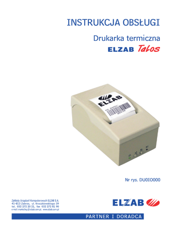 Redakcja 1.19 Spis treści 1. Wprowadzenie __________________________________________________ 2 2. Zawartość opakowania ___________________________________________ 3 3. Budowa ________________________________________________________ 3 4. Wymagania instalacyjne __________________________________________ 4 4.1. Miejsce ______________________________________________________ 4 4.2. Warunki klimatyczne otoczenia ___________________________________ 5 4.3. Zasilanie _____________________________________________________ 5 4.4. Pozycja pracy _________________________________________________ 5 5. Sygnalizatory i przyciski _____________________________________________ 6 6. Włączanie i wyłączanie drukarki____________________________________ 6 7. Podłączenie drukarki do komputera _________________________________ 7 7.1. Sekwencje sterujące ___________________________________________ 8 7.2. Zmiana programu pracy drukarki i generatora znaków________________ 10 8. Wymiana papieru _______________________________________________ 11 9. Test drukowania ________________________________________________ 12 10. Konserwacja drukarki __________________________________________ 12 11. Przechowywanie i transport______________________________________ 12 12. Specyfikacja techniczna ________________________________________ 13 2 Drukarka ELZAB Talos Instrukcja obsługi 1. Wprowadzenie Drukarka ELZAB Talos przeznaczona jest do drukowania na papierze termicznym z rolki o szerokości 58mm. wydruków w trybie tekstowym i graficznym. Drukarka posiada automatyczny obcinacz papieru który znacznie ułatwia obsługę. Obcinacz umożliwia cięcie pełne lub niepełne (do łatwego ręcznego oderwania). Konstrukcja drukarki umożliwia pracę drukarki w pozycji poziomej lub pionowej. Automatyczny obcinacz w połączeniu z możliwością pracy w pozycji pionowej umożliwia zastosowanie drukarki jako drukarki wydruków pobieranych bezpośrednio przez klienta. Możliwe jest także zawieszenie drukarki na ścianie. Zalety drukarki to: • wydruki tekstów o różnej wysokości liter i liczbie znaków w linii, wydruki grafiki • drukowanie kodów kreskowych, • automatyczne obcinanie papieru (pełne lub częściowe do odrywania), • duży pojemnik na papier – rolki o długości 60 metrów, • automatyczne zaciąganie papieru podczas zakładania nowej rolki, • praca w pozycji poziomej lub pionowej, możliwość zamocowania na ścianie, • zasilanie i dane przesyłane jednym kablem. 2. Zawartość opakowania 1. 2. Drukarka ELZAB Talos. Kabel połączeniowy drukarki z zasilaczem. 3. Rolka papieru termicznego 57mm/60m. 4. Instrukcja obsługi. 5. Nóżki gumowe samoprzylepne – 4 szt. Przed rozpoczęciem eksploatacji należy zapoznać się z instrukcją obsługi. 3. Budowa Budowa drukarki jest przedstawiona na rysunku poniżej. Złącze zewnętrzne, znajduje się od spodu drukarki. Instrukcja obsługi Drukarka ELZAB Talos 3 11 3 4 5 3 12 6 2 7 1 10 9 8 Rys.1 Drukarka Talos – budowa 1. 2. 3. 4. 5. 6. Podstawa drukarki Rolka papieru termicznego Szczelina wyjściowa papieru Mechanizm rozwijacza Drukarka termiczna Obcinacz papieru 7. 8. 9. 10. 11. 12. Sygnalizator końca papieru Przycisk wysuwu papieru Przycisk funkcyjny Sygnalizator załączenia drukarki Pokrywa drukarki Otwór na przewód łączący z PC i zasilaczem 4. Wymagania instalacyjne 4.1. Miejsce Drukarka może pracować w pomieszczeniach ogólnego przeznaczenia. Nie należy drukarki instalować w miejscu bezpośredniego narażenia na parę wodną oraz znaczne wahania temperatury. 4 Drukarka ELZAB Talos Instrukcja obsługi 4.2. Warunki klimatyczne otoczenia Temperatura 5°C ÷ 40°C Wilgotność (bez kondensacji) 40% ÷ 80% 4.3. Zasilanie Drukarka zasilana jest z zewnętrznego zasilacza sieciowego 230V/24V. Stabilizowane napięcie 24V doprowadzone jest do drukarki za pomocą kabla transmisji. Wymagania dla sieciowego zasilania elektrycznego: Napięcie znamionowe Częstotliwość Pobór prądu 220V – 230V 47 - 63 Hz około 0,1A 4.4. Pozycja pracy Drukarka przystosowana jest do pracy w pozycji poziomej lub pionowej na stole oraz w pozycji pionowej wiszącej (w podstawie znajdują się otwory służące do zawieszenia na ścianie, słupie itp.). Sposób zawieszenia drukarki: W ścianie należy wykonać 2 otwory wg szablonu umieszczonego na końcu instrukcji. Wkręcić do nich 2 wkręty Ø 3,5 do 4 mm, pozostawiając dystans pomiędzy łbem wkrętów a ścianą około 5 do 6 mm. Na wystające wkręty nałożyć drukarkę, przesunąć ją w dół do oporu, otworzyć pokrywę drukarki i dokręcić wkręty. Rys.2 Możliwe pozycje pracy drukarki oraz umiejscowienie otworów do zawieszenia W przypadku eksploatacji drukarki w pozycji pionowej stojącej należy na powierzchni, która będzie służyła za podstawę drukarki, nakleić 4 nóżki samoprzylepne Instrukcja obsługi Drukarka ELZAB Talos 5 dodane do wyposażenia drukarki. Rysunek pokazuje miejsca, w których należy nóżki przykleić. Rys.3 Miejsca naklejenia nóżek 5. Sygnalizatory i przyciski Rys.4 Opis przycisków i sygnalizatorów drukarki - Dioda LED (zielona) sygnalizująca załączenie drukarki. - Przycisk funkcyjny. Jeśli w buforze drukarki jest dokument, którego drukowanie zostało przerwane z powodu braku papieru, naciśnięcie klawisza spowoduje wydrukowanie tego dokumentu. W przypadku kiedy nie było wstrzymania drukowania a poprzednio był wykonywany wysuw papieru, naciśnięcie klawisza spowoduje częściowe obcięcie papieru. - Przycisk wysuwu papieru. - Dioda LED (żółta) sygnalizująca brak papieru lub podniesienie głowicy mechanizmu drukującego. Miganie diody oznacza obecność w buforze drukarki dokumentu, którego drukowanie zostało przerwane z powodu braku papieru. 6. Włączanie i wyłączanie drukarki Drukarka włączana jest przez wetknięcie wtyku zasilacza do gniazdka sieciowego instalacji elektrycznej (230V). Włączenie napięcia sygnalizowane jest zaświeceniem zielonej diod