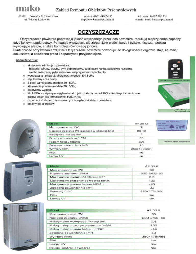 mako Zakład Remontu Obiektów Przemysłowych 62081 Poznań Przeżmierowo tel/fax (061) 8142855 tel. kom. 0602 780 131 ul. Wiosny Ludów 61 http;//www.mako.poznan.pl e.mail : [email protected] _______________________________________________________________________________________________________________ OCZYSZCZACZE Oczyszczacze powietrza poprawiają jakość wdychanego przez nas powietrza, redukują nieprzyjemne zapachy, takie jak dym papierosowy. Pomagają w pozbyciu się zarodników pleśni, kurzu i pyłków, niszczą roztocza wywołujące alergię, a także kontrolują równowagę jonową. Skuteczność oczyszczania 99,95%. Oczyszczone powietrze powoduje, że dolegliwości alergiczne stają się mniej dokuczliwe, a codzienna praca i odpoczynek przyjemniejsze. Charakterystyka: • • • • • • • • • skutecznie eliminuje z powietrza: bakterie, wirusy, grzyby, dym papierosowy, cząsteczki kurzu, szkodliwe roztocza, sierść zwierzęcą, pyłki kwiatowe, nieprzyjemne zapachy, itp. wbudowana lampa ultrafioletowa /modele 30 i 50R/, regulowany czas pracy, 3 biegi wentylatora /modele 30 i 50R/, sterowanie pilotem /modele 30 i 50R/, estetyczny wygląd, filtr HEPA z aktywnym węglem katalizuje i rozkłada ponad 90% szkodliwych chemicznie gazów takich jak formaldehyd, H2S, NH3, ozon i anion skutecznie usuwa dym i cząsteczki stałe z powietrza idealny dla alergików