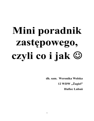 Mini poradnik zastępowego, czyli co i jak ☺ dh. sam. Weronika Wolska 12 WDW „Żagiel” Hufiec Lubań 1 Drogi zastępowy! Oddaję w Twoje ręce książeczkę, w której znajdziesz kilka podpowiedzi na temat prowadzenia zastępu. Niech Ci służy w pierwszych krokach w nowej roli. Baw się dobrze! ☺ SPIS TREŚCI 1. Zastęp – co to jest? Kilka porad i zadania zastępowego… str. 3/4 2. Przyrzeczenie harcerskie. Objaśnienia. ………………….. str. 5 3. Prawo harcerskie. Objaśnienia. ………………………….. str. 6 4. Symbolika harcerska. Krzyż, lilijka, „Czuwaj!”. ………... str.7 5. Zasady dobrej zbiórki. …………………………………… str.8 6. Czego uczyć zastęp? ……………………………………... str. 9 7. Tradycje. ……………………………………………. ...str. 10/11 8. Dokumentacja zastępu. ……………………………….…...str. 12 9. Podstawy pionierki; gry i zabawy. …………………….str. 13-16 10. Śpiewnik. …………………………………………......str. 17-19 2 Zastęp - co to jest? Zastęp to grupa wspaniałych przyjaciół, którzy razem działają, przeżywają przygody i wspólnie się bawią. Każdy jest dumny z przynależności właśnie do tego, a nie innego zastępu, tej jedynej i niepowtarzalnej „paczki". W takiej zaprzyjaźnionej kilkuosobowej grupie zawiązują się silne więzi. Każdy wie, że otaczają go ludzie, na których zawsze można polegać. A życie w zastępie powinno przygotować wszystkich do pracy w zespole, do wyrobienia cech, które są potrzebne dla członków dobrze zorganizowanej społeczności. Zastęp powinien składać się z 6-8 członków, bo taka liczba osób pozwala, aby wszyscy się dobrze poznali, a jednocześnie jest wystarczająco duża, aby móc w zespole podjąć się poważnych zadań w ramach pracy całej drużyny. Każdy musi się dobrze czuć w zastępie, więc powinien móc wybrać zastęp, do którego chce należeć. Zastępowy to specyficzna funkcja. Nie jest on dowódcą wojskowym - a rozkazuje i rządzi, nie jest nauczycielem - a uczy wielu ciekawych i pożytecznych rzeczy, nie jest rodzicem a wychowuje. Kim więc jest? Najlepiej chyba go przyrównać do starszego brata, który chętnie dzieli się swym doświadczeniem a także do przodownika w zabawach, grach, różnych zajęciach i pracach. To harcerz, która stoi na czele swojego zastępu. A oto zadania zastępowego: • • • • • • • Opracowuje plan pracy zastępu na dany okres oraz planuje szczegółowo poszczególne zbiórki zastępu. Prowadzi zaplanowane zbiórki. Organizuje wszelkie prace zastępu przez rozdzielanie zadań każdemu według jego umiejętności. Prowadzi dokumentację zastępu (książeczka zastępu, kronika zastępu). Bierze udział w radach drużyny, wnioskuje w sprawach członków swego zastępu. Dba o to, by członkowie zastępu zdobywali stopnie i sprawności, by osiągali dobre wyniki w szkole, by z harcerstwa wynieśli jak najwięcej radości i dobrych przeżyć. Wpływa na zastęp poza zbiórkami przez interesowanie się, czy wszystkie poczynania członków dokonują się po harcersku, według zasad Prawa Harcerskiego. DUCH ZASTĘPU Jak wprowadzić w zastępie odpowiednią atmosferę ? Przede wszystkim poprzez dobry przykład pogody ducha ze strony zastępowego i innych starszych członków zastępu. Starajcie się działać tak, aby ludzie słysząc nazwę waszego zastępu, wyobrażali sobie grupę ludzi niepodobną do żadnej innej. Możecie to osiągnąć poprzez przygotowywanie ciekawych zbiórek (w każdej powinno być coś super, choć jeden element, który naprawdę odróżniałby ją od zwykłych, koleżeńskich spotkań). Poza tym pomoże wam w tym posiadanie proporca zastępu, apteczki, oraz innego przydatnego sprzętu (np. biblioteczki zastępu), a także prowadzenie kroniki, stosowanie znaczków zastępu (na mundurach i sprzęcie), posiadanie własnego szyfru, piosenki 3 obrzędowej, okrzyku, przysięgi składanej za zaangażowanie w pracę zastępu i innych obrzędów (np. obrzędowe rozpoczęcie i zakończenie zbiórek, przyjęcie zuchów, tradycyjne funkcje w zastępie), obchodzenie rocznic i urodzin członków zastępu, służba prowadzona przez zastęp, posiadane trofea, rywalizacja i system nagród i kar w zastępie i indywidualne znaki graficzne harcerzy stosowane ze znakami patrolowymi w grach terenowych. Kilka porad dla zastępowego 1. 2. 3. 4. 5. 6. 7. Pamiętaj o bezpieczeństwie BAW SIĘ ! Bądź liderem nie dowódcą Słuchaj co mówią Twoi harcerscy "bracia / siostry" Wchodząc na zbiórkę zostaw wszystkie problemy za drzwiami Zawsze planuj zbiórkę - najlepiej zapisz co chcesz zrobić Załóż notes i zapisuj w nim zabawy, pląsy, piosenki - kiedy nie będziesz mieć pomysłu zawsze do niego możesz sięgnąć 8. Noś w kieszonce zapasowy guzik, igłę i nitkę 9. Zabierz na zbiórkę apteczkę 10. Podpisz rzeczy należące do Ciebie i zastępu - nie chcesz chyba żeby ktoś je "opodharcerzył" 11. Pamiętaj, że wszyscy na Ciebie patrzą - bądź dla nich wzorem 12. Działaj wraz z zastępem - nie stój obok 13. Kiedy czegoś nie lubi twój zastęp a musicie to wykonać - weź się do tego pierwszy/a 14. Bądź szczery 15. Nie wydawaj rozkazów - proś o wykonanie zadania 16. Pamiętaj, że w zastępie nie ma osób które "bardziej" lub "mniej" lubisz - to twoja "mała rodzina" 17. Pamiętaj, że jest drużynowy który chętnie Ci pomoże 18. Problemy w zastępie "zostają" w zastępie 19. Dobre uczynki nagradzaj a złe karaj. 4 PRZYRZECZENIE HACERSKIE: Mam szczerą wolę całym życiem pełnić służbę Bogu i Polsce, nieść chętną pomoc bliźnim i być posłuszną/posłusznym Prawu Harcerskiemu. MAM SZCZERĄ WOLĘ, to znaczy dobrowolnie, bez niczyjego nakazu, bez żadnego przymusu, CAŁYM ŻYCIEM, ze wszystkich sił mego ducha, z całego serca, wykorzystując wszystkie dane mi możliwości PEŁNIĆ S