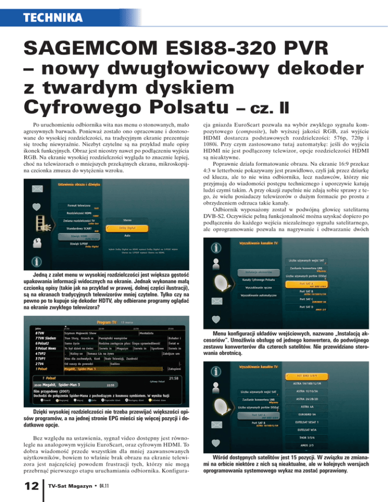 TECHNIKA SAGEMCOM ESI88-320 PVR – nowy dwugłowicowy dekoder z twardym dyskiem Cyfrowego Polsatu – cz. II Po uruchomieniu odbiornika wita nas menu o stonowanych, ma³o agresywnych barwach. Poniewa¿ zosta³o ono opracowane i dostosowane do wysokiej rozdzielczoœci, na tradycyjnym ekranie prezentuje siê trochê niewyraŸnie. Niezbyt czytelne s¹ na przyk³ad ma³e opisy ikonek funkcyjnych. Obraz jest nieostry nawet po pod³¹czeniu wyjœcia RGB. Na ekranie wysokiej rozdzielczoœci wygl¹da to znacznie lepiej, choæ na telewizorach o mniejszych przek¹tnych ekranu, mikroskopijna czcionka zmusza do wytê¿enia wzroku. cja gniazda EuroScart pozwala na wybór zwyk³ego sygna³u kompozytowego (composite), lub wy¿szej jakoœci RGB, zaœ wyjœcie HDMI dostarcza podstawowych rozdzielczoœci: 576p, 720p i 1080i. Przy czym zastosowano tutaj automatykê: jeœli do wyjœcia HDMI nie jest pod³¹czony telewizor, opcje rozdzielczoœci HDMI s¹ nieaktywne. Poprawnie dzia³a formatowanie obrazu. Na ekranie 16:9 przekaz 4:3 w letterboxie pokazywany jest prawid³owo, czyli jak przez dziurkê od klucza, ale to nie wina odbiornika, lecz nadawców, którzy nie przyjmuj¹ do wiadomoœci postêpu technicznego i uporczywie katuj¹ ludzi czymœ takim. A przy okazji zupe³nie nie zdaj¹ sobie sprawy z tego, ¿e wielu posiadaczy telewizorów o du¿ym formacie po prostu z obrzydzeniem odrzuca takie kana³y. Odbiornik wyposa¿ony zosta³ w podwójn¹ g³owicê satelitarn¹ DVB-S2. Oczywiœcie pe³n¹ funkcjonalnoœæ mo¿na uzyskaæ dopiero po pod³¹czeniu do ka¿dego wejœcia niezale¿nego sygna³u satelitarnego, ale oprogramowanie pozwala na nagrywanie i odtwarzanie dwóch Jedną z zalet menu w wysokiej rozdzielczości jest większa gęstość upakowania informacji widocznych na ekranie. Jednak wykonane małą czcionką opisy (takie jak na przykład w prawej, dolnej części ilustracji), są na ekranach tradycyjnych telewizorów mniej czytelne. Tylko czy na pewno po to kupuje się dekoder HDTV, aby odbierane programy oglądać na ekranie zwykłego telewizora? Menu konfiguracji układów wejściowych, nazwano „Instalacją akcesoriów”. Umożliwia obsługę od jednego konwertera, do podwójnego zestawu konwerterów dla czterech satelitów. Nie przewidziano sterowania obrotnicą. Dzięki wysokiej rozdzielczości nie trzeba przewijać większości opisów programów, a na jednej stronie EPG mieści się więcej pozycji i dodatkowe opcje. Bez wzglêdu na ustawienia, sygna³ video dostêpny jest równolegle na analogowym wyjœciu EuroScart, oraz cyfrowym HDMI. To dobra wiadomoœæ przede wszystkim dla mniej zaawansowanych u¿ytkowników, bowiem to w³aœnie brak obrazu na ekranie telewizora jest najczêœciej powodem frustracji tych, którzy nie mog¹ przebrn¹æ pierwszego etapu uruchamiania odbiornika. Konfigura- 12 TV-Sat Magazyn • 04.11 Wśród dostępnych satelitów jest 15 pozycji. W związku ze zmianami na orbicie niektóre z nich są nieaktualne, ale w kolejnych wersjach oprogramowania systemowego wykaz ma zostać poprawiony. TECHNIKA Zaprogramowane kana³y uk³adaj¹ siê na liœcie „Wszystkie”. To lista nie do edycji. U¿ytkownik mo¿e za to u³o¿yæ sobie osiem list „Ulubionych”. Ka¿da z nich ma ju¿ zdefiniowan¹ grupê kana³ów (Dla Abonentów i 4 x VoD Info), a ka¿dy z nich miejsce na liœcie. Nowe kana³y dodawane s¹ do listy Ulubionej sukcesywnie od pozycji 1. W kolejnoœci zale¿nej od u¿ytkownika, ale potem kana³ów na listach ulubionych nie mo¿na przesuwaæ. Choć w opcji „Wyszukiwania ręcznego” dostępne są satelity zdefiniowane w konfiguracji wejściowej, można wpisać dowolne parametry transpondera. Dlatego korzystając z ruchomej anteny, można skanować po kolei całą orbitę. Przynajmniej teoretycznie, bo w praktyce odbiornik nie znajduje kanałów z niektórych transponderów. Pewnym zaskoczeniem jest brak miernika jakości sygnału. Jest tylko paskowy wskaźnik siły sygnału, który reaguje dość wolno, natomiast zamiast wskaźnika jakości, są komunikaty (np. „Wysoka jakość sygnału”). Układanie listy Ulubionej. W opcji „Wyszukiwania automatycznego” można wybrać dowolnego ze zdefiniowanych w konfiguracji satelitów, ale zawsze pojedynczo. Można wybrać kanały wszystkie, albo tylko niekodowane. W menu wyboru trybu przeszukiwania, jest tylko tryb szybki, przeskanowanie Hot Birda w taki sposób trwało około dziesięciu minut. Czasem ręczne skanowanie daje wynik widoczny na ekranie (ilustracja dotyczy transpondera 10,719 GHz/V). Być może chodzi o to, że kanały z tego transpondera już są na liście. ró¿nych programów nawet przy pojedynczym sygnale. Oczywiœcie wówczas dostêpnoœæ kana³ów bêdzie ograniczona do tej samej czêœci pasma i tej samej polaryzacji. Ostatni¹ pozycj¹ w menu wyszukiwania kana³ów jest opcja „Kana³y Cyfrowego Polsatu”. Skorzystanie z niej trwa kilkadziesi¹t sekund. Nawigacjê po liœcie kana³ów i prezentacjê informacji o nadawanych programach mo¿na okreœliæ jako niestandardow¹. Zastosowana koncepcja odbiega nieco od przyjêtych zwyczajowo rozwi¹zañ, ale to musi oceniæ ka¿dy u¿ytkownik z osobna. W moim przypadku da³a o sobie znaæ si³a przyzwyczajenia i d³ugo nie mog³em siê przestawiæ. Tym bardziej, ¿e wiêkszoœæ urz¹dzeñ z których korzystam na co dzieñ, dzia³a jednak w oparciu o nieco inny porz¹dek. Wiêc komuœ, kto naby³ ju¿ mocnych nawyków, obs³uga tego dekodera mo¿e na pocz¹tku sprawiæ pewne problemy. Ale mo¿na siê przyzwyczaiæ. Jako ciekawostkê podam, ¿e ju¿ kiedyœ spotka³em siê z podobn¹ sytuacj¹. Chodzi³o o zmiany wprowadzone do obs³ugi pilota w jednej z wersji oprogramowania dla odbiornika Dreambox. Tam rozwi¹zano kwestiê przyzwyczajeñ u¿ytkowników instaluj¹c w menu opcjê umo¿liwiaj¹c¹ prze³¹czenie miêdzy koncepcj¹ „klasyczn¹”, a koncepcj¹ twórcy nowej wersji oprogramowania. Nie s¹dzê jednak, aby podobne rozwi¹zanie b