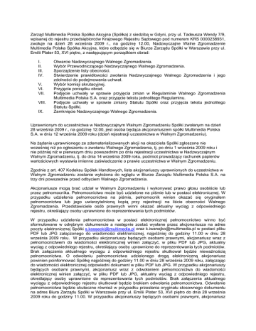 Zarząd Multimedia Polska Spółka Akcyjna (Spółka) z siedzibą w Gdyni, przy ul. Tadeusza Wendy 7/9, wpisanej do rejestru przedsiębiorców Krajowego Rejestru Sądowego pod numerem KRS 0000238931, zwołuje na dzień 28 września 2009 r., na godzinę 12.00, Nadzwyczajne Walne Zgromadzenie Multimedia Polska Spółka Akcyjna, które odbędzie się w Biurze Zarządu Spółki w Warszawie przy ul. Emilii Plater 53, XVI piętro, z następującym porządkiem obrad: I. II. III. IV. V. VI. VII. VIII. IX. Otwarcie Nadzwyczajnego Walnego Zgromadzenia. Wybór Przewodniczącego Nadzwyczajnego Walnego Zgromadzenia. Sporządzenie listy obecności. Stwierdzenie prawidłowości zwołania Nadzwyczajnego Walnego Zgromadzenia i jego zdolności do podejmowania uchwał. Wybór komisji skrutacyjnej. Przyjęcie porządku obrad. Podjęcie uchwały w sprawie przyjęcia zmian w Regulaminie Walnego Zgromadzenia Multimedia Polska S.A. oraz przyjęcie tekstu jednolitego Regulaminu. Podjęcie uchwały w sprawie zmiany Statutu Spółki oraz przyjęcia tekstu jednolitego Statutu Spółki. Zamknięcie Nadzwyczajnego Walnego Zgromadzenia. Uprawnionym do uczestnictwa w Nadzwyczajnym Walnym Zgromadzeniu Spółki zwołanym na dzień 28 września 2009 r., na godzinę 12.00, jest osoba będąca akcjonariuszem spółki Multimedia Polska S.A. w dniu 12 września 2009 roku (dzień rejestracji uczestnictwa w Walnym Zgromadzeniu). Na żądanie uprawnionego ze zdematerializowanych akcji na okaziciela Spółki zgłoszone nie wcześniej niż po ogłoszeniu o zwołaniu Walnego Zgromadzenia, tj. po dniu 1 września 2009 roku i nie później niż w pierwszym dniu powszednim po dniu rejestracji uczestnictwa w Nadzwyczajnym Walnym Zgromadzeniu, tj. do dnia 14 września 2009 roku, podmiot prowadzący rachunek papierów wartościowych wystawia imienne zaświadczenie o prawie uczestnictwa w Walnym Zgromadzeniu. Zgodnie z art. 407 Kodeksu Spółek Handlowych, lista akcjonariuszy uprawnionych do uczestnictwa w Walnym Zgromadzeniu zostanie wyłożona do wglądu w Biurze Zarządu Multimedia Polska S.A. na trzy dni powszednie przed odbyciem Walnego Zgromadzenia. Akcjonariusze mogą brać udział w Walnym Zgromadzeniu i wykonywać prawo głosu osobiście lub przez pełnomocnika. Pełnomocnictwo może być udzielone na piśmie lub w postaci elektronicznej. W przypadku udzielenia pełnomocnictwa na piśmie, pełnomocnik winien okazać się oryginałem pełnomocnictwa lub jego uwierzytelnioną kopią przy rejestracji na liście obecności Walnego Zgromadzenia. Przedstawiciele osób prawnych winni okazać aktualny wyciąg z odpowiedniego rejestru, określający osoby uprawnione do reprezentowania tych podmiotów. W przypadku udzielenia pełnomocnictwa w postaci elektronicznej pełnomocnictwo winno być sformułowane w odrębnym dokumencie a następnie zostać wysłane przez akcjonariusza na adres poczty elektronicznej Spółki [email protected] oraz [email protected] w postaci pliku PDF lub JPG załączonego do wiadomości elektronicznej, najpóźniej do godziny 11.00 w dniu 28 września 2009 roku. W przypadku akcjonariuszy będących osobami prawnymi, akcjonariusz wraz z pełnomocnictwem do wiadomości elektronicznej winien załączyć, w pliku PDF lub JPG, aktualny wyciąg z odpowiedniego rejestru, określający osoby uprawnione do reprezentowania tych podmiotów. Brak załączenia aktualnego wyciągu z odpowiedniego rejestru skutkował będzie nieważnością pełnomocnictwa. O odwołaniu pełnomocnictwa udzielonego drogą elektroniczną akcjonariusz powinien poinformować Spółkę najpóźniej do godziny 11.00 w dniu 28 września 2009 roku, załączając do wiadomości elektronicznej odpowiedni dokument w pliku PDF lub JPG. W przypadku akcjonariuszy będących osobami prawnymi, akcjonariusz wraz z odwołaniem pełnomocnictwa do wiadomości elektronicznej winien załączyć, w pliku PDF lub JPG, aktualny wyciąg z odpowiedniego rejestru, określający osoby uprawnione do reprezentowania tych podmiotów. Brak załączenia aktualnego wyciągu z odpowiedniego rejestru skutkował będzie brakiem odwołania pełnomocnictwa. Odwołanie pełnomocnictwa będzie skuteczne również w przypadku przesłania oryginału stosownego dokumentu na adres Biura Zarządu Spółki w Warszawie przy ul. Emilii Plater 53, XVI piętro do dnia 28 września 2009 roku do godziny 11.00. W przypadku akcjonariuszy będących osobami prawnymi, akcjonariusz wraz z odwołaniem pełnomocnictwa winien załączyć aktualny wyciąg z odpowiedniego rejestru, określający osoby uprawnione do reprezentowania tych podmiotów. Spółka udostępnia na swojej stronie internetowej www.multimedia.pl oraz w siedzibie Spółki formularze pozwalające na wykonywanie prawa głosu przez pełnomocnika. Osoby uprawnione do uczestnictwa w Walnym Zgromadzeniu będą mogły dokonać rejestracji i otrzymać karty do głosowania w dniu Walnego Zgromadzenia bezpośrednio przed Walnym Zgromadzeniem w sali obrad. Każdy z akcjonariuszy może podczas Walnego Zgromadzenia zgłaszać projekty uchwał dotyczące spraw wprowadzonych do porządku obrad. Akcjonariusz lub akcjonariusze reprezentujący co najmniej jedną dwudziestą kapitału zakładowego Spółki mogą żądać umieszczenia określonych spraw w porządku obrad Walnego Zgromadzenia. Żądanie powinno zostać zgłoszone Zarządowi Spółki nie później niż na dwadzieścia jeden dni przed wyznaczonym terminem Zgromadzenia, tj. do dnia 7 września 2009 roku. Żądanie powinno zawierać uzasadnienie lub projekt uchwały dotyczącej proponowanego punktu porządku obrad. Żądanie może zostać złożone w postaci elektronicznej na adres [email protected] oraz [email protected]. Do zgłoszonego żądania akcjonariusz lub zgłaszający akcjonariusze zobowiązani są dołączyć dokument potwierdzający reprezentowanie przez nich co najmniej jednej dwudziestej kapitału zakładowego Spółki. Akcjonariusz lub akcjonariusze reprezentujący co najmniej jed