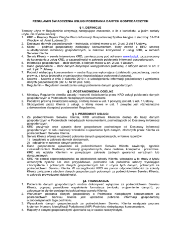 REGULAMIN ŚWIADCZENIA USŁUGI POBIERANIA DANYCH GOSPODARCZYCH § 1. DEFINICJE Terminy użyte w Regulaminie otrzymują następujące znaczenie, o ile z kontekstu, w jakim zostały użyte, nie wynika inaczej: 1. KRD – Krajowy Rejestr Długów Biuro Informacji Gospodarczej Spółka Akcyjna z siedzibą: 51-214 Wrocław, ul. Armii Ludowej 21. 2. Dostawca danych gospodarczych – instytucja, o której mowa w art. 2 ust. 2 pkt 7 Ustawy. 3. Klient – podmiot gospodarczy niebędący konsumentem, który zawarł z KRD umowę o udostępnienie informacji gospodarczych, w zakresie korzystania z usług KRD, w ramach Serwisu Klienta. 4. Serwis Klienta – serwis internetowy KRD, zamieszczony pod adresem www.krd.pl, przeznaczony do korzystania z usług KRD, w szczególności w zakresie pobierania informacji gospodarczych. 5. Informacja gospodarcza – zbiór danych, o których mowa w art. 2 ust. 1 Ustawy. 6. Dane gospodarcze – zbiór danych dotyczące wiarygodności płatniczej, o których mowa w art. 2 ust. 2 pkt 7 Ustawy. 7. Podmiot niebędący konsumentem – osoba fizyczna wykonująca działalność gospodarczą, osoba prawna, a także jednostka organizacyjna nieposiadająca osobowości prawnej. 8. Ustawa – Ustawa z dnia 9 kwietnia 2010 r. o udostępnianiu informacji gospodarczy i wymiennie danych gospodarczych (Dz. U. Nr 81 poz. 530). 9. Regulamin – Regulamin świadczenia usługi pobierania danych gospodarczych. § 2. POSTANOWIENIA OGÓLNE 1. Niniejszy Regulamin określa zasady i warunki świadczenia przez KRD usługi pobierania danych gospodarczych o Podmiotach niebędących konsumentami. 2. Podstawą prawną świadczenia usługi, o której mowa w ust. 1 powyżej jest art. 9 ust. 1 Ustawy. 3. Skorzystanie przez Klienta z usługi, o której mowa w ust. 1 powyżej jest różnoznaczne z dokonaniem akceptacji postanowień Regulaminu. § 3. PRZEDMIOT USŁUGI 1. Za pośrednictwem Serwisu Klienta, KRD umożliwia Klientom dostęp do bazy danych gospodarczych o Podmiotach niebędących konsumentami, pochodzących od Dostawcy informacji gospodarczych. 2. KRD przyjmuje oraz ujawnia dane gospodarcze pochodzące od Dostawcy informacji gospodarczych w celu realizacji wniosków o ujawnienie tych danych, złożonych przez Klienta za pośrednictwem Serwisu Klienta. 3. Serwis Klienta oferuje możliwość pobrania danych gospodarczych, w formie raportów: 1) bezpłatnie w zakresie danych skróconych, 2) odpłatnie w zakresie danych pełnych. 4. Dane gospodarcze ujawniane za pośrednictwem Serwisu Klienta zawierają, zgodnie z oświadczeniem Dostawcy informacji gospodarczych, dane rzetelne, kompletne i prawdziwe. KRD nie udziela Klientom w powyższym zakresie żadnych gwarancji wyraźnych lub dorozumianych. 5. KRD nie ponosi odpowiedzialności za jakiekolwiek szkody Klienta, włączając w to straty z tytułu utraconych zysków lub inne przypadkowe, pochodne lub pośrednie szkody wynikające z korzystania z pobranych danych gospodarczych lub z użycia tych danych, pobranych za pośrednictwem Serwisu Klienta. W szczególności KRD nie ponosi odpowiedzialności za szkody Klienta związane z użyciem danych gospodarczych pobranych za pośrednictwem Serwisu Klienta, w zakresie prowadzonej działalności. §4. TRANSAKCJA 1. Pobierania danych gospodarczych można dokonywać wyłącznie za pośrednictwem Serwisu Klienta, poprzez prawidłowe wypełnienie formularza (wniosku o ujawnienie danych), po zalogowaniu się do swojego indywidualnego panelu Klienta. 2. Warunkiem pobrania danych gospodarczy o Podmiocie niebędącym konsumentem za pośrednictwem Serwisu Klienta jest uprzednie pobranie informacji gospodarczej o zobowiązaniach tego podmiotu. 3. Wyszukanie danych gospodarczych za pośrednictwem Serwisu Klienta następuje poprzez kryterium Numeru Identyfikacji Podatkowej (NIP) Podmiotu niebędącego konsumentem. 4. Raporty z danymi gospodarczymi ujawniane są w czasie rzeczywistym. § 5. DOSTĘPNOSĆ USŁUGI 1. KRD zapewnia dostęp do danych gospodarczych w czasie i na zasadach określonych w Regulaminie tj. przez całą dobę, siedem dni w tygodniu, za wyjątkiem okresów: 1) wynikających z ograniczeń w dostępie narzuconych przez operatorów sieci, z których korzysta Klient, 2) awarii, będących wynikiem działań lub zaniechań osób trzecich, za które KRD nie ponosi odpowiedzialności, 3) konserwacji serwisu internetowego, nie krótszych niż łącznie 45 godzin w skali miesiąca. 2. KRD nie ponosi odpowiedzialności za niewykonanie lub nienależyte wykonanie zobowiązań wynikających z niniejszego Regulaminu, będące wynikiem siły wyższej tj. wystąpienia takich okoliczności, na które KRD nie miała wpływu, mimo zachowania należytej staranności. W przypadku wystąpienia siły wyższej wykonanie usługi zostaje zawieszone na okres równy okresowi działania siły wyższej. § 6. PŁATNOŚĆ 1. Za pobranie odpłatnego raportu, o którym mowa w § 3 ust. 2 pkt 2 Regulaminu, Klient zobowiązany jest do zapłaty ceny w wysokości określonej w aktualnym Cenniku dostępnym na stronach internetowych KRD, pod adresem www.krd.pl. Opłaty z tytułu pobierania płatnych raportów naliczane są za każdy miesiąc z dołu i doliczane są do opłat z wynikających z umowy o udostępnienie informacji gospodarczych. 2. KRD zastrzega sobie prawo zmiany ceny za ujawnienie danych gospodarczych, znajdującej się w ofercie, przeprowadzania i odwoływania akcji promocyjnych oraz wprowadzania w nich zmian. § 7. REKLAMACJE 1. Klientowi przysługuje prawo do składania reklamacji związanych z wykonywaniem przez KRD usługi ujawniania danych gospodarczych, określonej w niniejszym Regulaminie, niezgodnie z warunkami i zasadami w nim przedstawionymi. 2. Reklamacje można składać drogą elektroniczną, na adres e-mail: [email protected]. 3. Reklamacja winna zawierać dane Klienta, pozwalające na jego identyfikację oraz rzeczowy przedmiot reklamacji. 4. Z zakresu reklamacji wyłączone są niżej wymienione wady, ust