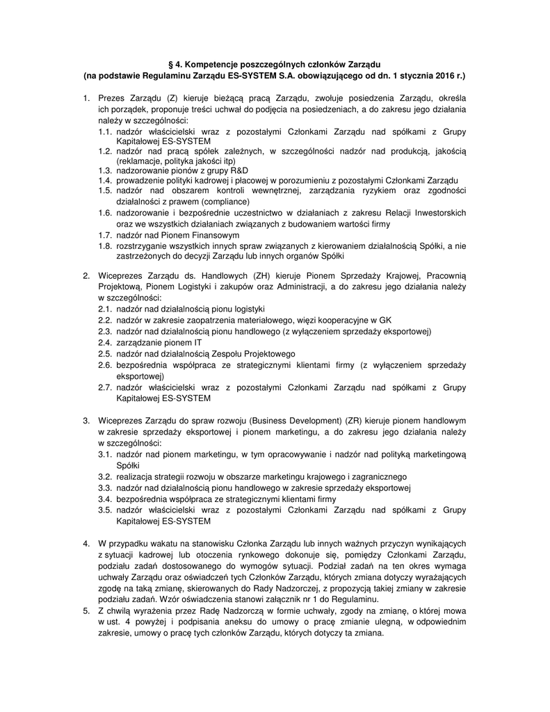 § 4. Kompetencje poszczególnych członków Zarządu (na podstawie Regulaminu Zarządu ES-SYSTEM S.A. obowiązującego od dn. 1 stycznia 2016 r.) 1. Prezes Zarządu (Z) kieruje bieżącą pracą Zarządu, zwołuje posiedzenia Zarządu, określa ich porządek, proponuje treści uchwał do podjęcia na posiedzeniach, a do zakresu jego działania należy w szczególności: 1.1. nadzór właścicielski wraz z pozostałymi Członkami Zarządu nad spółkami z Grupy Kapitałowej ES-SYSTEM 1.2. nadzór nad pracą spółek zależnych, w szczególności nadzór nad produkcją, jakością (reklamacje, polityka jakości itp) 1.3. nadzorowanie pionów z grupy R&D 1.4. prowadzenie polityki kadrowej i płacowej w porozumieniu z pozostałymi Członkami Zarządu 1.5. nadzór nad obszarem kontroli wewnętrznej, zarządzania ryzykiem oraz zgodności działalności z prawem (compliance) 1.6. nadzorowanie i bezpośrednie uczestnictwo w działaniach z zakresu Relacji Inwestorskich oraz we wszystkich działaniach związanych z budowaniem wartości firmy 1.7. nadzór nad Pionem Finansowym 1.8. rozstrzyganie wszystkich innych spraw związanych z kierowaniem działalnością Spółki, a nie zastrzeżonych do decyzji Zarządu lub innych organów Spółki 2. Wiceprezes Zarządu ds. Handlowych (ZH) kieruje Pionem Sprzedaży Krajowej, Pracownią Projektową, Pionem Logistyki i zakupów oraz Administracji, a do zakresu jego działania należy w szczególności: 2.1. nadzór nad działalnością pionu logistyki 2.2. nadzór w zakresie zaopatrzenia materiałowego, więzi kooperacyjne w GK 2.3. nadzór nad działalnością pionu handlowego (z wyłączeniem sprzedaży eksportowej) 2.4. zarządzanie pionem IT 2.5. nadzór nad działalnością Zespołu Projektowego 2.6. bezpośrednia współpraca ze strategicznymi klientami firmy (z wyłączeniem sprzedaży eksportowej) 2.7. nadzór właścicielski wraz z pozostałymi Członkami Zarządu nad spółkami z Grupy Kapitałowej ES-SYSTEM 3. Wiceprezes Zarządu do spraw rozwoju (Business Development) (ZR) kieruje pionem handlowym w zakresie sprzedaży eksportowej i pionem marketingu, a do zakresu jego działania należy w szczególności: 3.1. nadzór nad pionem marketingu, w tym opracowywanie i nadzór nad polityką marketingową Spółki 3.2. realizacja strategii rozwoju w obszarze marketingu krajowego i zagranicznego 3.3. nadzór nad działalnością pionu handlowego w zakresie sprzedaży eksportowej 3.4. bezpośrednia współpraca ze strategicznymi klientami firmy 3.5. nadzór właścicielski wraz z pozostałymi Członkami Zarządu nad spółkami z Grupy Kapitałowej ES-SYSTEM 4. W przypadku wakatu na stanowisku Członka Zarządu lub innych ważnych przyczyn wynikających z sytuacji kadrowej lub otoczenia rynkowego dokonuje się, pomiędzy Członkami Zarządu, podziału zadań dostosowanego do wymogów sytuacji. Podział zadań na ten okres wymaga uchwały Zarządu oraz oświadczeń tych Członków Zarządu, których zmiana dotyczy wyrażających zgodę na taką zmianę, skierowanych do Rady Nadzorczej, z propozycją takiej zmiany w zakresie podziału zadań. Wzór oświadczenia stanowi załącznik nr 1 do Regulaminu. 5. Z chwilą wyrażenia przez Radę Nadzorczą w formie uchwały, zgody na zmianę, o której mowa w ust. 4 powyżej i podpisania aneksu do umowy o pracę zmianie ulegną, w odpowiednim zakresie, umowy o pracę tych członków Zarządu, których dotyczy ta zmiana.