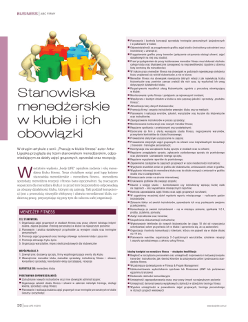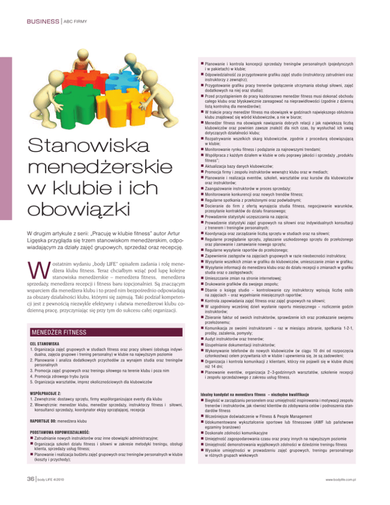 BUSINESS ABC FIRMY Stanowiska menedżerskie w klubie i ich obowiązki W drugim artykule z serii: „Pracuję w klubie fitness” autor Artur Ligęska przygląda się trzem stanowiskom menedżerskim, odpowiadającym za działy zajęć grupowych, sprzedaż oraz recepcję. W ostatnim wydaniu „body LIFE” opisa∏em zadania i rol´ mened˝era klubu fitness. Teraz chcia∏bym wziàç pod lup´ kolejne stanowiska mened˝erskie – mened˝era fitness, mened˝era sprzeda˝y, mened˝era recepcji i fitness baru (opcjonalnie). Sà znaczàcym wsparciem dla mened˝era klubu i to przed nim bezpoÊrednio odpowiadajà za obszary dzia∏alnoÊci klubu, którymi si´ zajmujà. Taki podzia∏ kompetencji jest z pewnoÊcià niezwykle efektywny i u∏atwia mened˝erowi klubu codziennà prac´, przyczyniajàc si´ przy tym do sukcesu ca∏ej organizacji. MENEDŻER FITNESS CEL STANOWISKA 1. Organizacja zajęć grupowych w studiach fitness oraz pracy siłowni (obsługa indywidualna, zajęcia grupowe i trening personalny) w klubie na najwyższym poziomie 2. Planowanie i analiza dodatkowych przychodów za wynajem studia oraz treningów personalnych 3. Promocja zajęć grupowych oraz treningu siłowego na terenie klubu i poza nim 4. Promocja zdrowego trybu życia 5. Organizacja warsztatów, imprez okolicznościowych dla klubowiczów WSPÓŁPRACUJE Z: 1. Zewnętrznie: dostawcy sprzętu, firmy współorganizujące eventy dla klubu 2. Wewnętrznie: menedżer klubu, menedżer sprzedaży, instruktorzy fitness i siłowni, konsultanci sprzedaży, koordynator ekipy sprzątającej, recepcja RAPORTUJE DO: menedżera klubu PODSTAWOWA ODPOWIEDZIALNOŚĆ: r Zatrudnianie nowych instruktorów oraz inne obowiązki administracyjne; r Organizacja szkoleń działu fitness i siłowni w zakresie metodyki treningu, obsługi klienta, sprzedaży usług fitness; r Planowanie i realizacja budżetu zajęć grupowych oraz treningów personalnych w klubie (koszty i przychody); 36 body LIFE 4I 2010 r Planowanie i kontrola koncepcji sprzedaży treningów personalnych (pojedynczych i w pakietach) w klubie; r Odpowiedzialność za przygotowanie grafiku zajęć studio (instruktorzy zatrudnieni oraz instruktorzy z zewnątrz); r Przygotowanie grafiku pracy trenerów (połączenie utrzymania obsługi siłowni, zajęć dodatkowych na niej oraz studia); r Przed przystąpieniem do pracy każdorazowo menedżer fitness musi dokonać obchodu całego klubu oraz błyskawicznie zareagować na nieprawidłowości (zgodnie z dzienną listą kontrolną dla menedżerów); r W trakcie pracy menedżer fitness ma obowiązek w godzinach największego obłożenia klubu znajdować się wśród klubowiczów, a nie w biurze; r Menedżer fitness ma obowiązek nawiązania dobrych relacji z jak największą liczbą klubowiczów oraz powinien zawsze znaleźć dla nich czas, by wysłuchać ich uwag dotyczących działalności klubu; r Rozpatrywanie wszelkich skarg klubowiczów, zgodnie z procedurą obowiązującą w klubie; r Monitorowanie rynku fitness i podążanie za najnowszymi trendami; r Współpraca z każdym działem w klubie w celu poprawy jakości i sprzedaży „produktu fitness”; r Aktualizacja bazy danych klubowiczów; r Promocja firmy i zespołu instruktorów wewnątrz klubu oraz w mediach; r Planowanie i realizacja eventów, szkoleń, warsztatów oraz kursów dla klubowiczów oraz instruktorów; r Zaangażowanie instruktorów w proces sprzedaży; r Monitorowanie konkurencji oraz nowych trendów fitness; r Regularne spotkania z przełożonymi oraz podwładnymi; r Docieranie do firm z ofertą wynajęcia studia fitness, negocjowanie warunków, przesyłanie kontraktów do działu finansowego; r Prowadzenie statystyki uczęszczania na zajęcia; r Prowadzenie statystyki zajęć grupowych na siłowni oraz indywidualnych konsultacji z trenerem i treningów personalnych; r Koordynacja oraz zarządzanie liczbą sprzętu w studiach oraz na siłowni; r Regularne przeglądanie sprzętu, zgłaszanie uszkodzonego sprzętu do przełożonego oraz planowanie i zamawianie nowego sprzętu; r Regularne wysyłanie raportów do przełożonego; r Zapewnienie zastępstw na zajęciach grupowych w razie nieobecności instruktora; r Wysyłanie wszelkich zmian w grafiku do klubowiczów, umieszczanie zmian w grafiku; r Wysyłanie informacji do menedżera klubu oraz do działu recepcji o zmianach w grafiku studia oraz o zastępstwach; r Umieszczanie zmian na stronie internetowej; r Drukowanie grafików dla swojego zespołu; r Dbanie o księgę studio – kontrolowanie czy instruktorzy wpisują liczbę osób na zajęciach – oraz wypełnianie miesięcznych raportów; r Kontrola zapowiadania zajęć fitness oraz zajęć grupowych na siłowni; r W uzgodniony wcześniej dzień wysłanie raportu miesięcznego – rozliczenie godzin instruktorów; r Zbieranie faktur od swoich instruktorów, sprawdzenie ich oraz przekazanie swojemu przełożonemu; r Komunikacja ze swoimi instruktorami – raz w miesiącu zebranie, spotkania 1-2-1, prośby, zażalenia, pomysły; r Audyt instruktorów oraz trenerów; r Uzupełnianie dokumentacji instruktorów; r Wykonywanie telefonów do nowych klubowiczów (w ciągu 10 dni od rozpoczęcia członkostwa) celem przywitania ich w klubie i upewnienia się, że są zadowoleni; r Organizacja i kontrola komunikacji z klientami, którzy nie pojawili się w klubie dłużej niż 14 dni; r Planowanie eventów, organizacja 2–3-godzinnych warsztatów, szkolenie recepcji i zespołu sprzedażowego z zakresu usług fitness. Idealny kandydat na menedżera fitness – niezbędne kwalifikacje r Biegłość w zarządzaniu personelem oraz umiejętność inspirowania i motywacji zespołu trenerów i instruktorów, jak również klientów do zdobywania celów i podnoszenia standardów fitness r Wcześniejsze doświadczenie w Fitness & People Management r Udokumentowane wykształcenie sportowe lub fitnessowe (AWF lub państwowe egzaminy branżowe) r Doskonałe zdolności komunikacyjn