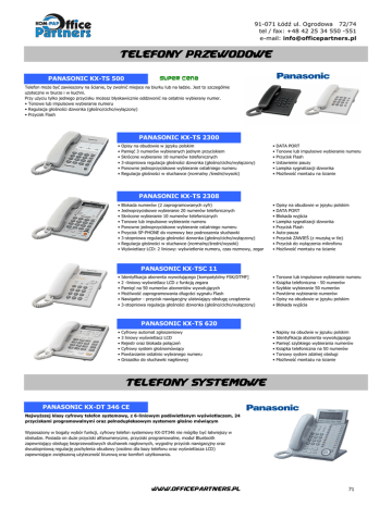 91-071 Łódź ul. Ogrodowa 72/74 tel / fax: +48 42 25 34 550 -551 e-mail: [email protected] TELEFONY PRZEWODOWE PANASONIC KX-TS 500 super cena Telefon może być zawieszony na ścianie, by zwolnić miejsce na biurku lub na ladzie. Jest to szczególnie użyteczne w biurze i w kuchni. Przy użyciu tylko jednego przycisku możesz błyskawicznie oddzwonić na ostatnio wybierany numer. • Tonowe lub impulsowe wybieranie numeru • Regulacja głośności dzwonka (głośno/cicho/wyłączony) • Przycisk Flash PANASONIC KX-TS 2300 • • • • • • Opisy na obudowie w języku polskim Pamięć 3 numerów wybieranych jednym przyciskiem Skrócone wybieranie 10 numerów telefonicznych 3-stopniowa regulacja głośności dzwonka (głośno/cicho/wyłączony) Ponowne jednoprzyciskowe wybieranie ostatniego numeru Regulacja głośności w słuchawce (normalny /średni/wysoki) • • • • • • • • • Blokada numerów (2 zaprogramowanych cyfr) Jednoprzyciskowe wybieranie 20 numerów telefonicznych Skrócone wybieranie 10 numerów telefonicznych Tonowe lub impulsowe wybieranie numeru Ponowne jednoprzyciskowe wybieranie ostatniego numeru Przycisk SP-PHONE do rozmowy bez podnoszenia słuchawki 3-stopniowa regulacja głośności dzwonka (głośno/cicho/wyłączony) Regulacja głośności w słuchawce (normalny/średni/wysoki) Wyświetlacz LCD: 2 liniowy: wyświetlenie numeru, czas rozmowy, zegar • • • • • • Identyfikacja abonenta wywołującego [kompatybilny FSK/DTMF] 2 -liniowy wyświetlacz LCD z funkcją zegara Pamięć na 50 numerów abonentów wywołujących Możliwość zaprogramowania długości sygnału Flash Nawigator - przycisk nawigacyjny ułatwiający obsługę urządzenia 3-stopniowa regulacja głośności dzwonka (głośno/cicho/wyłączony) • • • • • • Cyfrowy automat zgłoszeniowy 3 linowy wyświetlacz LCD Rejestr oraz blokada połączeń Cyfrowy system głośnomówiący Powtarzanie ostatnio wybranego numeru Gniazdko do słuchawki nagłównej • • • • • • DATA PORT Tonowe lub impulsowe wybieranie numeru Przycisk Flash Ustawienie pauzy Lampka sygnalizacji dzwonka Możliwość montażu na ścianie • • • • • • • • • Opisy na obudowie w języku polskim DATA PORT Blokada wyjścia Lampka sygnalizacji dzwonka Przycisk Flash Auto-pauza Przycisk ZAWIEŚ (z muzyką w tle) Przycisk do wyłączenia mikrofonu Możliwość montażu na ścianie • • • • • • Tonowe lub impulsowe wybieranie numeru Książka telefoniczna - 50 numerów Szybkie wybieranie 50 numerów Powtórne wybieranie numerów Opisy na obudowie w języku polskim Blokada wyjścia • • • • • • Napisy na obudwie w jęzuku polskim Identyfikacja abonenta wywołującego Pamięć szybkiego wybierania numerów Książka telefoniczna na 50 numerów Tonowy system zdalnej obsługi Możliwość montażu na ścianie PANASONIC KX-TS 2308 PANASONIC KX-TSC 11 PANASONIC KX-TS 620 TELEFONY SYSTEMOWE PANASONIC KX-DT 346 CE Najwyższej klasy cyfrowy telefon systemowy, z 6-liniowym podświetlanym wyświetlaczem, 24 przyciskami programowalnymi oraz pełnodupleksowym systemem głośno mówiącym Wyposażony w bogaty wybór funkcji, cyfrowy telefon systemowy KX-DT346 nie mógłby być łatwiejszy w obsłudze. Posiada on duże przyciski alfanumeryczne, przyciski programowalne, moduł Bluetooth zapewniający obsługę bezprzewodowych słuchawek nagłownych, wygodny przycisk nawigacyjny oraz dwustopniową regulację pochylenia obudowy (osobno dla bazy telefonu oraz wyświetlacza LCD) zapewniające zwiększoną użyteczność biurową oraz komfort użytkowania. www.officepartners.pl 71