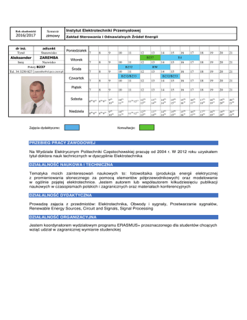 Rok akademicki Semestr Instytut Elektrotechniki Przemysłowej 2016/2017 zimowy Zakład Sterowania i Odnawialnych Źródeł Energii dr inż. Tytuł adiunkt Stanowisko Aleksander ZAREMBA Imię Nazwisko Pokój B237 Tel. 34 3250 827 [email protected] Poniedziałek Wtorek Środa Czwartek Piątek Sobota Niedziela 7 8 9 10 11 12 13 14 15 B237 7 8 9 10 11 12 B232 13 16 17 18 19 20 21 16 17 18 19 20 21 E4 14 15 RW 7 8 9 10 11 B232/B233 12 13 14 15 16 B232/B233 17 18 19 20 21 7 8 9 10 11 12 13 14 15 16 17 18 19 20 21 7 8 9 10 11 12 13 14 15 16 17 18 19 20 21 800-845 850-935 9451030 10351120 1130-1215 12201305 13151400 14051450 15001545 15501635 16451730 17351820 18301915 19202005 20152100 800-845 850-935 9451030 10351120 1130-1215 12201305 13151400 14051450 15001545 15501635 16451730 17351820 18301915 19202005 20152100 Zajęcia dydaktyczne: Konsultacje: PRZEBIEG PRACY ZAWODOWEJ Na Wydziale Elektrycznym Politechniki Częstochowskiej pracuję od 2004 r. W 2012 roku uzyskałem tytuł doktora nauk technicznych w dyscyplinie Elektrotechnika DZIAŁALNOŚĆ NAUKOWA I TECHNICZNA Tematyka moich zainteresowań naukowych to: fotowoltaika (produkcja energii elektrycznej z promieniowania słonecznego za pomocą elementów półprzewodnikowych) oraz modelowanie w ogólnie pojętej elektrotechnice. Jestem autorem lub współautorem kilkudziesięciu publikacji naukowych w czasopismach polskich i zagranicznych oraz materiałach konferencyjnych DZIAŁALNOŚĆ DYDAKTYCZNA Prowadzę zajęcia z przedmiotów: Elektrotechnika, Obwody i sygnały, Przetwarzanie sygnałów, Renewable Energy Sources, Circuit and Signals, Signal Processing DZIAŁALNOŚĆ ORGANIZACYJNA Jestem koordynatorem wydziałowym programu ERASMUS+ przeznaczonego dla studentów chcących wziąć udział w zagranicznej wymianie studenckiej