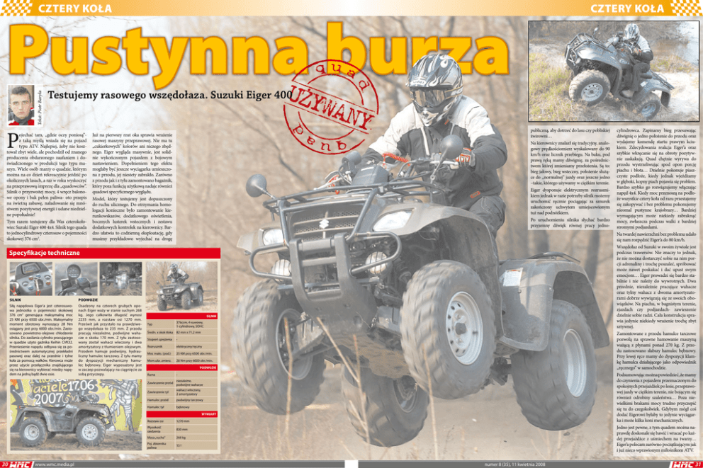 CZTERY KOŁA CZTERY KOŁA Tekst: Piotr Baryła Pustynna burza Testujemy rasowego wszędołaza. Suzuki Eiger 400 P ojechać tam, „gdzie oczy poniosą”z taką myślą wsiada się na pojazd typu ATV. Najlepiej, żeby nie kosztował zbyt wiele, ale pochodził od znanego producenta obdarzonego zaufaniem i doświadczonego w produkcji tego typu maszyn. Wiele osób marzy o quadzie, którym można na co dzień rekreacyjnie jeździć po okolicznych lasach, a raz w roku wyskoczyć na przeprawową imprezę dla „quadowców”. Silnik o przyzwoitej mocy, 4 wręcz balonowe opony i bak pełen paliwa- oto przepis na świetną zabawę, naładowanie się mnóstwem pozytywnej energii i udane niedzielne popołudnie! Tym razem testujemy dla Was czterokołowiec Suzuki Eiger 400 4x4. Silnik tego quada to jednocylindrowy czterosuw o pojemności skokowej 376 cm3. publiczną, aby dotrzeć do lasu czy pobliskiej żwirowni… Na kierownicy znalazł się tradycyjny, analogowy prędkościomierz wyskalowany do 90 km/h oraz licznik przebiegu. Na baku, pod prawą ręką mamy dźwignię, za pośrednictwem której zmieniamy przełożenia. Są to: bieg jałowy, bieg wsteczny, położenie służące do „normalnej” jazdy oraz jeszcze jedno –takie, którego używamy w ciężkim terenie. Eiger dysponuje elektrycznym rozrusznikiem jednak w razie potrzeby silnik możemy uruchomić ręcznie pociągając za sznurek zakończony uchwytem umiejscowionym tuż nad podnóżkiem. Po uruchomieniu silnika słychać bardzo przyjemny dźwięk równej pracy jedno- Już na pierwszy rzut oka sprawia wrażenie rasowej maszyny przeprawowej. Nie ma tu „cukierkowych” kolorów ani niczego zbędnego. Eiger wygląda masywnie, jest solidnie wykończonym pojazdem z bojowym nastawieniem. Dopełnieniem tego efektu mogłaby być jeszcze wyciągarka umieszczona z przodu, jej niestety zabrakło. Zarówno z przodu jak i z tyłu zamontowano bagażnik, który poza funkcją użytkową nadaje również quadowi specyficznego wyglądu. Model, który testujemy jest dopuszczony do ruchu ulicznego. Do otrzymania homologacji konieczne było zamontowanie kierunkowskazów, dodatkowego oświetlenia, bocznych lusterek wstecznych i zestawu dodatkowych kontrolek na kierownicy. Bardzo ułatwia to codzienną eksploatację, gdy musimy przykładowo wyjechać na drogę Specyfikacje techniczne Silnik podwozie Siłą napędowa Eiger’a jest czterosuwowa jednostka o pojemności skokowej 376 cm3 generująca maksymalną moc 25 KM przy 6500 obr./min. Maksymalny moment obrotowy wynoszący 28 Nm osiągany jest przy 6000 obr./min. Zastosowano powietrzno-olejowe chłodzenie silnika. Do zasilania cylindra pracującego w quadzie użyto gaźnika Keihin CVK32. Przeniesienie napędu odbywa się za pośrednictwem automatycznej przekładni pasowej oraz dalej na przednie i tylne koła za pomocą wałków. Kierowca może przez użycie przełącznika znajdującego się na kierownicy wybierać miedzy napędem na jedną bądź dwie osie. Osadzony na czterech grubych oponach Eiger waży w stanie suchym 268 kg. Jego całkowita długość wynosi 2235 mm, a rozstaw osi 1270 mm. Prześwit jak przystało na prawdziwego wszędołaza to 235 mm. Z przodu pracują niezależne, podwójne wahacze o skoku 170 mm. Z tyłu zastosowany został wahacz wleczony i dwa amortyzatory z tłumieniem olejowym. Przodem hamuje podwójny, hydrauliczny hamulec tarczowy. Z tyłu mamy do dyspozycji mechaniczny hamulec bębnowy. Eiger wyposażony jest w zaczep pozwalający na ciągnięcie za sobą przyczepy. SILNIK Typ 376ccm, 4-suwowy, 1-cylindrowy, SOHC Średn. x skok tłoka 82 mm x 71,2 mm Stopień sprężenia - Rozrusznik elektryczny/ręczny Moc maks. (pod.) 25 KM przy 6500 obr./min. Mom.obr. zmierz. 28 Nm przy 6000 obr./min. PODWOZIE Rama - Zawieszenie przód niezależne, podwójne wahacze Zawieszenie tył wahacz wleczony, 2 amortyzatory Hamulec przód podwójny tarczowy Hamulec tył bębnowy WYMIARY 30 www.wmc.media.pl Rozstaw osi 1270 mm Wysokość siedzenia 830 mm Masa „sucha” 268 kg Poj. zbiornika paliwa 15 l numer 8 (35), 11 kwietnia 2008 cylindrowca. Zapinamy bieg przesuwając dźwignię o jedno położenie do przodu oraz wydajemy komendę startu prawym kciukiem. Zdecydowania reakcja Eiger’a oraz szybkie wkręcanie się na obroty pozytywnie zaskakują. Quad chętnie wyrywa do przodu wystrzeliwując spod opon porcję piachu i błota… Dzielnie pokonuje piaszczyste podłoże, kiedy jednak wjeżdżamy w głęboki, kopny piach pojawia się problem. Bardzo szybko go rozwiązujemy włączając napęd 4x4. Kiedy moc przenoszą na podłoże wszystkie cztery koła od razu przestajemy się zakopywać i bez problemu pokonujemy nieomal pustynne krajobrazy… Bardziej wymagającym może niekiedy zabraknąć mocy, zwłaszcza podczas walki z bardziej stromymi podjazdami. Na twardej nawierzchni bez problemu udało się nam rozpędzić Eiger’a do 80 km/h. Wszędołaz od Suzuki w swoim żywiole jest podczas trawersów. Nie znaczy to jednak, że nie można dostarczyć sobie na nim porcji adrenaliny i trochę poszaleć, spróbować może nawet poskakać i dać upust swym emocjom… Eiger prowadzi się bardzo stabilnie i nie należy do wywrotnych. Dwa przednie, niezależnie pracujące wahacze oraz tylny wahacz z dwoma amortyzatorami dobrze wywiązują się ze swoich obowiązków. Na piachu, w bagnistym terenie, zjazdach czy podjazdach- zawieszenie dzielnie sobie radzi. Cała konstrukcja sprawia jedynie niekiedy wrażenie trochę zbyt sztywnej. Zamontowane z przodu hamulce tarczowe pozwolą na sprawne hamowanie maszyną ważącą z płynami ponad 270 kg. Z przodu zastosowano słabszy hamulec bębnowy. Przy lewej ręce mamy do dyspozycji klamkę hamulca działającego jako odpowiednik „ręcznego” w samochodzie. Podsumowując można powiedzieć, że mamy do czynienia z pojazdem przeznaczonym do spokojnych przejażdżek po lesie, przeprawowej jazdy w ciężkim terenie, nie bojącym się również odrobiny szaleństwa