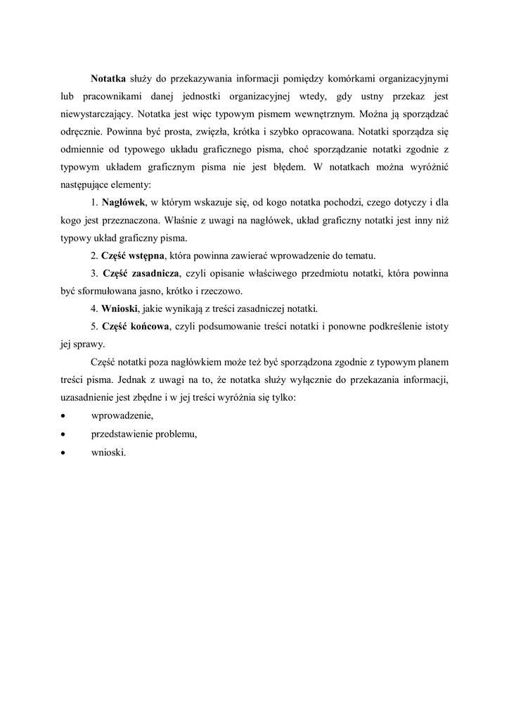 Notatka służy do przekazywania informacji pomiędzy komórkami organizacyjnymi lub pracownikami danej jednostki organizacyjnej wtedy, gdy ustny przekaz jest niewystarczający. Notatka jest więc typowym pismem wewnętrznym. Można ją sporządzać odręcznie. Powinna być prosta, zwięzła, krótka i szybko opracowana. Notatki sporządza się odmiennie od typowego układu graficznego pisma, choć sporządzanie notatki zgodnie z typowym układem graficznym pisma nie jest błędem. W notatkach można wyróżnić następujące elementy: 1. Nagłówek, w którym wskazuje się, od kogo notatka pochodzi, czego dotyczy i dla kogo jest przeznaczona. Właśnie z uwagi na nagłówek, układ graficzny notatki jest inny niż typowy układ graficzny pisma. 2. Część wstępna, która powinna zawierać wprowadzenie do tematu. 3. Część zasadnicza, czyli opisanie właściwego przedmiotu notatki, która powinna być sformułowana jasno, krótko i rzeczowo. 4. Wnioski, jakie wynikają z treści zasadniczej notatki. 5. Część końcowa, czyli podsumowanie treści notatki i ponowne podkreślenie istoty jej sprawy. Część notatki poza nagłówkiem może też być sporządzona zgodnie z typowym planem treści pisma. Jednak z uwagi na to, że notatka służy wyłącznie do przekazania informacji, uzasadnienie jest zbędne i w jej treści wyróżnia się tylko: wprowadzenie, przedstawienie problemu, wnioski. 1. Notatka według typowego układu graficznego Specjalista ds. transportu inż. Jan Król Toruń, dnia 13.01.2009 roku DT-V-2/134/2009 Kierownik Dział Płac Przedsiębiorstwo Budowlane "BUDMON" w Toruniu Sprawa: notatka w sprawie przekazania informacji do naliczenia wynagrodzenia 2. Notatka z nagłówkiem Toruń, dnia 13 stycznia 2009 roku Notatka specjalisty ds. transportu inż. Jana Kowalskiego w sprawie przekazania informacji do naliczenia wynagrodzenia DT-V-2/134/2009 Kierownik Działu Płac Przedsiębiorstwo Budowlane "BUDMOT" w Toruniu Z uwagi na to, że nagłówek może nie mieścić się z lewej strony i częściowo dochodzić do prawej, miejsce i datę sporządzania pisma należy umieścić pomiędzy ostatnim wierszem tekstu a podpisami, bezpośrednio przy lewym marginesie. Notatka specjalisty ds. transportu inż. Jana Kowalskiego w sprawie przekazania informacji do naliczenia wynagrodzenia DT-V-2/134/2009 Kierownik Działu Płac Przedsiębiorstwo Budowlane "BUDMOT" w Toruniu Treść notatki Toruń, dnia 13 stycznia 2009 roku Podpisy Do notatek zalicza się również zapisywanie treści skarg i wniosków interesantów oraz rozmów telefonicznych. W formie notatki zapisuje się też przyjmowane telefonogramy. Notatka telefoniczna to zapisana treść wiadomości przekazanej telefonicznie pod nieobecność jej adresata, np. przez sekretarkę w czasie nieobecności szefa. Notatka taka może być sporządzona odręcznie, najlepiej jeszcze w trakcie rozmowy. Powinna zawierać: datę i godzinę przyjęcia, stanowisko, imię i nazwisko telefonującego, treść przekazanej wiadomości, stanowisko, imię i nazwisko oraz podpis przyjmującego. Telefonogram to informacja przekazana telefonicznie i spisana, potwierdzona podpisem przez osobę przyjmującą. Telefonogram powinien być zredagowany krótko, zwięźle i jasno. Przy jego sporządzaniu obowiązują zasady sporządzania notatek. Sposób przekazywania telefonogramu jest następujący: nadający odczytuje jego treść, odbierający zapisuje ją, następnie odbierający odczytuje zapis, a nadający sprawdza jego zgodność w celu sprawdzenia prawidłowości odbioru. W telefonogramie należy odnotować imię, nazwisko i stanowisko osoby nadającej i przyjmującej telefonogram oraz datę i godzinę jego przekazania. Notatka ( 1 ) Specjalista ds. transportu inż. Jan Król Toruń, dnia 03 stycznia 2009 roku DT-V-2/134/2009 Kierownik Działu Płac Przedsiębiorstwo Budowlane "BUDMOT" w Toruniu Sprawa: przekazanie informacji do naliczania wynagrodzenia Uprzejmie informuję, że w grudniu 2008 roku kierowca Marian Lato przepracował 188 godzin, w tym 36 godzin to godziny nadliczbowe, z czego 22 godziny z dodatkiem 50%,a 14 to godziny opłacane dodatkiem 100%. Jednocześnie informujemy, że stawka osobistego zaszeregowania ww. pracownika wynosi 8,20 zł, a jego premia regulaminowa to 15% wynagrodzenia zasadniczego. Informuję też, że w grudniu 2008 roku Marian Lato przepracował cały miesiąc, nie przebywając ani jednego dnia na urlopie czy zwolnieniu lekarskim. Biorąc powyższe pod uwagę, proszę o wyliczenie jego wynagrodzenia za grudzień 2008 roku. Specjalista ds. transportu /inż. Jan Król/ Notatka ( 2 ) Toruń, dnia 03 stycznia 2009 roku Notatka specjalisty ds. transportu inż. Jana Króla w sprawie przekazania informacji do naliczenia wynagrodzenia DT-V-2/134/2009 Kierownik Działu Płac Przedsiębiorstwo Budowlane „BUDMOT" w Toruniu Uprzejmie informuję, że w grudniu 2008 roku kierowca Marian Lato przepracował 188 godzin, w tym 36 godzin to godziny nadliczbowe, z czego 22 godziny z dodatkiem 50%, a 14 to godziny opłacane dodatkiem 100%. Jednocześnie informujemy, że stawka osobistego zaszeregowania ww. pracownika wynosi 8,20 zł, a jego premia regulaminowa to 15% wynagrodzenia zasadniczego. Informuję też, że w grudniu 2008 roku Marian Lato przepracował cały miesiąc, nie przebywając ani jednego dnia na urlopie czy zwolnieniu lekarskim. Biorąc powyższe pod uwagę, proszę o wyliczenie jego wynagrodzenia za grudzień 2008 roku. Specjalista ds. transportu /inż. Jan Król/ Notatka ( 3) Notatka specjalisty ds. transportu inż. Jana Króla w sprawie przekazania informacji do naliczania wynagrodzenia DT-V-2/134/2009 Kierownik Działu Płac Przedsiębiorstwo Budowlane "BUDMOT" w Toruniu Uprzejmie informuję, że w grudniu 2008 roku kierowca Marian Lato przepracował 188 godzin, w tym 36 godzin to godziny nadliczbowe, z czego 22 godziny z dodatkiem 50%, a 14 to godziny opłacane dodatkiem 100%. Jednocześnie informujemy, że stawk