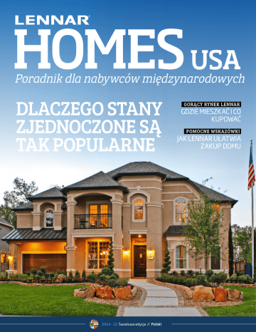 HOMES USA Poradnik dla nabywców międzynarodowych DLACZEGO STANY ZJEDNOCZONE SĄ TAK POPULARNE 2014 - 15 Światowa edycja // Polski GORĄCY RYNEK LENNAR. GDZIE MIESZKAĆ I CO KUPOWAĆ POMOCNE WSKAZÓWKI. JAK LENNAR UŁATWIA ZAKUP DOMU 1 ZNAJDOWANIE TWOJEGO DOMU W STANACH ZJEDNOCZONYCH Składająca się z 50 stanów, setek miast i tysięcy miejsc Ameryka oferuje panoramę wyborów mieszkaniowych, położeń geograficznych i stylów życia. Duże metropolie. Urocze miasteczka. Brzegi jezior. Wybrzeża. Wzgórza i góry. Bujne równiny. Luksusowe kurorty. Co tylko chcesz. To może być twój następny dom. 2 3 W PORADNIKU DLA BUDOWNICZYCH Strona 6 Ponieważ międzynarodowi nabywcy coraz częściej inwestują dolary w nieruchomości w Stanach Zjednoczonych, firma Lennar jest dobrze przygotowana do zaspokojenia ich potrzeb. To znaczy Twoich. PONADTO: Gdzie buduje Lennar? WYBÓR NABYWCÓW Strona 22 Myślisz o zakupie domu w Stanach Zjednoczonych? Mądre posunięcie. To dobry czas, a do wyboru masz wiele opcji: domy letniskowe, wspólnoty mieszkaniowe dla osób powyżej 55 roku życia oraz domy wielopokoleniowe. San Francisco, CA 4 TWÓJ PORADNIK ZAKUPU DOMU W STANACH ZJEDNOCZONYCH W ostatnim roku zakup domu w Stanach CHARAKTERYSTYKA KRAJU Zjednoczonych stał się bardzo popularny Strona 10 wśród nabywców z całego świata, co Dlaczego kupować w Stanach Zjednoczonych? Niskie ceny, silna gospodarka, dobry zwrot z inwestycji oraz wielka wartość. PONADTO: Kim są międzynarodowi nabywcy w Stanach Zjednoczonych i gdzie kupują? potwierdza kwota ponad 92,2 miliarda AMERYKAŃSKI RYNEK Homes, jedną z czołowych amerykańskich Strona 14 Stany Zjednoczone składają się z bardzo różnych regionów, z których każdy charakteryzuje się własnymi cechami i szczegółami, w tym kulturą, klimatem i krajobrazem. Aby dostrzec tę różnorodność, odbędziemy podróż po regionach Stanów Zjednoczonych. dolarów amerykańskich uzyskana ze sprzedaży międzynarodowej. W tym poradniku opisano dlaczego, gdzie i jak dokonać tego zakupu. Ten poradnik przygotowany przez Lennar firm z branży budowy domów wysokiej, jest pełny faktów i liczb, zdjęć i map, oraz zapewnia analizę wszystkich aspektów, które należy uwzględnić, podejmując tę bardzo ważną decyzję. Czy gospodarka Stanów Zjednoczonych jest silna? Które kraje kupują najwięcej? Gdzie znajdują się popularne miejsca do zamieszkania? Jakich rodzajów domów VADEMECUM mogę się spodziewać? Kto może pomóc mi Strona 30 sfinalizować transakcję? Jak dopasuję się do Jak kupić dom w Stanach Zjednoczonych — oto siedem prostych kroków do posiadania domu, od znalezienia odpowiednich partnerów do końcowego rozliczenia. stylu życia? Odpowiedzi na te i wiele innych pytań można znaleźć na kolejnych stronach. Dowiedz się więcej o mieszkaniu w Ameryce. Powodzenia w zakupie! 5 PRZEGLĄD RYNKU BUDOWLANEGO LENNAR NA ARENIE MIĘDZYNARODOWEJ PONIEWAŻ MIĘDZYNARODOWI NABYWCY CORAZ CZĘŚCIEJ INWESTUJĄ DOLARY W NIERUCHOMOŚCI W STANACH ZJEDNOCZONYCH, FIRMA LENNAR JEST DOBRZE PRZYGOTOWANA DO ZASPOKOJENIA ICH POTRZEB. TO ZNACZY TWOICH. Założona w 1954 roku i notowana od 1972 roku na nowojorskiej giełdzie papierów wartościowych firma Lennar, z siedzibą w Miami, to jeden z czołowych deweloperów w Stanach Zjednoczonych, który ma na swoim koncie ponad 750 000 domów wybudowanych w ponad 50 najbardziej pożądanych miastach. Lennar to jednak coś więcej niż tylko budowanie domów. Chodzi o budowanie długotrwałych więzi. Programy są dostosowane do wszystkich międzynarodowych nabywców, z uwzględnieniem ich specyficznych potrzeb, kraju pochodzenia i przyczyn zakupu w Stanach Zjednoczonych. Lennar po prostu dba o Ciebie — kulturalnie i osobiście. Lennar zadaje pytanie: Dlaczego kupować od firmy, której to nic nie obchodzi? Pracownicy Lennar są na przykład oddani zapewnieniu klientom Kompleksowej Obsługi Lennar (TLC, Total Lennar Care) bez względu na to, w jakim miejscu świata się znajdują. Program TLC odzwierciedla codzienną chęć nadzwyczajnego działania na rzecz klientów. Jego celem jest zmiana procesu kupowania domu w prawdziwe święto. Nawet po finalizacji transakcji Lennar stara się zapewnić klientom pełną satysfakcję w ich nowych domach dzięki regularnym, zaplanowanym wizytom zespołu ds. obsługi klienta. WARTOŚĆ Plany domów Lennar są wyrazem troski o klientów, Następna kwestia to wartość. Lennar buduje domy i mieszkania w przystępnej cenie gdyż prezentują wyjątkową konstrukcję budynku zarówno dla tych, którzy kupują nieruchomość po raz pierwszy, jak i tych, którzy i dążenie do doskonałości w budownictwie. kupowali już dom wcześniej — odpowiednie dla każdej społeczności i niemal każdego Przekłada się to na jakość gotowego produktu stylu życia, jak miejski, podmiejski, w stylu pola golfowego i w stylu kurortu. i jakość obsługi klienta, które są zapewnione również przez kompleksowy program gwarancyjny. Oznacza to również wychodzenie poza typowe standardy i wyjątkową obsługę. Właśnie tego oczekują klienci i właśnie na to zasługują. WSZYSTKO WLICZONE (EVERYTHING’S INCLUDED®) Wszystko wliczone (Everything’s Included®) to po prostu tysiące dolarów zawarte w dodatkowym technologii i wydajności. Firma Lennar zapytała nabywców, jakie wyposażenie chcieliby najbardziej mieć w domu, a następnie po prostu je zamontowała. Aby lepiej to zrozumieć, przyjmij, że naszym założeniem jest „szukanie lepszego sposobu budowania domu zgodnie z najwyższymi standardami jakości”. Następnie dodaj do tego „lepszy sposób, aby zaoszczędzić pieniądze Nieruchomościami (National Association of REALTORS®) prawie połowa wszystkich domów kupowana przez międzynarodowych nabywców w 2013 roku miała ceny mniejsze niż 250 000 USD, które pasują doskonale do standardowej struktury cenowej firmy Lennar. Ponadto oferta Lennar obejmuje różne