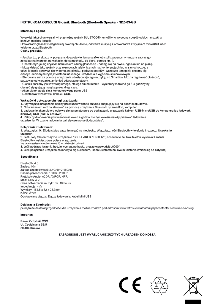 INSTRUKCJA OBSŁUGI Głośnik Bluetooth (Bluetooth Speaker) NDZ-03-GB Informacje ogólne Wysokiej jakości uniwersalny i przenośny głośnik BLUETOOTH umożliwi w wygodny sposób odsłuch muzyki w każdym miejscu i czasie. Odtwarzacz-głośnik w eleganckiej zwartej obudowie, odtwarza muzykę z odtwarzacza z wyjściem microUSB lub z telefonu przez Bluetooth. Cechy produktu: • Jest bardzo praktyczny, poręczny, do postawienia na szafkę lub stolik, przenośny - można zabrać go ze sobą (na imprezę, na wakacje, do samochodu, do biura, ogrodu itp...). • Charakteryzuje się czystym brzmieniem i dużą głośnością - nadaję się na biwak, ognisko lub na plażę. • Może działać jako głośnik przy rozmowach telefonicznych np. konferencjach lub w samochodzie, a także idealnie sprawdzi się w domu, na pikniku, podczas podróży i wszędzie tam gdzie chcemy się cieszyć ulubioną muzyką z telefonu lub innego urządzenia z wyjściem słuchawkowym. • Sterowany jest za pomocą urządzenia udostępniającego muzykę, np.Smartfon. Można regulować głośność, pauzować odtwarzanie, zmieniać odtwarzane utwory. • Głośnik zasilany jest z wewnętrznego, stałego akumulatorka - wystarczy ładować go 3-4 godziny by cieszyć się grającą muzyką przez długi czas. • Akumulator ładuje się z komputerowego portu USB • Dodatkowo w zestawie: kabelek USB. Wskazówki dotyczące obsługi urządzenia 1. Aby włączyć urządzenie należy przesunąć wcisnąć przycisk znajdujący się na bocznej obudowie.. 2. Odtwarzaniem można sterować za pomocą urządzenia Bluetooth np.smartfon, komputer 3. Ładowanie akumulatora odbywa się automatycznie po podłączeniu urządzenia kablem USB-MicroUSB do komputera lub ładowarki sieciowej USB (brak w zestawie) 4. Pełny cykl ładowania powinien trwać około 4 godzin. Po tym okresie należy przerwać ładowanie urządzenia. W czasie ładowania pali się czerwona dioda „status”. Połączenie z telefonem: 1. Włącz głośnik. Dioda status zacznie migać na niebiesko. Włącz łączność Bluetooth w telefonie i rozpocznij szukanie urządzeń. 2. Jeśli Twój telefon znajdzie urządzenie “Bt-SPEAKER / ENTER*”, oznacza to że Twój telefon wyszukał Głośnik Bluetooth – wybierz oraz połącz urządzenie. *nazwa urządzenia może się różnić w zależności od serii 3. Jeśli podczas łączenia będzie wymagane hasło, proszę wprowadzić „0000”. 4. Jeśli połączenie urządzeń zakończyło się sukcesem, ikona Bluetooth na Twoim telefonie zmieni się na aktywną Specyfikacja Bluetooth: 4.0 Zasięg: 10m Zakres częstotliwości: 2.4GHz~2.48GHz Pasmo przenoszenia: 100Hz~20KHz Protokoły Audio: A2DP, AVRCP, HFP. Moc: 1.8W X 2 Czas odtwarzania muzyki: ok. 10 hours. Impedancja: 4 Ω Wymiary: 154.5 x 62 x 25.3mm Kolor: White Obsługiwane złącza: Złącze ładowania: kabel Mini USB Deklaracja Zgodności: pełną treść deklaracji zgodności dla urządzenia można znaleźć pod adresem www: https://swiatbaterii.pl/pl/content/21-instrukcje-obslugi Importer: Paweł Ochyński CSG Ul. Cegielniana 6B/5 30-404 Kraków ZABRONIONE JEST WYRZUCANIE ZUŻYTYCH URZĄDZEŃ DO KOSZA.