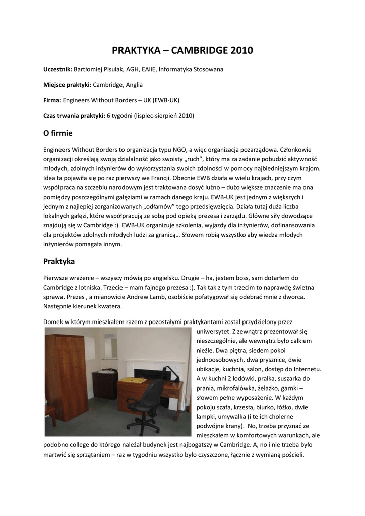 PRAKTYKA – CAMBRIDGE 2010 Uczestnik: Bartłomiej Pisulak, AGH, EAIiE, Informatyka Stosowana Miejsce praktyki: Cambridge, Anglia Firma: Engineers Without Borders – UK (EWB-UK) Czas trwania praktyki: 6 tygodni (lispiec-sierpień 2010) O firmie Engineers Without Borders to organizacja typu NGO, a więc organizacja pozarządowa. Członkowie organizacji określają swoją działalność jako swoisty „ruch”, który ma za zadanie pobudzić aktywność młodych, zdolnych inżynierów do wykorzystania swoich zdolności w pomocy najbiedniejszym krajom. Idea ta pojawiła się po raz pierwszy we Francji. Obecnie EWB działa w wielu krajach, przy czym współpraca na szczeblu narodowym jest traktowana dosyć luźno – dużo większe znaczenie ma ona pomiędzy poszczególnymi gałęziami w ramach danego kraju. EWB-UK jest jednym z większych i jednym z najlepiej zorganizowanych „odłamów” tego przedsięwzięcia. Działa tutaj duża liczba lokalnych gałęzi, które współpracują ze sobą pod opieką prezesa i zarządu. Główne siły dowodzące znajdują się w Cambridge :). EWB-UK organizuje szkolenia, wyjazdy dla inżynierów, dofinansowania dla projektów zdolnych młodych ludzi za granicą… Słowem robią wszystko aby wiedza młodych inżynierów pomagała innym. Praktyka Pierwsze wrażenie – wszyscy mówią po angielsku. Drugie – ha, jestem boss, sam dotarłem do Cambridge z lotniska. Trzecie – mam fajnego prezesa :). Tak tak z tym trzecim to naprawdę świetna sprawa. Prezes , a mianowicie Andrew Lamb, osobiście pofatygował się odebrać mnie z dworca. Następnie kierunek kwatera. Domek w którym mieszkałem razem z pozostałymi praktykantami został przydzielony przez uniwersytet. Z zewnątrz prezentował się nieszczególnie, ale wewnątrz było całkiem nieźle. Dwa piętra, siedem pokoi jednoosobowych, dwa prysznice, dwie ubikacje, kuchnia, salon, dostęp do Internetu. A w kuchni 2 lodówki, pralka, suszarka do prania, mikrofalówka, żelazko, garnki – słowem pełne wyposażenie. W każdym pokoju szafa, krzesła, biurko, łóżko, dwie lampki, umywalka (i te ich cholerne podwójne krany). No, trzeba przyznać ze mieszkałem w komfortowych warunkach, ale podobno college do którego należał budynek jest najbogatszy w Cambridge. A, no i nie trzeba było martwić się sprzątaniem – raz w tygodniu wszystko było czyszczone, łącznie z wymianą pościeli. W pracy okazało się ze zespół z którym będę pracował jest dosyć międzynarodowy. Przez całe wakacje w EWB-UK pracują praktykanci z różnych części Anglii i różnych krajów. Team IT do którego należałem był raczej skromny ilościowo, co tylko zwiększało zakres obowiązków. Przez cały okres praktyki pracowałem ze studentem z Chorwacji pod kierownictwem głównego kierownika IT w EWB-UK. Naszym zadaniem było stworzenie systemu umożliwiającego automatyczne tworzenie formularzy (w postaci węzłów systemu Drupal) do zapisu na kursy organizowane przez organizację. System ten oparty na PHP, kontaktował się z zewnętrzną bazą udostępnianą przez salesforce.com (dzięki dostarczonemu API), gdzie znajdowały się wszystkie dane EWB-UK, oraz łączył się z oficjalna stroną organizacji. Musieliśmy również stworzyć połączenie z systemem płatności PayPal. Generalnie – trochę PHP+pozanie dogłębne filozofii bazy salesforce.com i „cloud computing”. Atmosfera w pracy jak i poza nią była naprawdę świetna. Po pierwsze mieliśmy sporo swobody gdyż nikt nie sprawdzał sztywno godzin naszej pracy, ale i tak każdy siedział minimum 8h przy swoich obowiązkach. Z racji tego że w budynku znajdowały się biura innych organizacji, spotykaliśmy się często w trakcie lunchu z osobami które zwiedziły dużo ciekawych miejsc i chętnie dzieliły się swoimi doświadczeniami. Niejeden wieczór spędziliśmy w mieszkaniu u prezesa EWB, który organizował również weekendowe wypady do kina, na „punting”, piwo… Słowem starał się jak mógł abyśmy spędzili miło czas, co przy jego obowiązkach jest naprawdę wartę docenienia. A w ciągu tygodnia sami organizowaliśmy sobie czas: wypady do pubu, koncerty, oglądanie deszczu meteorytów, filmów na projektorze… Rzadko kiedy chodziliśmy spać przed 2 :) W trakcie pobytu, dzięki lokalnemu komitetowi IAESTE udało mi się odwiedzić Londyn. Trzy szalone dni i dwie noce o których można by było napisać osobną książkę… Swoją drogą polecam spacer ulicami Londynu w okolicach godzin 2-4 nad ranem – niezapomniane przeżycie. Wielkie podziękowania dla Joe pracującego z nami w Cambridge, nie należącego do IAESTE, a który był naszym przewodnikiem przez te 2 noce z własnej, nieprzymuszonej woli. Oprócz tego zwiedziłem także Oksford, również dzięki ludziom EWB. Jedno co mogę powiedzieć podsumowując moje wrażenia: warto było jechać, nawet nie po to żeby zobaczyć to i owo czy nauczyć się czegoś, ale przede wszystkim po to, żeby poznać tak wspaniałych ludzi… Czym do Cambrigde? Można autobusem, aczkolwiek z tego co udało mi się znaleźć wynika, że cena jest taka sama jak za przelot samolotem, długość podróży znacznie dłuższa. A więc samolot. A jeżeli samolot to mamy do wyboru spośród sporej liczby połączeń. Osobiście korzystałem z przewoźnika Ryanair, który ma po dwa loty dziennie z Krakowa, oraz po jednym dziennie z Rzeszowa. Niewątpliwym atutem jest fakt że samoloty tej linii lądują na lotnisku Stansted, które leży najbliżej Cambridge spośród londyńskich lotnisk. Po przylocie i odebraniu bagaży (przygotować paszport i dowód przy bramkach), kierujemy się dużymi, żółtymi znakami (bądź też podążamy za tłumem) do wyjścia. Teraz wypadałoby dostać się do samego Cambridge… Sposoby są dwa – autobus, albo pociąg. Jazda autobusem to około 1,5h, pociągiem 45minut. Cenowo o dziwo taniej jest pociągiem – 9,6 GBP (autobus 13 GBP). Przed wylotem 