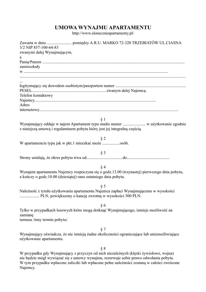 UMOWA WYNAJMU APARTAMENTU http://www.sloneczneapartamenty.pl/ Zawarta w dniu ........................ pomiędzy A.R.U. MARKO 72-320 TRZEBIATÓW UL.CIASNA 3/2 NIP 857-100-64-83 zwanymi dalej Wynajmującym, a Panią/Panem ......................................................................................................................................... zamieszkały w ........................................................................................................................................... ................................................................................................................................................................ ... legitymujący się dowodem osobistym/paszportem numer .................................................................... PESEL........................................................................zwanym dalej Najemcą. Telefon kontaktowy Najemcy..................................................................................................................... Adres internetowy...................................................................................................................................... §1 Wynajmujący oddaje w najem Apartament typu studio numer ...................... w użytkowanie zgodnie z niniejszą umową i regulaminem pobytu który jest jej integralną częścią. §2 W apartamencie typu jak w pkt.1 mieszkać może .................osób. §3 Strony ustalają, że okres pobytu trwa od...................................do......................................... §4 Wynajem apartamentu Najemcy rozpoczyna się o godz.13.00 (trzynastej) pierwszego dnia pobytu, a kończy o godz.10.00 (dziesiątej) rano ostatniego dnia pobytu. §5 Należność z tytułu użytkowania apartamentu Najemca zapłaci Wynajmującemu w wysokości ................... PLN, powiększony o kaucję zwrotną w wysokości 500 PLN. §6 Tylko w przypadkach losowych które mogą dotknąć Wynajmującego, istnieje możliwość na zamianę turnusu /inny termin pobytu/. §7 Wynajmujący oświadcza, że nie istnieją żadne okoliczności ograniczające lub uniemożliwiające użytkowanie apartamentu. §8 W przypadku gdy Wynajmujący z przyczyn od nich niezależnych (klęski żywiołowe, wojna) nie będzie mógł wywiązać się z umowy wynajmu, rezerwuje sobie prawo odwołania pobytu. W tym przypadku wpłacone zaliczki lub wpłacone pełne należności zostaną w całości zwrócone Najemcy. §9 Najemca zobowiązuje się przy przekazaniu apartamentu udostępnić dokumenty tożsamości swoje i współnajemców. § 10 Najemca ma obowiązek powiadomić Wynajmującego o ewentualnych uszkodzeniach i brakach w wyposażeniu apartamentu niezwłocznie po ich stwierdzeniu. Jednocześnie Najemca zobowiązuje się do pokrycia szkód, które wynikły z jego winy. § 11 Najemca ma bezwzględny obowiązek ściśle przestrzegać przepisów p/pożarowych, przepisów użytkowania urządzeń elektrycznych oraz regulaminu. § 12 Za bezumowne korzystanie z apartamentu Najemca zobowiązuje się do zapłaty kwoty 500 PLN za dobę. § 13 W przypadku nieuzasadnionego przedłużenia pobytu poza okres umowny, Wynajmujący ma prawo do eksmisji Najemcy na adres wskazany w umowie (adres zameldowania wg dokumentu tożsamości). § 14 Wszelkie zmiany niniejszej umowy wymagają formy pisemnej pod rygorem nieważności. § 15 W sprawach nieuregulowanych niniejszą umową zastosowanie mają przepisy Kodeksu Cywilnego. § 16 Umowa została sporządzona w dwóch jednobrzmiących egzemplarzach, po jednym dla każdej ze stron. WŁAŚCICIEL NAJEMCA NR KONTA BANKOWEGO NA KTÓRY PROSZĘ PRZEKAZAĆ ZADATEK W WYSOKOŚCI 500,00PLN PKO BP 63 1020 2821 0000 1502 0009 6230
