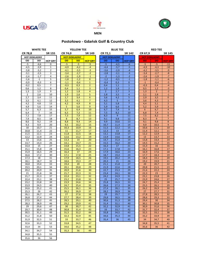 MEN Postołowo - Gdańsk Golf & Country Club WHITE TEE CR 78,8 SR 155 HCP DOKŁADNY OD DO -5 -4,6 -4,5 -3,9 -3,8 -3,2 -3,1 -2,5 -2,4 -1,7 -1,6 -1 -0,9 -0,3 -0,2 0,5 0,6 1,2 1,3 1,9 2 2,6 2,7 3,4 3,5 4,1 4,2 4,8 4,9 5,6 5,7 6,3 6,4 7 7,1 7,8 7,9 8,5 8,6 9,2 9,3 9,9 10 10,7 10,8 11,4 11,5 12,1 12,2 12,9 13 13,6 13,7 14,3 14,4 15 15,1 15,8 15,9 16,5 16,6 17,2 17,3 18 18,1 18,7 18,8 19,4 19,5 20,1 20,2 20,9 21 21,6 21,7 22,3 22,4 23,1 23,2 23,8 23,9 24,5 24,6 25,2 25,3 26 26,1 26,7 26,8 27,4 27,5 28,2 28,3 28,9 29 29,6 29,7 30,4 30,5 31,1 31,2 31,8 31,9 32,5 HCP GRY 0 1 2 3 4 5 6 7 8 9 10 11 12 13 14 15 16 17 18 19 20 21 22 23 24 25 26 27 28 29 30 31 32 33 34 35 36 37 38 39 40 41 42 43 44 45 46 47 48 49 50 51 YELLOW TEE CR 74,0 SR 149 HCP DOKŁADNY OD DO -5 -5 -4,9 -4,2 -4,1 -3,5 -3,4 -2,7 -2,6 -1,9 -1,8 -1,2 -1,1 -0,4 -0,3 0,3 0,4 1,1 1,2 1,8 1,9 2,6 2,7 3,4 3,5 4,1 4,2 4,9 5 5,6 5,7 6,4 6,5 7,2 7,3 7,9 8 8,7 8,8 9,4 9,5 10,2 10,3 10,9 11 11,7 11,8 12,5 12,6 13,2 13,3 14 14,1 14,7 14,8 15,5 15,6 16,3 16,4 17 17,1 17,8 17,9 18,5 18,6 19,3 19,4 20 20,1 20,8 20,9 21,6 21,7 22,3 22,4 23,1 23,2 23,8 23,9 24,6 24,7 25,4 25,5 26,1 26,2 26,9 27 27,6 27,7 28,4 28,5 29,1 29,2 29,9 30 30,7 30,8 31,4 31,5 32,2 32,3 32,9 33 33,7 HCP GRY -5 -4 -3 -2 -1 0 1 2 3 4 5 6 7 8 9 10 11 12 13 14 15 16 17 18 19 20 21 22 23 24 25 26 27 28 29 30 31 32 33 34 35 36 37 38 39 40 41 42 43 44 45 46 32,6 33,4 33,3 34 52 53 33,8 34,6 34,5 35,2 47 48 34,1 34,7 54 35,3 36 49 34,8 35,5 55 35,6 36 56 BLUE TEE CR 72,1 HCP DOKŁADNY OD DO -5 -4,5 -4,4 -3,7 -3,6 -2,9 -2,8 -2,1 -2 -1,3 -1,2 -0,5 -0,4 0,3 0,4 1,1 1,2 1,9 2 2,7 2,8 3,5 3,6 4,2 4,3 5 5,1 5,8 5,9 6,6 6,7 7,4 7,5 8,2 8,3 9 9,1 9,8 9,9 10,6 10,7 11,4 11,5 12,2 12,3 13 13,1 13,8 13,9 14,6 14,7 15,4 15,5 16,2 16,3 17 17,1 17,8 17,9 18,6 18,7 19,4 19,5 20,2 20,3 21 21,1 21,8 21,9 22,6 22,7 23,3 23,4 24,1 24,2 24,9 25 25,7 25,8 26,5 26,6 27,3 27,4 28,1 28,2 28,9 29 29,7 29,8 30,5 30,6 31,3 31,4 32,1 32,2 32,9 33 33,7 33,8 34,5 34,6 35,3 35,4 36 RED TEE SR 142 HCP GRY -6 -5 -4 -3 -2 -1 0 1 2 3 4 5 6 7 8 9 10 11 12 13 14 15 16 17 18 19 20 21 22 23 24 25 26 27 28 29 30 31 32 33 34 35 36 37 38 39 40 41 42 43 44 45 CR 67,9 SR 145 HCP DOKŁADNY OD DO -5 -5 -4,9 -4,3 -4,2 -3,5 -3,4 -2,7 -2,6 -1,9 -1,8 -1,1 -1 -0,4 -0,3 0,4 0,5 1,2 1,3 2 2,1 2,8 2,9 3,5 3,6 4,3 4,4 5,1 5,2 5,9 6 6,7 6,8 7,4 7,5 8,2 8,3 9 9,1 9,8 9,9 10,5 10,6 11,3 11,4 12,1 12,2 12,9 13 13,7 13,8 14,4 14,5 15,2 15,3 16 16,1 16,8 16,9 17,6 17,7 18,3 18,4 19,1 19,2 19,9 20 20,7 20,8 21,5 21,6 22,2 22,3 23 23,1 23,8 23,9 24,6 24,7 25,4 25,5 26,1 26,2 26,9 27 27,7 27,8 28,5 28,6 29,3 29,4 30 30,1 30,8 30,9 31,6 31,7 32,4 32,5 33,1 33,2 33,9 34 34,7 34,8 35,6 35,5 36 HCP GRY -11 -10 -9 -8 -7 -6 -5 -4 -3 -2 -1 0 1 2 3 4 5 6 7 8 9 10 11 12 13 14 15 16 17 18 19 20 21 22 23 24 25 26 27 28 29 30 31 32 33 34 35 36 37 38 39 40 41 42 WOMEN Postołowo - Gdańsk Golf & Country Club YELLOW TEE CR 79,6 SR 155 HCP DOKŁADNY OD DO -5 -4,5 -4,4 -3,8 -3,7 -3 -2,9 -2,3 -2,2 -1,6 -1,5 -0,9 -0,8 -0,1 0 0,6 0,7 1,3 1,4 2,1 2,2 2,8 2,9 3,5 3,6 4,3 4,4 5 5,1 5,7 5,8 6,4 6,5 7,2 7,3 7,9 8 8,6 8,7 9,4 9,5 10,1 10,2 10,8 10,9 11,5 11,6 12,3 12,4 13 13,1 13,7 13,8 14,5 14,6 15,2 15,3 15,9 16 16,6 16,7 17,4 17,5 18,1 18,2 18,8 18,9 19,6 19,7 20,3 20,4 21 21,1 21,7 21,8 22,5 22,6 23,2 23,3 23,9 24 24,7 24,8 25,4 25,5 26,1 26,2 26,9 27 27,6 27,7 28,3 28,4 29 29,1 29,8 29,9 30,5 30,6 31,2 31,3 32 32,1 32,7 HCP GRY 1 2 3 4 5 6 7 8 9 10 11 12 13 14 15 16 17 18 19 20 21 22 23 24 25 26 27 28 29 30 31 32 33 34 35 36 37 38 39 40 41 42 43 44 45 46 47 48 49 50 51 52 BLUE TEE CR 78,4 RED TEE SR 153 HCP DOKŁADNY OD DO -5 -4,4 -4,3 -3,7 -3,6 -2,9 -2,8 -2,2 -2,1 -1,5 -1,4 -0,7 -0,6 0 0,1 0,8 0,9 1,5 1,6 2,2 2,3 3 3,1 3,7 3,8 4,5 4,6 5,2 5,3 5,9 6 6,7 6,8 7,4 7,5 8,1 8,2 8,9 9 9,6 9,7 10,4 10,5 11,1 11,2 11,8 11,9 12,6 12,7 13,3 13,4 14,1 14,2 14,8 14,9 15,5 15,6 16,3 16,4 17 17,1 17,7 17,8 18,5 18,6 19,2 19,3 20 20,1 20,7 20,8 21,4 21,5 22,2 22,3 22,9 23 23,7 23,8 24,4 24,5 25,1 25,2 25,9 26 26,6 26,7 27,4 27,5 28,1 28,2 28,8 28,9 29,6 29,7 30,3 30,4 31 31,1 31,8 31,9 32,5 32,6 33,3 HCP GRY 0 1 2 3 4 5 6 7 8 9 10 11 12 13 14 15 16 17 18 19 20 21 22 23 24 25 26 27 28 29 30 31 32 33 34 35 36 37 38 39 40 41 42 43 44 45 46 47 48 49 50 51 32,8 33,5 33,4 34,1 53 54 33,4 34,1 34 34,7 52 53 34,2 34,9 55 34,8 35,5 54 35 35,6 56 35,6 36 55 35,7 36 57 CR 73,8 SR 146 HCP DOKŁADNY OD DO -5 -4,9 -4,8 -4,2 -4,1 -3,4 -3,3 -2,6 -2,5 -1,8 -1,7 -1,1 -1 -0,3 -0,2 0,5 0,6 1,3 1,4 2 2,1 2,8 2,9 3,6 3,7 4,4 4,5 5,1 5,2 5,9 6 6,7 6,8 7,5 7,6 8,2 8,3 9 9,1 9,8 9,9 10,6 10,7 11,3 11,4 12,1 12,2 12,9 13 13,6 13,7 14,4 14,5 15,2 15,3 16 16,1 16,7 16,8 17,5 17,6 18,3 18,4 19,1 19,2 19,8 19,9 20,6 20,7 21,4 21,5 22,2 22,3 22,9 23 23,7 23,8 24,5 24,6 25,3 25,4 26 26,1 26,8 26,9 27,6 27,7 28,4 28,5 29,1 29,2 29,9 30 30,7 30,8 31,5 31,6 32,2 32,3 33 33,1 33,8 33,9 34,5 34,6 35,4 35,3 36 HCP GRY -5 -4 -3 -2 -1 0 1 2 3 4 5 6 7 8 9 10 11 12 13 14 15 16 17 18 19 20 21 22 23 24 25 26 27 28 29 30 31 32 33 34 35 36 37 38 39 40 41 42 43 44 45 46 47 48