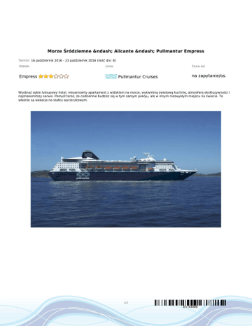 Morze Śródziemne – Alicante – Pullmantur Empress Termin: 16 październik 2016 - 23 październik 2016 (ilość dni: 8) Statek: Empress Linia: Cena od: Pullmantur Cruises na zapytanie/os. Wyobraź sobie luksusowy hotel, niesamowity apartament z widokiem na morze, wykwintną światową kuchnię, atmosferę ekskluzywności i najznakomitszy serwis. Pomyśl teraz, że codziennie budzisz się w tym samym pokoju, ale w innym niezwykłym miejscu na świecie. To właśnie są wakacje na statku wycieczkowym. 1/3 EV:43008 TRASA REJSU dzień 1 Data Port Wpłynięcie Wypłynięcie niedziela 16.10.2016 Alicante 18:00 18:00 Hiszpania dzień 2 poniedziałek 17.10.2016 Dzień na morzu --:-- --:-- dzień 3 wtorek 18.10.2016 Civitavecchia, Rzym 09:30 20:00 środa 19.10.2016 Livorno, Florencja i Piza 08:00 19:00 czwartek 20.10.2016 Villefranche-sur-Mer, Nicea 07:00 14:00 dzień 6 piątek 21.10.2016 Dzień na morzu --:-- --:-- dzień 7 sobota 22.10.2016 Malaga 11:00 18:00 12:00 12:00 dzień 4 dzień 5 dzień 8 niedziela 23.10.2016 Legenda Włochy Włochy Francja Hiszpania Alicante Hiszpania CENNIK Cena katalogowa Junior Suite with balcony Cena promocyjna €1 106.00 Outside Superior €690.00 Outside €630.00 Inside Superior €580.00 Inside €490.00 Royal Suite with balcony €1 565.00 Suite Deluxe with balcony €1 365.00 Outside Deluxe €965.00 Opłaty portowe €190.00 Uwaga! Ceny za osobę w kabinie dwuosobowej. 2/3 EV:43008 Cena zawiera: zakwaterowanie w kabinie wybranej kategorii; wyżywienie - 3 główne posiłki, przekąski między posiłkami, bufet lub przekąski o północy; podstawowy pakiet all inclusive; serwis bagażowy podczas wejścia i zejścia ze statku; serwis kabinowy; korzystanie ze wszystkich urządzeń sportowo - rekreacyjnych znajdujących się na pokładzie statku (basen, jacuzzi, sala fitness, itp.); udział we wszystkich imprezach organizowanych na statku (przedstawienia w teatrze, koncerty, programy animacyjne itp.). Cena nie zawiera: kosztów dojazdu do portu; ewentualnych noclegów w hotelu przed/po rejsie i transferów; wycieczek fakultatywnych w trakcie rejsu; korzystania z punktów usługowych (fryzjer, pralnia, fotograf, salon piękności i odnowy biologicznej, internet) i wydatków osobistych; napiwków dla obsługi na statku (kwota uzależniona od długości rejsu); ubezpieczenia KL, NNW i bagaż, kosztów wiz (tam gdzie wymagane). 3/3 EV:43008
