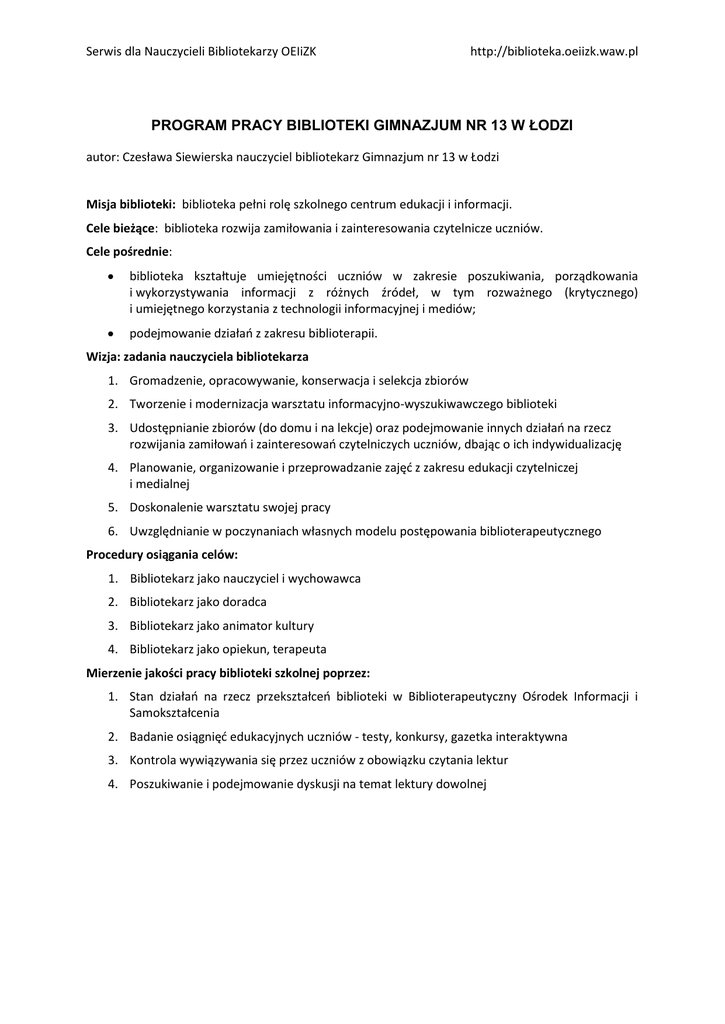 program pracy biblioteki gimnazjum nr 13 w łodzi