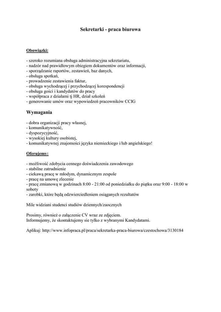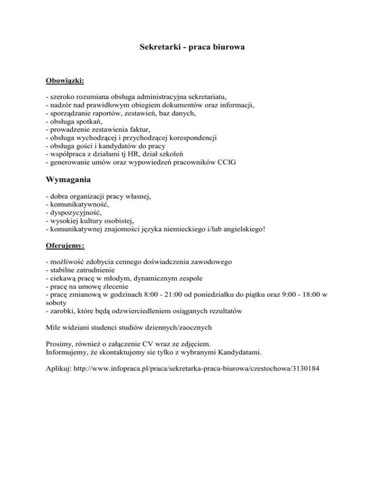 Sekretarki - praca biurowa Obowiązki: - szeroko rozumiana obsługa administracyjna sekretariatu, - nadzór nad prawidłowym obiegiem dokumentów oraz informacji, - sporządzanie raportów, zestawień, baz danych, - obsługa spotkań, - prowadzenie zestawienia faktur, - obsługa wychodzącej i przychodzącej korespondencji - obsługa gości i kandydatów do pracy - współpraca z działami tj HR, dział szkoleń - generowanie umów oraz wypowiedzeń pracowników CCIG Wymagania - dobra organizacji pracy własnej, - komunikatywność, - dyspozycyjność, - wysokiej kultury osobistej, - komunikatywnej znajomości języka niemieckiego i/lub angielskiego! Oferujemy: - możliwość zdobycia cennego doświadczenia zawodowego - stabilne zatrudnienie - ciekawą pracę w młodym, dynamicznym zespole - pracę na umowę zlecenie - pracę zmianową w godzinach 8:00 - 21:00 od poniedziałku do piątku oraz 9:00 - 18:00 w soboty - zarobki, które będą odzwierciedleniem osiąganych rezultatów Mile widziani studenci studiów dziennych/zaocznych Prosimy, również o załączenie CV wraz ze zdjęciem. Informujemy, że skontaktujemy sie tylko z wybranymi Kandydatami. Aplikuj: http://www.infopraca.pl/praca/sekretarka-praca-biurowa/czestochowa/3130184