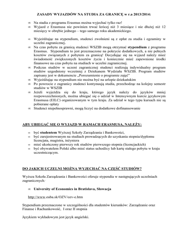 ZASADY WYJAZDÓW NA STUDIA ZA GRANICĘ w r.a 2013/2014: • • Na stadia z programu Erasmus można wyjechać tylko raz! Wyjazd z Erasmusa nie powinien trwać krócej niż 3 miesiące i nie dłużej niż 12 miesięcy w obrębie jednego – tego samego roku akademickiego. • Wyjeżdżając na stypendium, studenci zwolnieni są z opłat za studia i egzaminy w uczelni zagranicznej. Na czas pobytu za granicą studenci WSZIB mogą otrzymać stypendium z programu Erasmus. Stypendium to jest przeznaczone na pokrycie dodatkowych, a nie pełnych kosztów związanych z pobytem za granicą! Decydując się na wyjazd należy mieć świadomość zwiększonych kosztów życia i koniecznie mieć zapewnione środki finansowe na czas pobytu na studiach w uczelni zagranicznej. Podczas studiów w uczeni zagranicznej studenci realizują indywidualny program studiów uzgodniony wcześniej z Dziekanem Wydziału WSZIB. Program studiów zapisany jest w dokumencie „Porozumienie o programie zajęć” Wyjeżdżając na stypendium nie można być na urlopie dziekańskim Po powrocie z zagranicy studenci kontynuują studia, przechodząc na kolejny semestr studiów w WSZIB Jeżeli wyjeżdża się do kraju, którego język należy do języków mniej rozpowszechnionych, można ubiegać się o udział w Intensywnym kurcie językowym Erasmusa (EILC) organizowanym w tym kraju. Za udział w tego typu kursach nie są pobierane opłaty Studenci niepełnosprawni, mogą liczyć na dodatkowe dofinansowanie • • • • • • ABY UBIEGAĆ SIĘ O WYJAZD W RAMACH ERASMUSA, NALEŻY: • • • • być studentem Wyższej Szkoły Zarządzania i Bankowości, być zarejestrowanym na studiach prowadzących do uzyskania stopnia/dyplomu licencjata, magistra, inżyniera mieć ukończony pierwszy rok studiów pierwszego stopnia (licencjackich) być obywatelem Polski albo mieć status uchodźcy lub kartę stałego pobytu w kraju uczestniczącym. DO JAKICH UCZELNI MOŻNA WYJECHAĆ NA CZĘŚĆ STUDIÓW? Wyższa Szkoła Zarządzania i Bankowości oferuje stypendia w następujących uczelniach zagranicznych: • University of Economics in Bratislava, Słowacja http://www.euba.sk/OZV/ozv-e.htm Stypendium przeznaczone w szczególności dla studentów kierunków: Zarządzanie oraz Finanse i Rachunkowość, I oraz II stopnia Językiem wykładowym jest język angielski. • University of Zilina, Słowacja http://www.uniza.sk/projekty/brozura/project.asp?id=1&sub=1 Stypendium przeznaczone w szczególności dla studentów kierunków: Zarządzanie oraz Finanse i Rachunkowość, I stopnia. Językiem wykładowym jest język angielski. • University of Amsterdam, Holandia http://www.studeren.uva.nl/studyinginenglish/english.cfm Stypendium przeznaczone dla studentów kierunku: Computer Science, II stopnia Językiem wykładowym jest język angielski. • Budapest College of Communication and Business, Węgry www.bkf.hu Stypendium przeznaczone dla studentów kierunków Zarządzanie oraz Finanse i Rachunkowość oraz Socjologia, I stopnia. Językiem wykładowym jest język angielski. • Universita di Bologna, Włochy http://www.eng.unibo.it/PortaleEn/vademecum/VademecumInternationalStudents.htm Stypendium przeznaczone dla studentów kierunków Zarządzanie oraz Finanse i Rachunkowość, I stopnia. Językiem wykładowym jest język włoski lecz istnieje możliwość zdawania egzaminów również w języku angielskim. KWALIFIKACJA NA STUDIA ZAGRANICZNE W procesie kwalifikacji na studia zagraniczne brane są pod uwagę: • • • • Średnia ocen: za dotychczasowy okres studiów, potwierdzona przez właściwy Dziekanat Poziom znajomości języka obcego: w rekrutacji brana jest pod uwagę znajomość tylko tego języka, w którym student będzie odbywał studia zagraniczne (o ile dana oferta nie zawiera innych wymagań) Potwierdzone zagraniczne doświadczenie zawodowe Posiadanie certyfikatów językowych • • Poświadczona działalność w kołach naukowych i organizacjach studenckich, związana z realizacją konkretnych przedsięwzięć Wolontariat, praktyki studenckie w WSZiB oraz inne formy aktywności i osiągnięcia. Dokumenty rekrutacyjne: • • • • • • Wypełniony oraz podpisany Formularz rekrutacyjny Zaświadczenie z Dziekanatu o średniej ze studiów za cały dotychczasowy tok studiów CV w języku angielskim oraz polskim List motywacyjny w języku angielskim i polskim 2 zdjęcia legitymacyjne Dodatkowe zaświadczenia TERMINY REKRUTACJI NA STUDIA ZAGRANICZNE Terminy rekrutacji ogłaszane są przez suszi oraz na stronie internetowej.