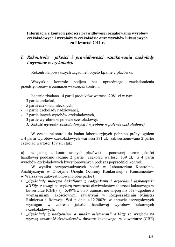 Informacja z kontroli jakości i prawidłowości oznakowania wyrobów czekoladowych i wyrobów w czekoladzie oraz wyrobów luksusowych za I kwartał 2011 r. I. Rekontrola jakości i prawidłowości oznakowania czekolady i wyrobów w czekoladzie Rekontrolą powyższych zagadnień objęto łącznie 2 placówki. Wszystkie kontrole podjęto bez uprzedniego przedsiębiorców o zamiarze wszczęcia kontroli. - zawiadomienia Łącznie zbadano 14 partii produktów wartości 2081 zł w tym: 3 partie czekolad, 5 partii czekolad mlecznych, 1 partię czekolady nadziewanej, 2 partie innych wyrobów czekoladowych, 3 partie wyrobów w polewie czekoladowej. 1. Jakość wyrobów czekoladowych i wyrobów w polewie czekoladowej W czasie rekontroli do badań laboratoryjnych pobrano próby ogółem z 4 partii wyrobów czekoladowych wartości 371 zł, zakwestionowano 2 partie czekolad wartości 139 zł, i tak: a) w jednej z kontrolowanych placówek, ponownej ocenie jakości handlowej poddano łącznie 2 partie czekolad wartości 139 zł, z 4 partii wyrobów czekoladowych kwestionowanych podczas poprzedniej kontroli. W wyniku przeprowadzonych badań w Laboratorium KontrolnoAnalitycznym w Olsztynie Urzędu Ochrony Konkurencji i Konsumentów w Warszawie zakwestionowano obie partie tj: • „Czekoladę mleczną bakaliową z rodzynkami i orzechami laskowymi” a’180g, z uwagi na wyższą zawartość ekwiwalentów tłuszczu kakaowego w kuwerturze (CBE) tj. 5,49% ± 0,30 zamiast nie więcej niż 5% - zgodnie z wymaganiami jakościowymi zawartymi w Rozporządzeniu Ministra Rolnictwa i Rozwoju Wsi z dnia 4.12.2002r. w sprawie szczegółowych wymagań w zakresie jakości handlowej wyrobów kakaowych i czekoladowych; • „Czekoladę z nadzieniem o smaku miętowym” a’100g.,ze względu na wyższą zawartość ekwiwalentów tłuszczu kakaowego w kuwerturze (CBE) 1/6 tj. 5,41% ± 0,30 zamiast nie więcej niż 5% - zgodnie z wymaganiami jakościowymi zawartymi w w/w rozporządzeniu; W związku z powyższym zostanie wszczęte postępowanie administracyjne w sprawie wymierzenia kary pieniężnej z art. 40a ust.1 pkt 3 ustawy z dnia 21.12.2000r. o jakości handlowej artykułów rolno-spożywczych w stosunku do wprowadzającego do obrotu w/w 2 partie czekolad. Kontrolowany przedsiębiorca zaakceptował wyniki analiz laboratoryjnych w/w artykułów i zrezygnował z ponownych badań prób kontrolnych. Osoba odpowiedzialna podjęła decyzje o wycofaniu z obrotu i zwrocie do producenta pozostawionych prób kontrolnych w/w czekolad o łącznej wartości 45 zł. Zakwestionowane partie towarów zostały wyprzedane do czasu otrzymania przez kontrolowanego wyników badań laboratoryjnych. b) w drugiej kontrolowanej placówce, do badań laboratoryjnych pobrano łącznie 2 partie czekolad wartości 231 zł, w tym 1 partię wartości 152 zł zakwestionowaną podczas poprzedniej kontroli tj. „Czekoladę mleczną” a’100g. Analizy przeprowadzone w Laboratorium Kontrolno-Analitycznym w Olsztynie Urzędu Ochrony Konkurencji i Konsumentów w Warszawie wykazały, że w/w produkt odpowiada wymaganiom jakościowym zawartym w Rozporządzeniu Ministra Rolnictwa i Rozwoju Wsi z dnia 4.12.2002r. w sprawie szczegółowych wymagań w zakresie jakości handlowej wyrobów kakaowych i czekoladowych oraz deklaracji producenta podanej na opakowaniu pod względem wykonanych badań fizyczno-chemicznych. 2. Prawidłowość oznakowania wyrobów czekoladowych i wyrobów w polewie czekoladowej Sprawdzono prawidłowość oznakowania przez producentów 14 partii wyrobów czekoladowych i wyrobów w polewie czekoladowej wartości 2081zł. Nie stwierdzono produktów oznakowanych niezgodnie z obowiązującymi przepisami. Kontrolowani przedsiębiorcy posiadali dowody dostaw lub inne dokumenty identyfikujące dostawców ocenianych 14 partii wyrobów czekoladowych i w polewie czekoladowej. 3. Przestrzeganie aktualności dat minimalnej trwałości Daty ważności sprawdzano we wszystkich kontrolowanych placówkach obejmując badaniem 14 partii wyrobów czekoladowych i wyrobów w polewie czekoladowej wartości 2081 zł. 2/6 Nie stwierdzono w obrocie handlowym produktów po upływie ich terminów ważności. 4. Przestrzeganie przepisów ustawy z dnia 7 maja 2009r. o towarach paczkowanych Badania laboratoryjne 24 opakowań jednostkowych wyrobów czekoladowych i w polewie czekoladowej w zakresie zgodności ilości rzeczywistej z deklarowaną przez producentów na etykietach, nie wykazały nieprawidłowości. 5. Warunki i sposób przechowywania Sposób i warunki przechowywania wyrobów czekoladowych oraz wyrobów w polewie czekoladowej zgodne były z deklaracjami producentów zamieszczonymi na etykietach opakowań oraz przepisami rozporządzenia Parlamentu Europejskiego i Rady (WE) nr 852/2004 z dnia 29.04.2004r. w sprawie higieny środków spożywczych. 6. Orzeczenia lekarskie do celów sanitarno-epidemiologicznych We wszystkich kontrolowanych placówkach osoby biorące udział przy obrocie i sprzedaży środków spożywczych posiadały książeczki zdrowia z aktualnymi wpisami z badań lekarskich do celów sanitarnoepidemiologicznych wymaganych dla osób bezpośrednio stykających się z żywnością. 7. Identyfikacja kontrolowanego przedsiębiorcy Wszyscy przedsiębiorcy posiadali aktualne decyzje dotyczące rejestracji i zatwierdzania zakładów przez organy nadzoru sanitarnego, a określony w nich zakres i rodzaj działalności zgodny był ze stanem faktycznym i z wpisem do rejestru sądowego. 8. Wykorzystanie ustaleń kontrolnych W związku z nieprawidłowościami stwierdzonymi w czasie kontroli tutejszy Inspektorat wystąpił ze stosownymi pisma do: • producenta, wnosząc o podanie przyczyn niewłaściwej jakości badanych laboratoryjnie produktów; 3/6 • jednostki nadrzędnej, której podlegała kontrolowana placówka, informując o wynikach przeprowadzonych kontroli. Ponadto w 1 przypadku opracowano informację do Wojewódzkiego Inspektoratu Jakości Han
