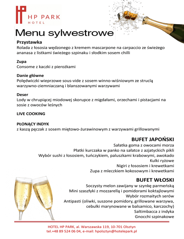 Przystawka Rolada z łososia wędzonego z kremem mascarpone na carpaccio ze świeżego ananasa z listkami świeżego szpinaku i słodkim sosem chilli Zupa Consome z kaczki z pierożkami Danie główne Polędwiczki wieprzowe sous-vide z sosem winno-wiśniowym ze struclą warzywno-ziemniaczaną i blanszowanymi warzywami Deser Lody w chrupiącej miodowej skorupce z migdałami, orzechami i pistacjami na sosie z owoców leśnych LIVE COOKING PŁONĄCY INDYK z kaszą pęczak z sosem miętowo-żurawinowym z warzywami grillowanymi BUFET JAPOŃSKI Sałatka goma z owocami morza Płatki kurczaka w panko na sałatce z azjatyckich pikli Wybór sushi z łososiem, tuńczykiem, paluszkami krabowymi, awokado Kulki ryżowe Nigiri z łososiem i krewetkami Zupa z mleczkiem kokosowym i krewetkami BUFET WŁOSKI Soczysty melon zawijany w szynkę parmeńską Mini szaszłyki z mozzarellą i pomidorami koktajlowymi Wybór rozmaitych serów Antipasti (oliwki, suszone pomidory, grillowane warzywa, cebulki marynowane w balsamico, karczochy) Saltimbacca z indyka Gnocchi szpinakowe HOTEL HP PARK, al. Warszawska 119, 10-701 Olsztyn tel.+48 89 524 06 04, e-mail: [email protected] BUFET HISZPAŃSKI Sałatka z kalmarami z sosem aioli i świeżymi warzywami Carpaccio z ośmiornicy na rukoli Pstrąg w iberyjskiej zalewie słodko-kwaśnej Mule na białym winie Paella z kurczakiem i krewetkami BUFET POLSKI Tatar wołowy z marynatami Deski pasztetów rozmaitych Deski mięs pieczonych Deski ryb wędzonych Śledź z konfiturą z czerwonej cebuli na chrupiącym toście Pierogi ruskie opiekane na złoto z okrasą Mieszki schabowe z podgrzybkami i sosem tymiankowym Sandacz z sosem z szyjek rakowych Pieczone ziemniaki w ziołach z czosnkiem BUFET DESEROWY Tiramisu Panna Cotta Mini bezy z mascarpone i świeżymi owocami Sernik krakowski Rolada biszkoptowa z truskawkami Krem kataloński BAR OPEN Soki owocowe, napoje gazowane, kawa, herbata, wino półwytrawne, wino musujące, Martini, Gin, Whisky, piwo z nalewaka, wódka czysta HOTEL HP PARK, al. Warszawska 119, 10-701 Olsztyn tel.+48 89 524 06 04, e-mail: [email protected]
