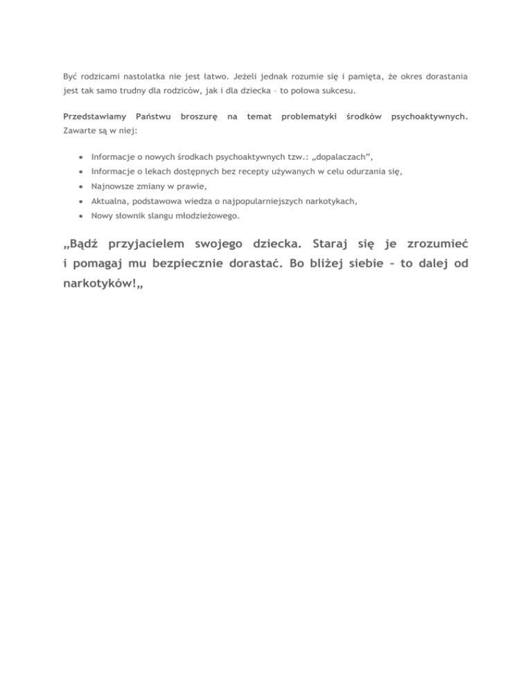 Być rodzicami nastolatka nie jest łatwo. Jeżeli jednak rozumie się i pamięta, że okres dorastania jest tak samo trudny dla rodziców, jak i dla dziecka – to połowa sukcesu. Przedstawiamy Państwu broszurę na temat problematyki środków psychoaktywnych. Zawarte są w niej: Informacje o nowych środkach psychoaktywnych tzw.: „dopalaczach”, Informacje o lekach dostępnych bez recepty używanych w celu odurzania się, Najnowsze zmiany w prawie, Aktualna, podstawowa wiedza o najpopularniejszych narkotykach, Nowy słownik slangu młodzieżowego. „Bądź przyjacielem swojego dziecka. Staraj się je zrozumieć i pomagaj mu bezpiecznie dorastać. Bo bliżej siebie – to dalej od narkotyków!„
