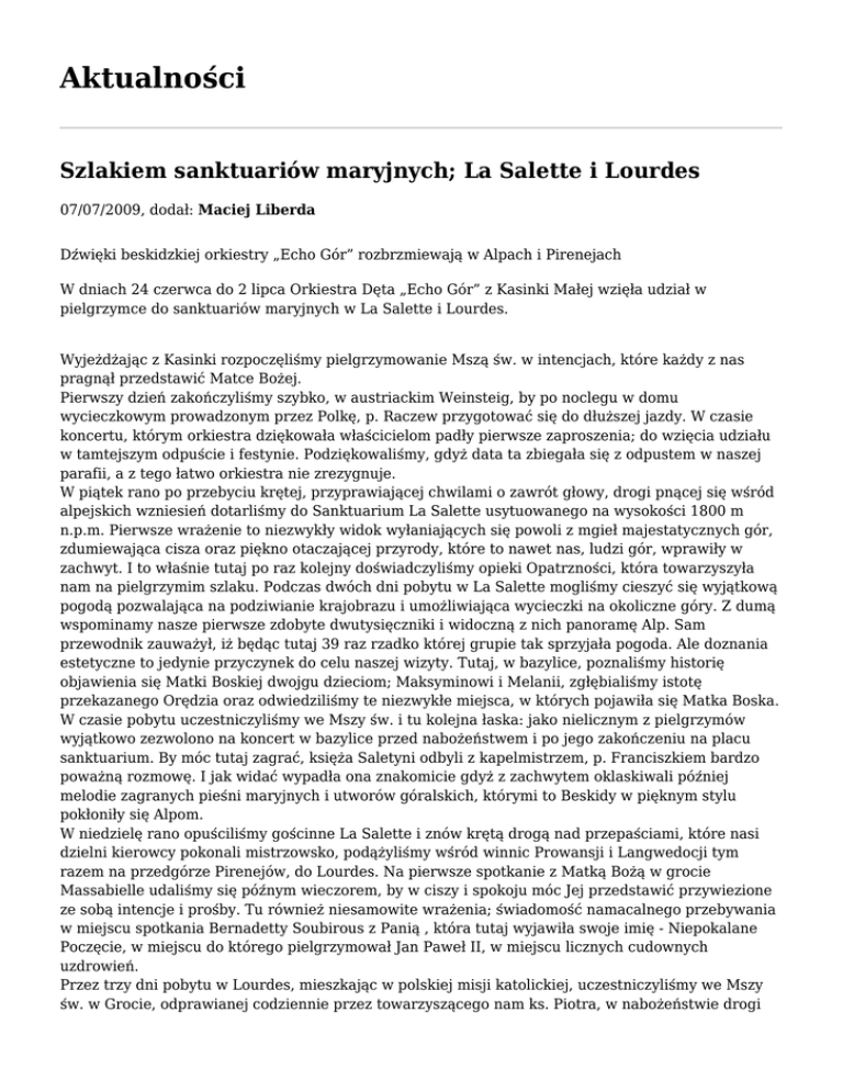 Aktualności Szlakiem sanktuariów maryjnych; La Salette i Lourdes 07/07/2009, dodał: Maciej Liberda Dźwięki beskidzkiej orkiestry „Echo Gór” rozbrzmiewają w Alpach i Pirenejach W dniach 24 czerwca do 2 lipca Orkiestra Dęta „Echo Gór” z Kasinki Małej wzięła udział w pielgrzymce do sanktuariów maryjnych w La Salette i Lourdes. Wyjeżdżając z Kasinki rozpoczęliśmy pielgrzymowanie Mszą św. w intencjach, które każdy z nas pragnął przedstawić Matce Bożej. Pierwszy dzień zakończyliśmy szybko, w austriackim Weinsteig, by po noclegu w domu wycieczkowym prowadzonym przez Polkę, p. Raczew przygotować się do dłuższej jazdy. W czasie koncertu, którym orkiestra dziękowała właścicielom padły pierwsze zaproszenia; do wzięcia udziału w tamtejszym odpuście i festynie. Podziękowaliśmy, gdyż data ta zbiegała się z odpustem w naszej parafii, a z tego łatwo orkiestra nie zrezygnuje. W piątek rano po przebyciu krętej, przyprawiającej chwilami o zawrót głowy, drogi pnącej się wśród alpejskich wzniesień dotarliśmy do Sanktuarium La Salette usytuowanego na wysokości 1800 m n.p.m. Pierwsze wrażenie to niezwykły widok wyłaniających się powoli z mgieł majestatycznych gór, zdumiewająca cisza oraz piękno otaczającej przyrody, które to nawet nas, ludzi gór, wprawiły w zachwyt. I to właśnie tutaj po raz kolejny doświadczyliśmy opieki Opatrzności, która towarzyszyła nam na pielgrzymim szlaku. Podczas dwóch dni pobytu w La Salette mogliśmy cieszyć się wyjątkową pogodą pozwalająca na podziwianie krajobrazu i umożliwiająca wycieczki na okoliczne góry. Z dumą wspominamy nasze pierwsze zdobyte dwutysięczniki i widoczną z nich panoramę Alp. Sam przewodnik zauważył, iż będąc tutaj 39 raz rzadko której grupie tak sprzyjała pogoda. Ale doznania estetyczne to jedynie przyczynek do celu naszej wizyty. Tutaj, w bazylice, poznaliśmy historię objawienia się Matki Boskiej dwojgu dzieciom; Maksyminowi i Melanii, zgłębialiśmy istotę przekazanego Orędzia oraz odwiedziliśmy te niezwykłe miejsca, w których pojawiła się Matka Boska. W czasie pobytu uczestniczyliśmy we Mszy św. i tu kolejna łaska: jako nielicznym z pielgrzymów wyjątkowo zezwolono na koncert w bazylice przed nabożeństwem i po jego zakończeniu na placu sanktuarium. By móc tutaj zagrać, księża Saletyni odbyli z kapelmistrzem, p. Franciszkiem bardzo poważną rozmowę. I jak widać wypadła ona znakomicie gdyż z zachwytem oklaskiwali później melodie zagranych pieśni maryjnych i utworów góralskich, którymi to Beskidy w pięknym stylu pokłoniły się Alpom. W niedzielę rano opuściliśmy gościnne La Salette i znów krętą drogą nad przepaściami, które nasi dzielni kierowcy pokonali mistrzowsko, podążyliśmy wśród winnic Prowansji i Langwedocji tym razem na przedgórze Pirenejów, do Lourdes. Na pierwsze spotkanie z Matką Bożą w grocie Massabielle udaliśmy się późnym wieczorem, by w ciszy i spokoju móc Jej przedstawić przywiezione ze sobą intencje i prośby. Tu również niesamowite wrażenia; świadomość namacalnego przebywania w miejscu spotkania Bernadetty Soubirous z Panią , która tutaj wyjawiła swoje imię - Niepokalane Poczęcie, w miejscu do którego pielgrzymował Jan Paweł II, w miejscu licznych cudownych uzdrowień. Przez trzy dni pobytu w Lourdes, mieszkając w polskiej misji katolickiej, uczestniczyliśmy we Mszy św. w Grocie, odprawianej codziennie przez towarzyszącego nam ks. Piotra, w nabożeństwie drogi krzyżowej na zboczu góry Espelugues, zwiedziliśmy Sanktuarium; bazylikę Niepokalanego Poczęcia, kryptę, bazylikę Różańca św, ogromną, mieszczącą 27.000 osób bazylikę Piusa X, kościół św. Bernadetty oraz Kaplicę Adoracji. Poznając historię objawień zwiedziliśmy miejsca związane z osoba Bernadki, dziewczyny, którą każdy z nas znał ze słów pieśni śpiewanej podczas nabożeństw majowych. Teraz zaś dane nam było naocznie zobaczyć jej dom, poznać dzieje rodziny i przejść trasą, którą dziewczyna, jak śpiewamy szła po drzewo w las, spotykając na swej drodze Maryję. Obficie zaczerpnęliśmy wody z cudownego źródła, przywożąc ją również bliskim i skorzystaliśmy z kąpieli w basenach. Niezwykłym jednak przeżyciem, które zostanie na długo w naszej pamięci było uczestnictwo w niedzielne popołudnie i wieczór w odbywających się w pobliżu Groty procesjach. Z wysokości tarasu przed bazyliką górną obserwowaliśmy procesję eucharystyczną zakończoną błogosławieństwem chorych. Niesamowity to widok ciągnących tłumów chorych, eskortowanych na wózkach, a czasami nawet na łóżkach szpitalnych przez wolontariuszy w kierunku Esplanady przed bazyliką. Z ogromnym jednak wzruszeniem wspominać będziemy nasz udział w międzynarodowej procesji – widocznym znaku powszechności Kościoła. Pierwszego dnia pobytu orkiestra zagrała Czarną Madonnę, zaś pozostali kasinczanie, jako jedna z wielojęzykowych grup wiernych, uczestniczyła w modlitwie różańcowej i śpiewie podczas nabożeństwa. Było to zadanie niełatwe; przydzieloną nam część różańca co prawda odmawialiśmy po polsku, ale już ze śpiewem było trudniej – łacińskie teksty wykonywaliśmy pod czujnym uchem mistrza ceremonii, który dla nas był pobłażliwy, ale, jak widzieliśmy, wychwytując najdrobniejszy fałsz okazywał śpiewającym swoją dezaprobatę. Na szczęcie zdaliśmy ten egzamin ze śpiewu – śpiewająco. Po procesji orkiestra dała koncert, czym wyróżniła się szybko gromadząc wokół siebie tłumy zafascynowanych brzmieniem góralskich melodii pielgrzymów, nagradzając ich rzęsistymi brawami. Trudno czytającym będzie zapewne uwierzyć, że siła granych melodii oraz uroda stroju góralskiego tak wprawiła zebranych w zachwyt, iż marzeniem niektórych było choćby dotknąć prawdziwego górala. Nas przyprawiało to o rozbawienie, ale dla sa