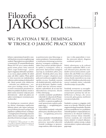 Filozofia JAKOŚCI dr Zofia Chełstowska Teorie i badania 15 WG PLATONA I W.E. DEMINGA W TROSCE O JAKOŚĆ PRACY SZKOŁY To aksjologiczne rozumienie jakości jest zbieżne z dominującą współcześnie definicją jakości jako stopnia spełniania przez przedmioty stawianych wymagań. Tak popularne w polskiej oświacie, wynikające z wymogów prawa oświatowego, mierzenie jakości dotyczy stopnia spełniania przez placówkę oświatową wymagań, co polega 1 W. Tatarkiewicz „Historia filozofii” T.1, PWN, W-wa 2001 i Z. Zymonik „Wkład starożytności do problematyki jakości i jej kosztów” w: „Problemy Jakości” Nr 8 / 2004 na porównywaniu stanu faktycznego ze stanem pożądanym. Stanem pożądanym w świetle prawa oświatowego są stawiane placówce wymagania wynikające z jej zadań. Chcąc mierzyć, jak dalece placówka spełnia te wymagania, należy je sprecyzować. Sprecyzowane wymagania nazywają się standardami jakości pracy placówki. Standardy jakości pracy danej placówki to przyjęte i akceptowane przez społeczność oczekiwania względem różnych aspektów jej pracy. Standardy stanowią cele działania placówki, wokół nich skupia się jej aktywność. Zgodnie z zasadą, że jakość musi być tworzona autonomicznie w placówkach, ale też musi być ukierunkowana zewnętrznie, obecnie w Polsce obowiązują: • centralne standardy i przykładowe wskaźniki (w załączeniu do Rozporządzenia MENiS z dnia 23 kwietnia 2004 r. w sprawie szczegółowych zasad sprawowania nadzoru pedagogicznego...) – uwzględniają priorytety MEN; • wojewódzkie standardy i wskaźniki jakości pracy określone przez Kuratora – uwzględniają priorytety KO; • własne standardy i wskaźniki jakości pracy placówki – uwzględniają priorytety (potrzeby) placówki (wnioski wynikające ze sprawowanego nadzoru, słabe strony ujawn- ione w roku poprzednim w wyniku mierzenia jakości, diagnoza oczekiwań i potrzeb…) Szkoły zobowiązane są do realizacji wszystkich standardów MEN w czterech obszarach pracy placówki (standardów tych nie można zmienić, są jednakowe dla całej Polski) oraz realizacji wskaźników ustalonych przez kuratora oświaty (każde województwo ma swoje wskaźniki). Dodatkowo placówka może tworzyć standardy własne i wskaźniki charakteryzujące jej specyfikę. Standardy wewnętrzne są uszczegółowieniem lub rozszerzeniem standardów zewnętrznych i powinny być tak modyfikowane na bieżąco, aby zawsze wyznaczały górną granicę możliwości rozwojowych placówki. Standardy są uznane za osiągnięte, jeżeli mamy na to dowody. Wskaźnik to dowód osiągania określonych standardów. Placówka powinna zmodyfikować tzw. przykładowe wskaźniki (podane w rozporządzeniu j.w.), dostosować je do własnych możliwości, powinna stworzyć własne wskaźniki. Zarówno standardy, jak i wskaźniki można odnaleźć w ważnych dokumentach placówki: w planie rozwoju, w planie mierzenia jakości, w planie nadzoru pedagogicznego. MERITUM 2(2) / 2006 Jednym z najważniejszych zjawisk w ostatnich latach jest zwracanie szczególnej uwagi na jakość. Pojęcie jakości ma swoje źródła już w starożytności. W systemie filozoficznym Platona (427-347 p.n.e.) można odnaleźć grecki termin poiotes, który oznaczał jakość czegoś konkretnego – pewien stopień osiągniętej doskonałości przedmiotu czy rzeczy, pojęcie podobne do takich pojęć, jak dobro i piękno. Platon głosił, że świat rzeczywisty jest niedoskonałym odbiciem realnie istniejących doskonałych idei. Jakość posiada cechy obiektywne – mierzalne oraz subiektywne – oceniane przez każdego inaczej. Platon w swoich rozważaniach prezentował subiektywne podejście do jakości, uważał, że jakość można zrozumieć wyłącznie przez doświadczenie – jakość jak piękno jest sądem wartościującym wyrażonym przez użytkownika 1. MERITUM 2(2) / 2006 Teorie i badania 16 Takie podejście do jakości pracy szkoły jest zgodne ze współczesnym ruchem na rzecz poprawy jakości, którego początki łączy się z nazwiskiem Amerykanina Williamsa Edwardsa Deminga (19001993), a który określił, że jakość to jest to, co zadowala, a nawet zachwyca klienta, to dialog z klientami, uznanie partnerstwa klienta, Deming sformułował zasady określające filozofię zarządzania jakością 1:, np.: • Ucz każdego nowej filozofii, nie mogą być akceptowane produkty marnej jakości ani niedbałe usługi. • Stwórz i utrwal sytuacje, w których pracownicy będą dążyć do ciągłego doskonalenia produktu lub usługi w taki sposób, by najlepiej zaspokoić potrzeby klientów. • Wyeliminuj strach, budując zaufanie i taki klimat, aby pracownicy nie bali się stawiania pytań, sygnalizowania problemów i prezentowania nowych pomysłów. • Usuń przeszkody, które hamują dumę i radość z pracy, działaj tak, aby dostarczać informację zwrotną o wynikach i osiąganych efektach, stosuj systemy motywacyjne stawiające przed pracownikami ambitne wyzwania. • Staraj się integrować pracowników różnych szczebli wokół realizacji wspólnego celu, wydajność rośnie, jeśli pracownicy różnych wydziałów i zespołów traktują się po partnersku zamiast konkurować i rywalizować ze sobą. • Wprowadź nowoczesne metody i programy szkoleń, które uczą pracowników stawiania sobie ambitnych celów, efektywnej pracy i stałej oceny osiąganych wyników. • Realizuj z pełną energią program kształcenia i doskonalenia zawodowego; aby znajdować się w czołówce, należy stale podwyższać kwalifikacje wszystkich pracowników. • Filozofia jakości musi stać się podstawą kultury organizacji. Jakość w edukacji (jak w każdej innej dziedzinie) to konieczność: • badania oczekiwań klientów danej placówki, 1 W. J. Latzko, D. M. Saunders „Cztery dni z dr. Demingiem” WN-T, Warszawa 1998 • • • • • diagnozowania obecnego stopnia zaspokojenia potrze
