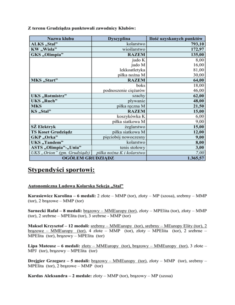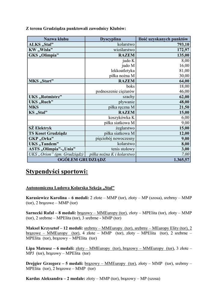 Z terenu Grudziądza punktowali zawodnicy Klubów: Nazwa klubu ALKS „Stal” KW „Wisła” GKS „Olimpia” Dyscyplina Ilość uzyskanych punktów kolarstwo 793,10 wioślarstwo 172,97 RAZEM 135,00 judo K 8,00 judo M 16,00 lekkoatletyka 81,00 piłka nożna M 30,00 MKS „Start” RAZEM 64,00 boks 18,00 podnoszenie ciężarów 46,00 szachy UKS „Rotmistrz” 62,00 pływanie UKS „Ruch” 48,00 piłka ręczna M MKS 21,50 KS „Stal” RAZEM 15,00 koszykówka K 6,00 piłka siatkowa M 9,00 żeglarstwo SŻ Elektryk 15,00 piłka siatkowa M TS Koset Grudziądz 12,00 pięciobój nowoczesny GKP „Orka” 9,00 kolarstwo UKS „Tandem” 8,00 tenis stołowy ASTS „Olimpia”-„Unia” 3,00 UKS „Orion” (gm. Grudziądz) piłka nożna K i kolarstwo 7,00 OGÓŁEM GRUDZIĄDZ 1.365,57 Stypendyści sportowi: Autonomiczna Ludowa Kolarska Sekcja „Stal” Karasiewicz Karolina – 6 medali: 2 złote – MMP (tor), złoty – MP (szosa), srebrny – MMP (tor), 2 brązowe – MMP (tor) Sarnecki Rafał – 8 medali: brązowy – MMEuropy (tor), złoty – MPElita (tor), złoty – MMP (tor), 2 srebrne – MPElita (tor), 3 srebrne - MMP (tor) Maksel Krzysztof – 12 medali: srebrny – MMEuropy (tor), srebrny – MEuropy Elity (tor), 2 brązowe – MMEuropy (tor), 4 złote – MMP (tor), złoty – MPElita (tor), 2 srebrne – MPElita (tor), brązowy – MPElita (tor) Lipa Mateusz – 6 medali: złoty – MMEuropy (tor), brązowy – MMEuropy (tor), 3 złote – MPJ (tor), brązowy – MPElita (tor) Drejgier Grzegorz – 5 medali: brązowy – MMEuropy (tor), złoty – MMP (tor), srebrny – MPElita (tor), 2 brązowe – MMP (tor) Kardas Aleksandra – 2 medale: złoty – MMP (tor), brązowy – MP (szosa) Karaś Patryk – 1 medal: złoty – OOMJM (tor) Sas Błażej – 1 medal: złoty – OOMJM (tor) Gąsiorowski Mariusz – 4 medale: złoty – OOMJM (tor), srebrny – OOMJM (tor), brązowy – OOMJM (tor), brązowy – OOM (szosa) Wasilewski Michał – 2 medale: złoty – OOMJM (tor), brązowy – OOMJM (tor) Łazarewicz Marek – 6 medali: 2 złote – MPJ (tor), 2 srebrne – MPJ (tor), brązowy – MPElita (tor), brązowy – MP (szosa), Klub Wioślarski „Wisła” Pabian Paweł – 2 medale: złoty – MMP, srebrny – MMP Fehlau Damian – 1 medal: złoty – Międzynarodowe MP Wieliczko Marta – 4 medale: złoty – MPJ, srebrny – MPJ, złoty – Międzynarodowe MP, srebrny – Długodystansowe MP Plutowska Marta – 1 medal: złoty – MMP Ignasiak Kamil – 2 medale: złoty – MPJ, srebrny – MPJ Behrendt Iga – 2 medale: złoty – MPJ, brązowy – MPJM Uczniowski Klub Sportowy „Ruch” Polewka Tomasz – 10 medali: złoty – OOM, 3 złote – MP, 2 srebrne – MP Seniorów i Młodzieżowców, srebrny – MP, srebrny – OOM, brązowy – OOM, brązowy – MP Centrum Rehabilitacji im. ks. Biskupa Jana Chrapka w Grudziądzu Gniadek Kamil – 3 medale: 2 złote – MPJ, srebrny – MPJ Lewandowski Wojciech – 1 medal: złoty – MPJiS Markuszewski Patryk – 2 medale: złoty – MPJiS, srebrny – MPJiS Lipowska Emilia – 1 medal: złoty – MPJiS Rybik Michał – 1 medal: złoty – MPJ Maliszewska Klaudia – 3 medale: brązowy – MŚJ IWAS, srebrny – MPON, brązowy – MPON Jasińska Natalia – 5 medali: złoty – MŚJ IWAS, srebrny – MŚJ IWAS, 3 złote – MPON Grudziądzki Klub Sportowy „Olimpia” Ziółkowski Oskar – 2 medale: złoty – OOM, srebrny – MPJiJM Meloch Arleta – 2 medale: złoty – MŚ IPC, srebrny – ME IPC Śleboda Piotr – 4 medale: złoty – MPS, srebrny – MP, srebrny – MP, brązowy – MPS Autonomiczna Sekcja Tenisa Stołowego „Olimpia”-„Unia” - zawodnicy klubu sportowego, którego I zespół w grach zespołowych brał udział w sezonie 2012/2013 w rozgrywkach szczebla centralnego, tj. superlidze mężczyzn tenisa stołowego Huang Sheng Sheng, Such Bartosz, Maćkowiak Wojciech, Szafranek Piotr, Kolarek Tomislav, Międzyszkolny Klub Sportowy MKS Szwejkowski Filip – 1 medal: złoty – OOM Prietz Tomasz – 1 medal: złoty – OOM NAGRODY FINANSOWE DLA ZAWODNIKÓW, TRENERÓW I DZIAŁACZY: Autonomiczna Ludowa Kolarska Sekcja „Stal” Patryk Mamoński – 1 medal: brązowy – MPJ Łukasz Klasiński – 1 medal: srebrny – MPJ Szymon Czmoch – 1 medal: srebrny – MPJ Lucjusz Kardaś – 1 medal: brązowy – MP Karolina Pizoń – 1 medal: srebrny – MP Agata Balcerek – 1 medal: brązowy – MP Karolina Kaczmarczyk – 1 medal: srebrny – MP Mateusz Mikulicz – 1 medal: złoty – MP Rafał Jeziorski – 1 medal: złoty - MP Michał Michciński – 1 medal: złoty - MP Kubiak Patryk – 2 medale: srebrny – MPJ, brązowy – MP Trenerzy: Adam Sieczkowski Roman Jagielski Tomasz Wieczorek Grzegorz Cywiński Waldemar Chyliński Dariusz Mikrut Ireneusz Sieczkowski Aleksander Zadykowicz Romuald Gajlewicz Edward Gospodarowicz Miejski Klub Sportowy „Start” Martin Kochański – 2 medale: VIII miejsce – MMEuropy do 23 lat, srebrny – MMP Maciejewski Krzysztof – 1 medal: brązowy – MPM Trener: Mariusz Sułecki Działacz: Krzysztof Chojnacki Klub Wioślarski „Wisła” Sebastian Kaczmarek – 1 medal: brązowy – MMP Karol Leszczyński – 2 medale: brązowy – MMP, brązowy – Akademickie MŚ Lipowska Dominika- 2 medale: srebrny – OOM, brązowy – OOM Katarzyna Malinowska – 3 medale: 2 srebrne – OOM, brązowy – MPJM Aleksandra Mioduszewska – 2 medale: srebrny – OOM, brązowy – OOM Paweł Lipowski – 1 medal: srebrny – OOM Martyna Pasterska – 1 medal: srebrny – OOM Paulina Pyrzewska – 2 medale: 2 srebrne – OOM Bartłomiej Grochowski – 1 medal: srebrny – OOM Nikola Gross – 1 medal: srebrny – OOM Igor Jęziorski – 1 medal: srebrny – OOM Michał Granica – 1 medal: srebrny – OOM Marta Galla – 2 medale: 2 srebrne – OOM Dorota Grzebińska – 2 medale: 2 srebrne – OOM Martyna Chojnowska – 1 medal: srebrny – OOM Mateusz Wilangowski – 3 medale: V miejs