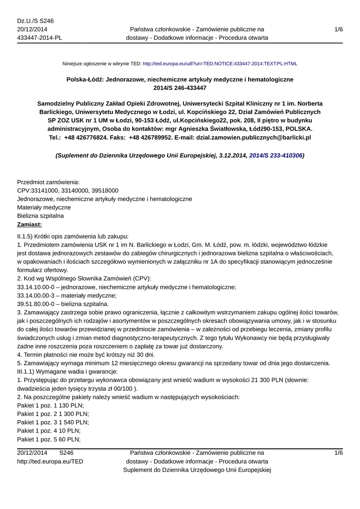Dz.U./S S246 20/12/2014 433447-2014-PL Państwa członkowskie - Zamówienie publiczne na dostawy - Dodatkowe informacje - Procedura otwarta 1/6 Niniejsze ogłoszenie w witrynie TED: http://ted.europa.eu/udl?uri=TED:NOTICE:433447-2014:TEXT:PL:HTML Polska-Łódź: Jednorazowe, niechemiczne artykuły medyczne i hematologiczne 2014/S 246-433447 Samodzielny Publiczny Zakład Opieki Zdrowotnej, Uniwersytecki Szpital Kliniczny nr 1 im. Norberta Barlickiego, Uniwersytetu Medycznego w Łodzi, ul. Kopcińskiego 22, Dział Zamówień Publicznych SP ZOZ USK nr 1 UM w Łodzi, 90-153 Łódź, ul.Kopcińskiego22, pok. 208, II piętro w budynku administracyjnym, Osoba do kontaktów: mgr Agnieszka Światłowska, Łódź90-153, POLSKA. Tel.: +48 426776824. Faks: +48 426789952. E-mail: [email protected] (Suplement do Dziennika Urzędowego Unii Europejskiej, 3.12.2014, 2014/S 233-410306) Przedmiot zamówienia: CPV:33141000, 33140000, 39518000 Jednorazowe, niechemiczne artykuły medyczne i hematologiczne Materiały medyczne Bielizna szpitalna Zamiast: II.1.5) Krótki opis zamówienia lub zakupu: 1. Przedmiotem zamówienia USK nr 1 im N. Barlickiego w Łodzi, Gm. M. Łódź, pow. m. łódzki, województwo łódzkie jest dostawa jednorazowych zestawów do zabiegów chirurgicznych i jednorazowa bielizna szpitalna o właściwościach, w opakowaniach i ilościach szczegółowo wymienionych w załączniku nr 1A do specyfikacji stanowiącym jednocześnie formularz ofertowy. 2. Kod wg Wspólnego Słownika Zamówień (CPV): 33.14.10.00-0 – jednorazowe, niechemiczne artykuły medyczne i hematologiczne; 33.14.00.00-3 – materiały medyczne; 39.51.80.00-0 – bielizna szpitalna. 3. Zamawiający zastrzega sobie prawo ograniczenia, łącznie z całkowitym wstrzymaniem zakupu ogólnej ilości towarów, jak i poszczególnych ich rodzajów i asortymentów w poszczególnych okresach obowiązywania umowy, jak i w stosunku do całej ilości towarów przewidzianej w przedmiocie zamówienia – w zależności od przebiegu leczenia, zmiany profilu świadczonych usług i zmian metod diagnostyczno-terapeutycznych. Z tego tytułu Wykonawcy nie będą przysługiwały żadne inne roszczenia poza roszczeniem o zapłatę za towar już dostarczony. 4. Termin płatności nie może być krótszy niż 30 dni. 5. Zamawiający wymaga minimum 12 miesięcznego okresu gwarancji na sprzedany towar od dnia jego dostarczenia. III.1.1) Wymagane wadia i gwarancje: 1. Przystępując do przetargu wykonawca obowiązany jest wnieść wadium w wysokości 21 300 PLN (słownie: dwadzieścia jeden tysięcy trzysta zł 00/100 ). 2. Na poszczególne pakiety należy wnieść wadium w następujących wysokościach: Pakiet 1 poz. 1 130 PLN; Pakiet 1 poz. 2 1 300 PLN; Pakiet 1 poz. 3 1 540 PLN; Pakiet 1 poz. 4 10 PLN; Pakiet 1 poz. 5 60 PLN; 20/12/2014 S246 http://ted.europa.eu/TED Państwa członkowskie - Zamówienie publiczne na dostawy - Dodatkowe informacje - Procedura otwarta Suplement do Dziennika Urzędowego Unii Europejskiej 1/6 Dz.U./S S246 20/12/2014 433447-2014-PL Państwa członkowskie - Zamówienie publiczne na dostawy - Dodatkowe informacje - Procedura otwarta 2/6 Pakiet 1 poz. 6 30 PLN; Pakiet 1 poz. 7 160 PLN; Pakiet 1 poz. 8 70 PLN; Pakiet 1 poz. 9 80 PLN; Pakiet 1 poz. 10 20 PLN; Pakiet 1 poz. 11 420 PLN; Pakiet 1 poz. 12 10 PLN; Pakiet 1 poz. 13 30 PLN; Pakiet 1 poz. 14 20 PLN; Pakiet 1 poz. 15 60 PLN; Pakiet 1 poz. 16 340 PLN; Pakiet 1 poz. 17 20 PLN; Pakiet 1 poz. 18 100 PLN; Pakiet 1 poz. 19 50 PLN; Pakiet 1 poz. 20 10 PLN; Pakiet 1 poz. 21 480 PLN; Pakiet 1 poz. 22 40 PLN; Pakiet 1 poz. 23 80 PLN; Pakiet 1 poz. 24 10 PLN; Pakiet 1 poz. 25 10 PLN; Pakiet 1 poz. 26 5 PLN; Pakiet 1 poz. 27 620 PLN; Pakiet 2 710 PLN; Pakiet 3 1 600 PLN; Pakiet 4 230 PLN; Pakiet 5 370 PLN; Pakiet 6 1 040 PLN; Pakiet 7 poz. 1 310 PLN; Pakiet 7 poz. 2 210 PLN; Pakiet 7 poz. 3 1 520 PLN; Pakiet 7 poz. 4 1 150 PLN; Pakiet 7 poz. 5 230 PLN; Pakiet 7 poz. 6 270 PLN; Pakiet 8 4 200 PLN; Pakiet 9 poz. 1 140 PLN; Pakiet 9 poz. 2 60 PLN; Pakiet 9 poz. 3 250 PLN; Pakiet 9 poz. 4 5 PLN; Pakiet 9 poz. 5 70 PLN; Pakiet 9 poz. 6 150 PLN; Pakiet 10 180 PLN; Pakiet 11 2 070 PLN; Pakiet 12 30 PLN; Pakiet 13 800 PLN. 3. Wadium w postaci pieniężnej należy wpłacać na konto: 20/12/2014 S246 http://ted.europa.eu/TED Państwa członkowskie - Zamówienie publiczne na dostawy - Dodatkowe informacje - Procedura otwarta Suplement do Dziennika Urzędowego Unii Europejskiej 2/6 Dz.U./S S246 20/12/2014 433447-2014-PL Państwa członkowskie - Zamówienie publiczne na dostawy - Dodatkowe informacje - Procedura otwarta 3/6 Kredyt Bank S.A. II o/Łódź nr: 94 1500 1546 1215 4002 8009 0000 „Wadium – dostawa jednorazowych zestawów do zabiegów chirurgicznych i jednorazowej bielizny szpitalnej 37/ZP/2014 w terminie do dnia 9.1.2015 r. do godz. 9:00 – a kopię dowodu wpłaty dołączyć do oferty. 4. Wadium może być wniesione zgodnie z art. 45 ust. 6 ustawy Prawo zamówień publicznych w jednej lub kilku następujących formach: 3.1 w pieniądzu – (przelew), 3.2 w poręczeniach bankowych – (oryginał dołączony do oferty), 3.3 w poręczeniach pieniężnych spółdzielczej kasy oszczędnościowo-kredytowej – (oryginał dołączony do oferty), 3.4 w gwarancjach bankowych – (oryginał dołączony do oferty), 3.5 w gwarancjach ubezpieczeniowych – (oryginał dołączony do oferty), 3.6 w poręczeniach udzielanych przez podmioty, o których mowa w art. 6b ust. 5 pkt. 2 ustawy z dn. 9.11.2000 r. o utworzeniu Polskiej Agencji Rozwoju Przedsiębiorczości (Dz. U. z 2007r. Nr 42, poz. 275) – (oryginał dołączony do oferty). 5. Niedopuszczalne jest wniesienie wadium w formie pieniężnej w kasie Zamawiającego. 6. Za termin wniesienia wadium uważa się dzień i godzinę wpływu środków na konto Zamawiającego lub złożenie oryginału gwarancji czy poręczenia do Zamawiającego – dołączone do oferty. 7. Wykonawca przedstawia potwierdzenie wniesienia wadium w ofercie. 8. Zar