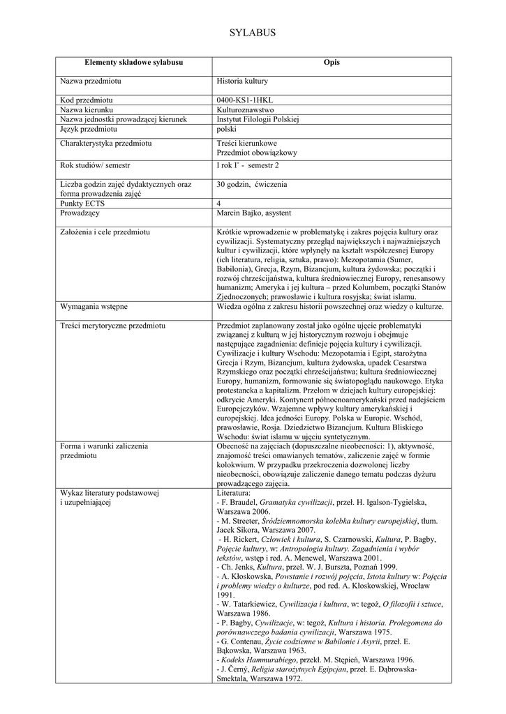 SYLABUS Elementy składowe sylabusu Opis Nazwa przedmiotu Historia kultury Kod przedmiotu Nazwa kierunku Nazwa jednostki prowadzącej kierunek Język przedmiotu 0400-KS1-1HKL Kulturoznawstwo Instytut Filologii Polskiej polski Charakterystyka przedmiotu Treści kierunkowe Przedmiot obowiązkowy Rok studiów/ semestr I rok I˚ - semestr 2 Liczba godzin zajęć dydaktycznych oraz forma prowadzenia zajęć Punkty ECTS Prowadzący 30 godzin, ćwiczenia Założenia i cele przedmiotu Krótkie wprowadzenie w problematykę i zakres pojęcia kultury oraz cywilizacji. Systematyczny przegląd największych i najważniejszych kultur i cywilizacji, które wpłynęły na kształt współczesnej Europy (ich literatura, religia, sztuka, prawo): Mezopotamia (Sumer, Babilonia), Grecja, Rzym, Bizancjum, kultura żydowska; początki i rozwój chrześcijaństwa, kultura średniowiecznej Europy, renesansowy humanizm; Ameryka i jej kultura – przed Kolumbem, początki Stanów Zjednoczonych; prawosławie i kultura rosyjska; świat islamu. Wiedza ogólna z zakresu historii powszechnej oraz wiedzy o kulturze. Wymagania wstępne Treści merytoryczne przedmiotu Forma i warunki zaliczenia przedmiotu Wykaz literatury podstawowej i uzupełniającej 4 Marcin Bajko, asystent Przedmiot zaplanowany został jako ogólne ujęcie problematyki związanej z kulturą w jej historycznym rozwoju i obejmuje następujące zagadnienia: definicje pojęcia kultury i cywilizacji. Cywilizacje i kultury Wschodu: Mezopotamia i Egipt, starożytna Grecja i Rzym, Bizancjum, kultura żydowska, upadek Cesarstwa Rzymskiego oraz początki chrześcijaństwa; kultura średniowiecznej Europy, humanizm, formowanie się światopoglądu naukowego. Etyka protestancka a kapitalizm. Przełom w dziejach kultury europejskiej: odkrycie Ameryki. Kontynent północnoamerykański przed nadejściem Europejczyków. Wzajemne wpływy kultury amerykańskiej i europejskiej. Idea jedności Europy. Polska w Europie. Wschód, prawosławie, Rosja. Dziedzictwo Bizancjum. Kultura Bliskiego Wschodu: świat islamu w ujęciu syntetycznym. Obecność na zajęciach (dopuszczalne nieobecności: 1), aktywność, znajomość treści omawianych tematów, zaliczenie zajęć w formie kolokwium. W przypadku przekroczenia dozwolonej liczby nieobecności, obowiązuje zaliczenie danego tematu podczas dyżuru prowadzącego zajęcia. Literatura: - F. Braudel, Gramatyka cywilizacji, przeł. H. Igalson-Tygielska, Warszawa 2006. - M. Streeter, Śródziemnomorska kolebka kultury europejskiej, tłum. Jacek Sikora, Warszawa 2007. - H. Rickert, Człowiek i kultura, S. Czarnowski, Kultura, P. Bagby, Pojęcie kultury, w: Antropologia kultury. Zagadnienia i wybór tekstów, wstęp i red. A. Mencwel, Warszawa 2001. - Ch. Jenks, Kultura, przeł. W. J. Burszta, Poznań 1999. - A. Kłoskowska, Powstanie i rozwój pojęcia, Istota kultury w: Pojęcia i problemy wiedzy o kulturze, pod red. A. Kłoskowskiej, Wrocław 1991. - W. Tatarkiewicz, Cywilizacja i kultura, w: tegoż, O filozofii i sztuce, Warszawa 1986. - P. Bagby, Cywilizacje, w: tegoż, Kultura i historia. Prolegomena do porównawczego badania cywilizacji, Warszawa 1975. - G. Contenau, Życie codzienne w Babilonie i Asyrii, przeł. E. Bąkowska, Warszawa 1963. - Kodeks Hammurabiego, przekł. M. Stępień, Warszawa 1996. - J. Černý, Religia starożytnych Egipcjan, przeł. E. DąbrowskaSmektala, Warszawa 1972. - K. Kumaniecki, Historia kultury starożytnej Grecji i Rzymu, Warszawa 1975. - Słownik kultury greckiej, red. L. Winniczuk, Warszawa 1988. - M. Eliade, I. P. Couliano, Słownik religii, tłum. A. Kuryś, Warszawa 1994. - R. Calasso, Zaślubiny Kadmosa z Harmonią, przeł. S. Kasprzysiak, wprowadzenie J. Brodski, Warszawa 2010. - E. Ozorowski, Rzym i Konstantynopol jako modele kultury europejskiej, w: Chrześcijańskie dziedzictwo duchowe narodów słowiańskich, pod red. Z. Abramowicz i J. Ławskiego, tom II, Białystok 2010. - H.W. Haussig, Historia kultury bizantyjskiej, przeł. T. Zabłudowski, Warszawa 1969. - A. Komnena, Aleksjada, tom I, przełożył, wstępem i przypisami opatrzył O. Jurewicz, Wrocław 2005. - A. Unterman, Żydzi. Wiara i życie, przeł. J. Zabierowski, Łódź 1989. - M. Grant, Dzieje dawnego Izraela, przeł. J. Schwakopf, Warszawa 1991. - E. Lewandowski, Charakter narodowy Polaków i innych, Warszawa 2008. - P. Chuvin, Ostatni poganie. Zanik wierzeń pogańskich w cesarstwie rzymskim od panowania Konstantyna do Justyniana, przeł. J. Stankiewicz-Prądzyńska, Warszawa 2008. - M. Simon, Cywilizacja wczesnego chrześcijaństwa, Warszawa 1979. - M. Banniard, Geneza kultury europejskiej V-VIII w., przeł. A. Kuryś, Warszawa 1995. - J. Huizinga, Jesień średniowiecza, przekł. T. Brzostowski, Warszawa 1974. - M. Ossowska, Ethos rycerski i jego odmiany, Warszawa 1973. - U. Eco, Sztuka i piękno w średniowieczu, przeł. M. Olszewski, M. Zabłocka, Warszawa 2006. - Literatura Europy. Historia literatury europejskiej, pod red. A. Benoit-Dusausoy i G. Fontaine’a, Gdańsk 2009. - M. Weber, Etyka protestancka a duch kapitalizmu, przeł. B. Baran, J. Miziński, Warszawa 2010. - M. Gołębiowski, Dzieje kultury Stanów Zjednoczonych, Warszawa 2005. - L. Leciejewicz, Rodowód historyczny kultury polskiej – najstarsze źródła, w: Uniwersalizm i swoistość kultury polskiej, pod red. J. Kłoczkowskiego, t. 1, Lublin 1989. - J. Parandowski, Polska leży nad Morzem Śródziemnym, J. Chałasiński, Polska leży w Europie w: Polskie wizje Europy w XIX i XX wieku, wyboru dokonał P. O. Loew, Wrocław 2004. - J. H. Billington, Ikona i topór. Historia kultury rosyjskiej, przeł. J. Hunia, Kraków 2008. - J. Łotman, Rosja i znaki. Kultura szlachecka w wieku XVIII i na początku XIX, przekład i posłowie B. Żyłko, Gdańsk 1999. - K. Armstrong, Krótka historia islamu, tłum. J. Włodarczyk, Wrocław 2004. - M. Dziekan, Dzieje kultury arabskiej, Warszawa 2008. - J. Danecki, Co zawdzięczamy islamowi, „Znak” 1998, nr 512