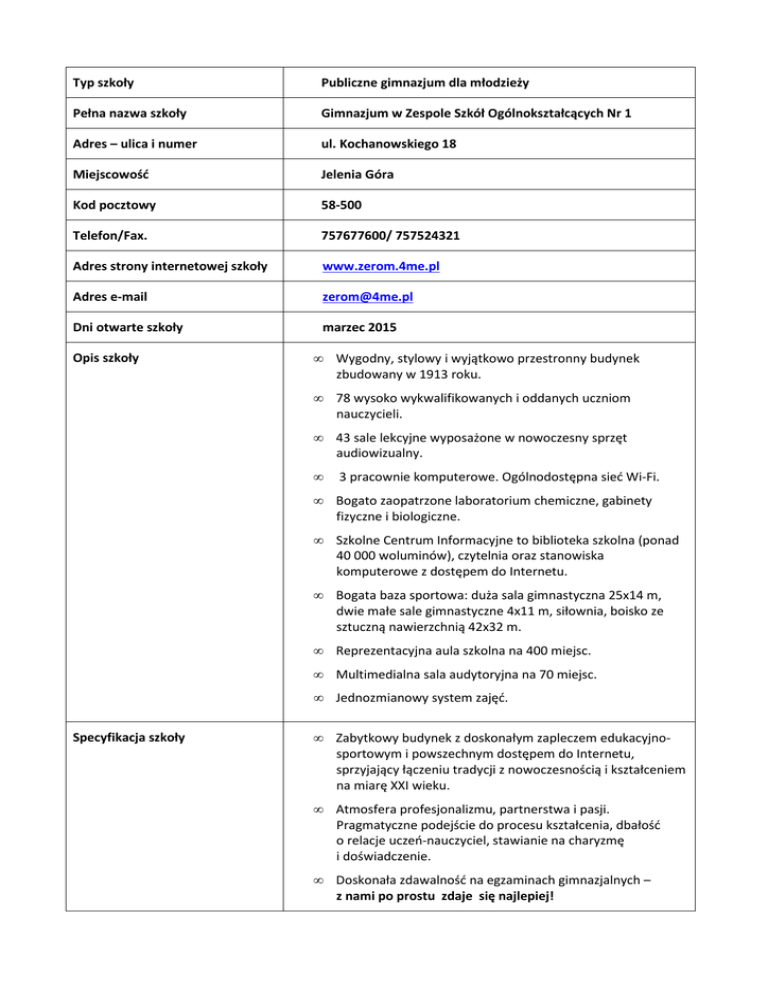 Typ szkoły Publiczne gimnazjum dla młodzieży Pełna nazwa szkoły Gimnazjum w Zespole Szkół Ogólnokształcących Nr 1 Adres – ulica i numer ul. Kochanowskiego 18 Miejscowość Jelenia Góra Kod pocztowy 58-500 Telefon/Fax. 757677600/ 757524321 Adres strony internetowej szkoły www.zerom.4me.pl Adres e-mail [email protected] Dni otwarte szkoły marzec 2015 Opis szkoły Specyfikacja szkoły • Wygodny, stylowy i wyjątkowo przestronny budynek zbudowany w 1913 roku. • 78 wysoko wykwalifikowanych i oddanych uczniom nauczycieli. • 43 sale lekcyjne wyposażone w nowoczesny sprzęt audiowizualny. • 3 pracownie komputerowe. Ogólnodostępna sieć Wi-Fi. • Bogato zaopatrzone laboratorium chemiczne, gabinety fizyczne i biologiczne. • Szkolne Centrum Informacyjne to biblioteka szkolna (ponad 40 000 woluminów), czytelnia oraz stanowiska komputerowe z dostępem do Internetu. • Bogata baza sportowa: duża sala gimnastyczna 25x14 m, dwie małe sale gimnastyczne 4x11 m, siłownia, boisko ze sztuczną nawierzchnią 42x32 m. • Reprezentacyjna aula szkolna na 400 miejsc. • Multimedialna sala audytoryjna na 70 miejsc. • Jednozmianowy system zajęć. • Zabytkowy budynek z doskonałym zapleczem edukacyjnosportowym i powszechnym dostępem do Internetu, sprzyjający łączeniu tradycji z nowoczesnością i kształceniem na miarę XXI wieku. • Atmosfera profesjonalizmu, partnerstwa i pasji. Pragmatyczne podejście do procesu kształcenia, dbałość o relacje uczeń-nauczyciel, stawianie na charyzmę i doświadczenie. • Doskonała zdawalność na egzaminach gimnazjalnych – z nami po prostu zdaje się najlepiej! • Wysoko wykwalifikowana kadra nauczycielska. Większość z nas to nauczyciele dyplomowani z uprawnieniami egzaminatorów. Poza wiedzą i doświadczeniem, cechuje nas entuzjazm i zaangażowanie, które wkładamy w przygotowanie oraz prowadzenie wszystkich zajęć. • W największym tego słowa znaczeniu indywidualizacja nauczania! Rozwijamy pasje, wychodzimy naprzeciw młodym, pomagamy się uczyć i wyrównujemy szanse edukacyjne. • Finansowo wspieramy i nagradzamy uczniów wybitnych corocznymi stypendiami fundowanymi przez Radę Rodziców, pomagamy także uczniom z trudnościami materialnymi – stypendia socjalne. • Mamy jasny i klarowny system oceniania. Naszym priorytetem jest ocenianie kształtujące: u nas zawsze uzyskasz informację zwrotną, jakie są Twoje mocne strony, a nad czym i w jaki sposób powinieneś pracować. • Nasi uczniowie mogą swobodnie wybierać z całej gamy zajęć dodatkowych, uzupełniających oraz warsztatów i kół zainteresowań. • Utrzymujemy stały kontakt z uczniami i rodzicami poprzez dziennik elektroniczny, jesteśmy również do Waszej dyspozycji w każdy ostatni czwartek miesiąca, od godz. 17:00. • Jesteśmy blisko! Szkoła znajduje się w bardzo dogodnej lokalizacji blisko centrum miasta, nieopodal dworca PKP i przystanków MZK. • Z pasją uczymy języków obcych: angielskiego, niemieckiego, francuskiego, rosyjskiego. Od klasy drugiej niektóre przedmioty są nauczane w języku obcym. Oprócz lekcji, uczniowie mają okazję poznać kulturę danego kraju, np. w ramach organizowanych cyklicznie Dni Krajów Frankofońskich, uczniowskiej wymiany międzynarodowej (zajęcia za granicą), wycieczek zagranicznych czy też spotkań ze studentami AISEC. • W naszej szkole stałą praktyką są atrakcyjne zagraniczne wycieczki edukacyjne na Wyspy Brytyjskie do: Anglii, Szkocji czy Walii oraz do krajów francuskojęzycznych: Francji, Belgii i Luksemburga. • Organizujemy liczne obozy naukowe, w tym – astronomiczne, matematyczne, ekologiczne, przyrodnicze, geograficzne. • Mamy wyjątkowo prężnie działający Samorząd Uczniowski, posiadający własne pomieszczenie tzw. AKWARIUM, złożony z młodych społeczników i pasjonatów działań obywatelskich. • Absolwenci naszej szkoły bez żadnych problemów dostają się do wybranych szkół ponadgimnazjalnych. • Jesteśmy najlepsi w ogólnopolskich rankingach! Nasze gimnazjum znajduje się w czołówce szkół dolnośląskich i krajowych! Z nami możesz realizować swoje marzenia i zostać: mistrzem autoprezentacji i wystąpień publicznych, młodym historykiem i kulturoznawcą, mistrzem rachunków, mistrzem klawiatury, poliglotą, artystą, gwiazdą estrady, mistrzem sportu, odkryjesz tajniki nauki, techniki i przyrody. A w czasie wolnym: będziesz mógł skorzystać ze Szkolnego Centrum Informacyjnego – biblioteki i czytelni w jednym, pogawędzić z pedagogiem szkolnym, „uwolnić książkę” podyskutować z koleżankami i kolegami w Akwarium, wybrać coś smacznego z bogatego menu naszego szkolnego Bistro. Misja szkoły Jesteśmy szkołą z charyzmą, doświadczeniem i pasją. Stawiamy na wiedzę i rozwój. Łączenie tradycji z postępem to nasze motto, nauki wyciągamy z przeszłości, a jednocześnie kształcimy młodego człowieka świadomie, z wykorzystaniem metod interaktywnych i aktywizujących, na miarę potrzeb XXI wieku. W naszej szkole uczeń to partner. Skłanianie go do zastanowienia nad dokonywanymi wyborami, budowanie tożsamości narodowej i lokalnej, wspomaganie rozwoju wiedzy, umiejętności, wskazywanie na powiązania między poszczególnymi dziedzinami nauki i kultury – tym kierujemy się na co dzień. „Żeromszczaki” – bo tak powszechnie określa się naszych uczniów i absolwentów, podstawę programową znają od deski do deski. W procesie dydaktycznym i wychowawczym bezwzględnie wdrażamy treści w niej zawarte, a efekty takich działań odzwierciedlają wyniki ocenianych zewnętrznie egzaminów gimnazjalnych. Z drugiej strony, sprawą priorytetową jest dla nas indywidualizacja kształcenia, rozbudzanie zainteresowań i pomoc w znalezieniu własnych sposobów samorealizacji. Nasi nauczyciele to specjaliści świetnie przygotowani do swej pracy merytorycznie (wiedzą, czego uczyć) i metodycznie (stosują nowoczesne i zróżn
