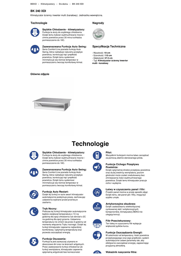 BEKO › Klimatyzatory › Do domu › BK 240 XDI BK 240 XDI Klimatyzator ścienny inwerter multi (kanałowy). Jednostka wewnętrzna. Technologie Nagrody Szybkie Chłodzenie - klimatyzatory: Funkcja ta służy do szybkiego chłodzenia. Dzięki temu trybowi wydmuchiwane mocne i zimne powietrze przez 30 minut ochładza pomieszczenie do 18C. Zaawansowana Funkcja Auto Swing: Seria Comfort Line posiada funkcję Auto Swing, która naśladuje naturalny przepływ powietrza, kontrolując kąt i prędkość powietrza. Dzięki temu systemowi minimalizuje się różnice temperatur w pomieszczeniu tworząc komfortowy klimat. Specyfikacja Techniczna › Wysokość: 19 cm › Szerokość: 110 cm › Głębokość: 57.5 cm › Typ: Klimatyzator ścienny inwerter multi - kanałowy Główne zdjęcie Technologie Szybkie Chłodzenie - klimatyzatory: Funkcja ta służy do szybkiego chłodzenia. Dzięki temu trybowi wydmuchiwane mocne i zimne powietrze przez 30 minut ochładza pomieszczenie do 18C. Zaawansowana Funkcja Auto Swing: Seria Comfort Line posiada funkcję Auto Swing, która naśladuje naturalny przepływ powietrza, kontrolując kąt i prędkość powietrza. Dzięki temu systemowi minimalizuje się różnice temperatur w pomieszczeniu tworząc komfortowy klimat. Funkcja Auto Restart: Dzięki tej funkcji w razie awarii klimatyzator automatycznie podejmuje pracę, zachowując ustawienia wybrane przed przerwą w zasilaniu. Tryb Nocny: Podczas tej funkcji klimatyzator automatycznie będzie zwiększał temperaturę o 1C na godzinę dla opcji chłodzenia lub obniżał o 2C na godzinę dla opcji grzania. Ustawiona temperatura nie zmieni się przez 2 godziny od momentu włączenia Trybu nocnego. Dzięki tej funkcji klimatyzator zapewnia najbardziej komfortową i optymalną temperaturę oraz pozwala oszczędzać energię. Funkcja Osuszania: Funkcja ta jest zazwyczaj używana w deszczowe dni oraz na terenach wilgotnych. Przez zastosowanie funkcji chłodzenia lub funkcji wentylatora, klimatyzator zapewnia optymalną wilgotność bez konieczności Pilot: Wszystkimi funkcjami można łatwo zarządzać za pomocą zdalnie sterowanego pilota. Funkcja Cichego Przepływu Powietrza: Dzięki optymalnej drodze przepływu powietrza oraz dużej średnicy wentylatora, poziom głośności może zostać zredukowany bez zmniejszania ilości wydmuchiwanego powietrza. Dzięki temu klimatyzator pracuje cicho i wydajnie. Łatwy w czyszczeniu panel i filtr: Przedni panel można w prosty sposób zdjąć. Dzięki temu, tak panel jak i filtry, mogą być szybko umyte. Antykorozyjna obudowa: Dzięki zastosowaniu elektrolitycznej cynkowanej stali i antykorozyjnych komponentów, klimatyzatory BEKO nie ulegają korozji. Filtr Przeciwkurzowy: Ten łatwy w czyszczeniu filtr wyłapuje większość pyłków kurzu. Funkcja Oszczędzania Energii: W zależności od temperatury, ilości powietrza przepływającego oraz jego prędkości, system automatycznie ustawi parametry tak, aby efektywnie oszczędzać energię, zapewniając przyjazną atmosferę. Wskaźnik nasycenia filtra: Wskaźnik nasycenia filtra: zmiany temperatury pokojowej. Wskaźnik nasycenia filtra, pokazuje kiedy powinien on zostać wymieniony. Timer: Dzięki tej funkcji jest możliwe zaprogramowanie klimatyzatora tak, aby wyłączył się w momencie kiedy go nie potrzebujesz, oszczędzając energię. Można też zaprogramować go tak, aby włączył się tuż przed Twoim przyjściem do domu, pozwalając cieszyć się z chłodnego pomieszczenia w upalne dni. Auto Diagnoza i Auto Ochrona: Dzięki tej funkcji wszystkie błędy zostaną wychwycone przez mikrokomputer oraz wyświetlona na wyświetlaczu klimatyzatora. Następnie automatycznie włączy się funkcja Auto Ochrony. Hot Start: Podczas trybu grzania prędkość wentylatora jest kontrolowana w zależności od wyparowywanej temperatury. Klimatyzator zaczyna działać w momencie kiedy wyparowywana temperatura jest dostatecznie ciepła tak, by nie dmuchać zimnym powietrzem. Opis produktu Specyfikacja techniczna Model: BK 240 XDI Wydajność Chłodzenie: 7030 Btu/h Chłodzenie: 26400 W Grzanie: 7740 Btu/h Grzanie: W Specyfikacja Elektryczna Pobór mocy - Chłodzenie: -W Pobór mocy - Grzanie: -W Natężenie - Chłodzenie: -A Natężenie - Grzanie: Pompa ciepła A Typ Grzania: 220-240/ 50 Napięcie/Częstotliwość: V/Hz Parametry Klasa Energetyczna - Chłodzenie: - Klasa energetyczna - Grzanie: - Efektywność energetyczna - Chłodzenie: - W/W Efektywność energetyczna - Grzanie: 32 W/W Poziom hałasu Nie J. wewn. (mała prędkość): - dB Poziom hałasu Nie J. zewn. (mała prędkość): Tak dB Funkcja osuszania: 2,5 Zdolność osuszania: 6,35 l/h Przyłącza rur - Ciecz: 12,7 mm Przyłącza rur - Gaz: mm Funkcje Czynnik chłodniczy: - Liczba jednostek wewnętrznych: Nie System oczyszczania powietrza Activion: Nie Aktywny filtr węglowy: Tak Filtr przeciwbakteryjny: Nie Automatyczne oczyszczanie: Tak Szybkie chłodzenie: Nie Szybkie grzanie: Nie Zaawansowana funkcja Auto Swing: - Automatyczny nawiew góra-dół: - Automatyczny nawiew w lewo-prawo: Nie Automatyczna zmiana trybu pracy: Tak Hotstart: Nie Antykorozyjna obudowa: Tak Automatyczny restart: Tak Funkcja oszczędzania energii: Nie Tryb minimalnego zużycia energii: Tak Tryb nocny: Tak Timer: Nie Cyfrowy wyświetlacz: Nie Bezprzewodowy pilot: Tak Automatyczna kontrola temperatury: - Typ kompresora: Nie Funkcja odszraniania: 3 Prędkości wentylatora: Wymiary Jednostka wewnętrzna (SZxWxG): 1100x190x575 mm Jednostka zewnętrzna (SZxWxG): mm Waga Jednostka wewnętrzna: - kg Jednostka zewnętrzna: kg Informacje produktowe zawarte na stronie internetowej mają charakter poglądowy i mogą odbiegać od rzeczywistości