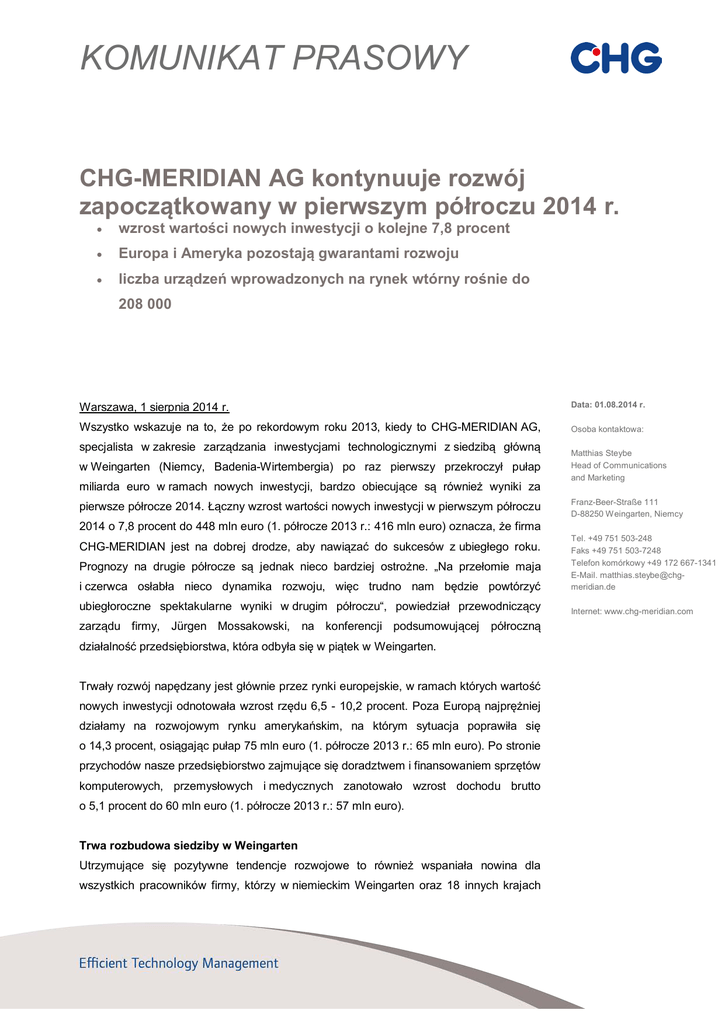 KOMUNIKAT PRASOWY CHG-MERIDIAN AG kontynuuje rozwój zapoczątkowany w pierwszym półroczu 2014 r. • wzrost wartości nowych inwestycji o kolejne 7,8 procent • Europa i Ameryka pozostają gwarantami rozwoju • liczba urządzeń wprowadzonych na rynek wtórny rośnie do 208 000 Warszawa, 1 sierpnia 2014 r. Data: 01.08.2014 r. Wszystko wskazuje na to, że po rekordowym roku 2013, kiedy to CHG-MERIDIAN AG, Osoba kontaktowa: specjalista w zakresie zarządzania inwestycjami technologicznymi z siedzibą główną w Weingarten (Niemcy, Badenia-Wirtembergia) po raz pierwszy przekroczył pułap miliarda euro w ramach nowych inwestycji, bardzo obiecujące są również wyniki za pierwsze półrocze 2014. Łączny wzrost wartości nowych inwestycji w pierwszym półroczu 2014 o 7,8 procent do 448 mln euro (1. półrocze 2013 r.: 416 mln euro) oznacza, że firma Matthias Steybe Head of Communications and Marketing Franz-Beer-Straße 111 D-88250 Weingarten, Niemcy i czerwca osłabła nieco dynamika rozwoju, więc trudno nam będzie powtórzyć Tel. +49 751 503-248 Faks +49 751 503-7248 Telefon komórkowy +49 172 667-1341 E-Mail. [email protected] ubiegłoroczne spektakularne wyniki w drugim półroczu“, powiedział przewodniczący Internet: www.chg-meridian.com CHG-MERIDIAN jest na dobrej drodze, aby nawiązać do sukcesów z ubiegłego roku. Prognozy na drugie półrocze są jednak nieco bardziej ostrożne. „Na przełomie maja zarządu firmy, Jürgen Mossakowski, na konferencji podsumowującej półroczną działalność przedsiębiorstwa, która odbyła się w piątek w Weingarten. Trwały rozwój napędzany jest głównie przez rynki europejskie, w ramach których wartość nowych inwestycji odnotowała wzrost rzędu 6,5 - 10,2 procent. Poza Europą najprężniej działamy na rozwojowym rynku amerykańskim, na którym sytuacja poprawiła się o 14,3 procent, osiągając pułap 75 mln euro (1. półrocze 2013 r.: 65 mln euro). Po stronie przychodów nasze przedsiębiorstwo zajmujące się doradztwem i finansowaniem sprzętów komputerowych, przemysłowych i medycznych zanotowało wzrost dochodu brutto o 5,1 procent do 60 mln euro (1. półrocze 2013 r.: 57 mln euro). Trwa rozbudowa siedziby w Weingarten Utrzymujące się pozytywne tendencje rozwojowe to również wspaniała nowina dla wszystkich pracowników firmy, którzy w niemieckim Weingarten oraz 18 innych krajach Seite 2 von 3 · obsługują ponad 8000 klientów w ramach ponad 60 000 umów użytkowania. Firma CHG-MERIDIAN oferuje ponad 800 atrakcyjnych miejsc pracy na całym świecie. Aby utrzymać ten stan rzeczy, podejmujemy się szeroko zakrojonych inwestycji, między innymi w Weingarten. Siedziba firmy zyska w wyniku rozbudowy łączną powierzchnię ponad 5000 metrów kwadratowych, co zapewni dostateczną przestrzeń dla przyszłego rozwoju. Obok przestronnych pomieszczeń biurowych powstaje tam również klub fitness oraz rozbudowana stołówka, które mają sprawić, aby zatrudnionych 270 pracowników „było w pełni zadowolonych ze swojego miejsca pracy”, mówi Mossakowski. Nieprzerwany wzrost znaczenia usług w zakresie technologii komputerowych Dzięki inwestycji w siedzibę firmy w Weingarten oraz światowej strategii rozwoju firma CHG-MERIDIAN jest doskonale przygotowana do aktywnego współudziału w kreowaniu zmian na rynkach finansowania i leasingu. Tendencje, takie jak obniżenie wartości tradycyjnych komputerów stacjonarnych na rzecz mniejszych urządzeń, czy też ciągły spadek cen na rynku technologii komputerowych, na którym od lat panuje silna konkurencja, już od dawna są dla firmy CHG-MERIDIAN motorem do rozwoju innowacyjności. CHG-MERIDIAN od lat wykracza poza działalność związaną jedynie z finansowaniem inwestycji: doskonałe uzupełnienie stanowią tutaj zwłaszcza usługi w zakresie technicznego i handlowego wsparcia inwestycji klientów, umożliwiające realizację naszych aspiracji w ramach coraz bardziej inteligentnego zarządzania cyklem życia sprzętu IT. „Naszym celem jest oferować naszym klientom jeszcze wydajniejszą realizację inwestycji technologicznych, od samego początku do samego końca. Oznacza to między innymi, że opracowujemy w tym celu specjalistyczne koncepcje dla firm, a następnie nieprzerwanie im towarzyszymy, zapewniając przejrzystość wszelkich procesów handlowych, a po zakończeniu użytkowania sprzętów komputerowych z zyskiem wprowadzamy je na globalny rynek wtórny w procesie profesjonalnego remarketingu", objaśnia Mossakowski. Firma CHG-MERIDIAN poczyniła kolejne inwestycje w swoje portfolio usług zwłaszcza w zakresie koncepcji użytkowania sprzętu komputerowego: nowością jest przykładowo zorientowane na procesy oprogramowanie, pozwalające na kontrolę zużycia przez sprzęt komputerowy materiałów według stanowisk kosztów. Przyszłościowa okazuje się również działalność związana z bezpiecznym usuwaniem danych z komputerów stacjonarnych, notebooków i innych urządzeń przenośnych: w największym centrum regeneracji sprzętu komputerowego w Europie – we własnym centrum technologii i usług CHG-MERIDIAN niedaleko Frankfurtu – w pierwszym półroczu 2014 r. do sprzedaży na rynku wtórnym przygotowanych zostało ponad 208 000 urządzeń. Dodatkowo, w ramach procedur posiadających certyfikaty TÜV oraz DEKRA, bezpiecznie usunięto poufne dane firmowe z 40 000 używanych urządzeń. Seite 3 von 3 · WSKAŹNIKI FINANSOWE CHG-MERIDIAN AG – PÓŁROCZNY BILANS (30.06.2014 R.) w TYS. EUR Wartość nowych inwestycji, Grupa wg regionów: Europa Centralna (D, A, CH) Europa Zachodnia Europa Południowa Europa Wschodnia Ameryki w kraju (Niemcy) za granicą wartość nowych inwestycji w ramach współpracy z nowymi klientami Dochód brutto*/wkład na pokrycie kosztów grupa 30.06.2014 448 195 30.06.2013 415 948 2013 1 005 725 242 823 68 077 51 425 11 022 74 848 228 963 219 232 228 074 61 768 46 745 13 884 65 477 213 875 202 073 506 758 